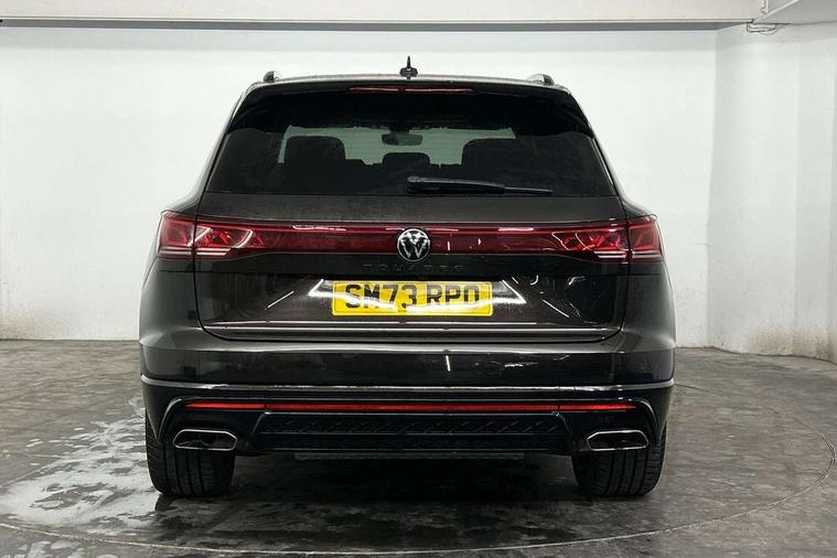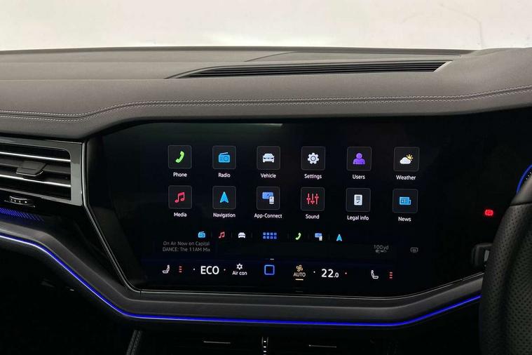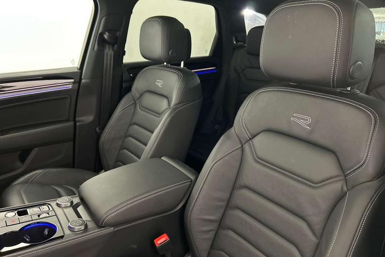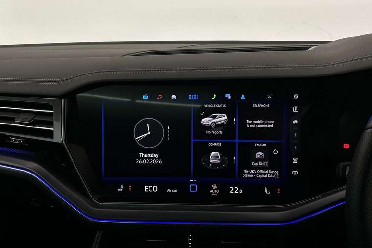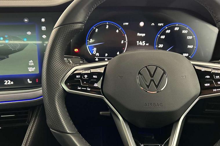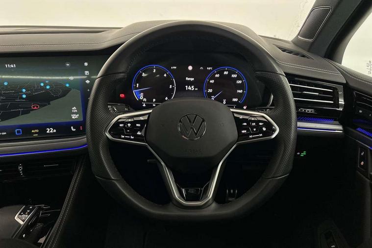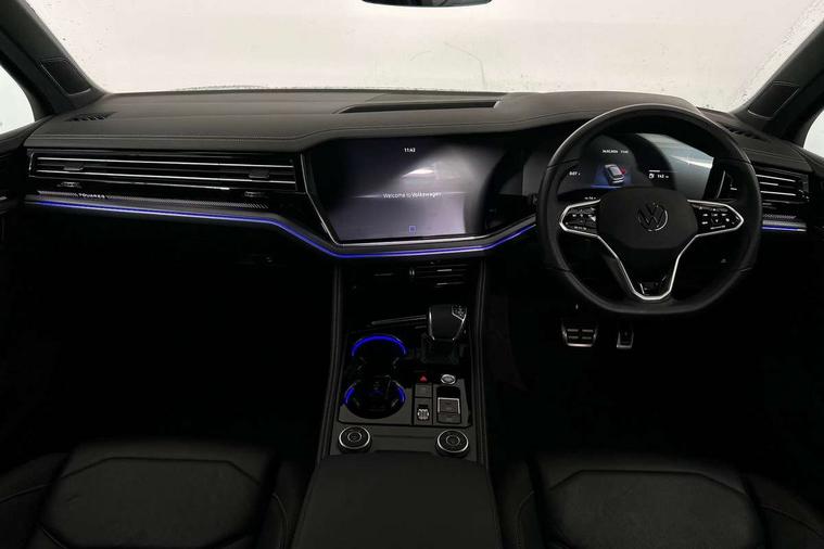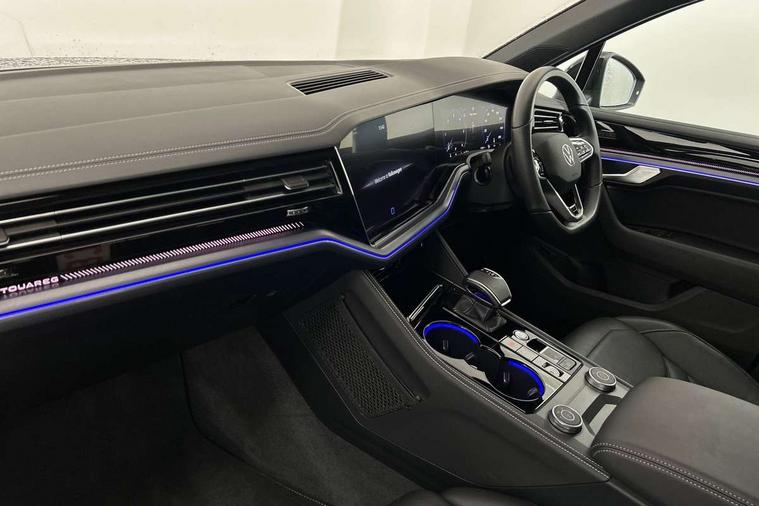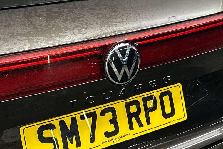 15" Screen Top infotainment system Premium (MIB3), Adaptive cruise control, Advanced driver attention and drowsiness monitor, Driver profile selection, Dynamic road sign display, E-Sim card for online connectivity, eCall emergency system, Innovision cockpit, Intelligent park assist, Mobile phone interface with inductive charging, Multi-colour Active Info display, Park Assist - Sensor controlled steering aid to assist parallel or bay parking, PAS, Warning signal and warning light for front and rear seatbelts not fastened, Wireless app connect, Adaptive chassis control, DAB Digital radio, Diversity antenna for AM/ FM reception, We Connect and We Connect Plus functionality, Automatic coming/leaving home lighting function, Automatic headlights, Black door mirrors, Black style comfort bumpers, Dynamic headlight range control with dynamic cornering light, Electric front tilt/slide panoramic sunroof and fixed rear sunroof, Electrically power adjustable, heated, folding, auto dimming, front passenger exterior door mirror lowering function, External USB type C socket and charging sockets, Gloss black roof rails, HD LED Matrix beam plus digital headlight projection with variable light distribution, Headlight washers, Heat insulating darkened glass in side and rear windows, Heated windscreen washer jets, Highway light, LED 3rd brake light, LED daytime running lights, LED rear combination lamp with variable lighting functions and special styling, Poor weather light, Rain sensor, Rear exhaust tailpipe, Rear fog light with back up light on both sides, Rear light bar and illuminated logo, Rear side wing doors, Rear wiper, Stainless steel door sill protection, 12V socket in centre console, 3 rear headrests, 3 seat bench in 2nd row, 4 zone climate control, Airbag label on sun visor and B-pillar, Brushed stainless steel pedals, Double sun visors with illuminated vanity mirrors, Front + rear carpet mats, Front centre armrest, Leather wrapped multifunction sports steering wheel, heated, with touch control and shift paddles, Mechanical rear seat release, Power adjustable lumbar support in front, Power seats in front, right side with memory features and seat cushion depth adjustment, Rear seat backrest and split folding with center armrest, Single front passenger seat, Tool kit, Memory pack plus - Touareg, 3 point seatbelts, outer rear with ECE lable, ABS, Child locks on rear doors, Curtain airbags, Driver and front passenger safety-optimised head restraints, Driver/Front Passenger airbags, Extended pedestrian protection measures, Front assist, Front seat side impact airbags, Generative braking with start and stop system, Height adjustable 3 point front seatbelts with pre tensioners, Passenger airbag deactivate switch, Three 3 point rear seatbelts, Two tone horn, Tyre pressure loss indicator, Warning triangle and first aid kit, Alarm system with interior protection, Easy open and close sensor controlled luggage compartment opening and closing with remote unlocking, Keyless Access Keyless locking and starting system with SAFELOCK, Aluminium decorative inserts, Black decorative trims, Gloss black decorative inserts in centre console,