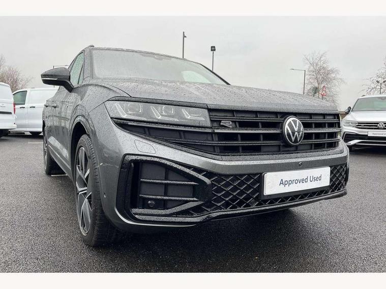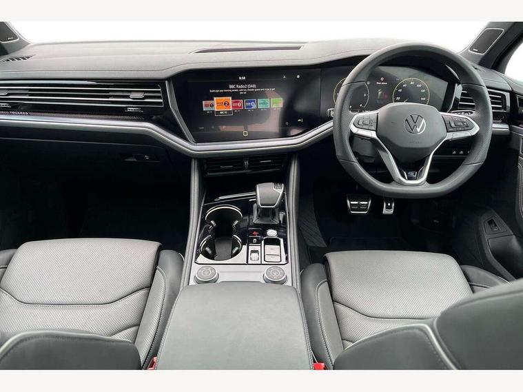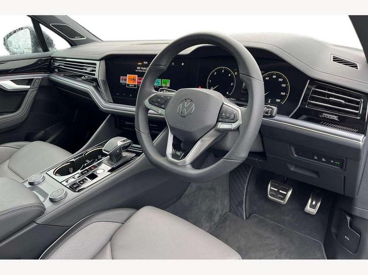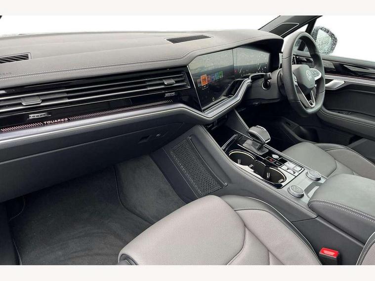 15" Screen Top infotainment system Premium (MIB3), Adaptive cruise control, Advanced driver attention and drowsiness monitor, Driver profile selection, Dynamic road sign display, E-Sim card for online connectivity, eCall emergency system, Innovision cockpit, Intelligent park assist, Mobile phone interface with inductive charging, Multi-colour Active Info display, Park Assist - Sensor controlled steering aid to assist parallel or bay parking, PAS, Warning signal and warning light for front and rear seatbelts not fastened, Wireless app connect, Adaptive chassis control, DAB Digital radio, Diversity antenna for AM/ FM reception, We Connect and We Connect Plus functionality, Automatic coming/leaving home lighting function, Automatic headlights, Black door mirrors, Black style comfort bumpers, Dynamic headlight range control with dynamic cornering light, Electric front tilt/slide panoramic sunroof and fixed rear sunroof, Electrically power adjustable, heated, folding, auto dimming, front passenger exterior door mirror lowering function, External USB type C socket and charging sockets, Gloss black roof rails, HD LED Matrix beam plus digital headlight projection with variable light distribution, Headlight washers, Heat insulating darkened glass in side and rear windows, Highway light, LED 3rd brake light, LED daytime running lights, LED rear combination lamp with variable lighting functions and special styling, Poor weather light, Privacy glass for rear side windows and rear window, tinted glass from B pillar backwards - 80%, Rain sensor, Rear exhaust tailpipe, Rear fog light with back up light on both sides, Rear light bar and illuminated logo, Rear side wing doors, Rear wiper, Stainless steel door sill protection, 12V socket in centre console, 3 rear headrests, 3 seat bench in 2nd row, 4 zone climate control, Airbag label on sun visor and B-pillar, Brushed stainless steel pedals, Double sun visors with illuminated vanity mirrors, Front + rear carpet mats, Front centre armrest, Leather wrapped multifunction sports steering wheel, heated, with touch control and shift paddles, Mechanical rear seat release, Power adjustable lumbar support in front, Power seats in front, right side with memory features and seat cushion depth adjustment, Rear seat backrest and split folding with center armrest, Single front passenger seat, Extra acoustics pack - Touareg, Memory pack plus - Touareg, 3 point seatbelts, outer rear with ECE lable, ABS, Child locks on rear doors, Curtain airbags, Driver and front passenger safety-optimised head restraints, Driver/Front Passenger airbags, Extended pedestrian protection measures, Front assist, Front seat side impact airbags, Generative braking with start and stop system, Height adjustable 3 point front seatbelts with pre tensioners, Passenger airbag deactivate switch, Three 3 point rear seatbelts, Two tone horn, Warning triangle and first aid kit, Alarm system with interior protection, Easy open and close sensor controlled luggage compartment opening and closing with remote unlocking, Keyless Access Keyless locking and starting system with SAFELOCK, Aluminium decorative inserts, Black decorative trims, Gloss black decorative inserts in centre console, Tool kit,