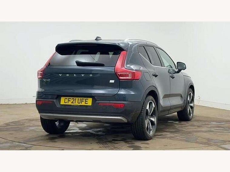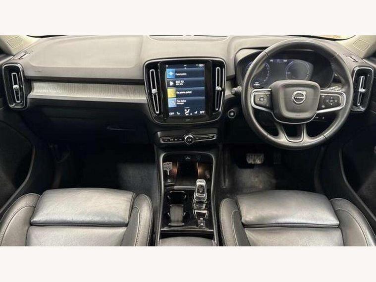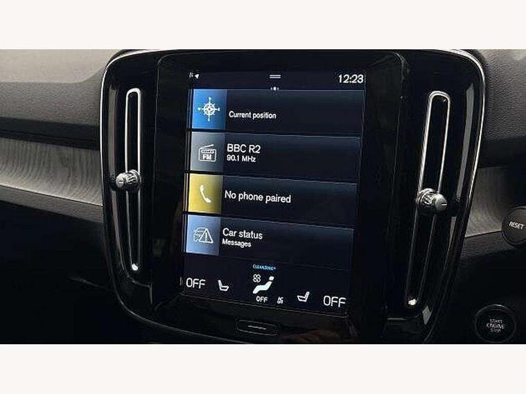 12.3" Active TFT crystal driver's instrument display, 9" centre console portrait touch screen, Adjustable steering wheel force, Bluetooth hands free telephone kit, Drive mode selector, Lane keep assist with driver alert control, Oncoming Lane Mitigation, Power operated tailgate, Sensus navigation with European mapping and traffic information, Speed limiter, Speed sensitive steering, Voice activated control for key functions, Volvo on call, 7m 10amp charge cable with 3 pin plug and 7m 1 phase 16amp type 2/mode 3 charge cable, Dynamic chassis, Electric front axle drive, Recharging port located in nearside front wing, DAB Digital radio, Low speed exterior sound speaker, Steering wheel mounted remote controls, Adaptive brake lights with high level LED brake lights, Auto dimming interior mirror, Automatic headlamp levelling, Chrome window surround, Colour coordinated auto folding and heated power door mirrors, Dual exhaust pipes, Front aluminium tread plates, Front and rear electric windows, Heated front windscreen, Heated washer nozzles, High gloss black front grille with chrome inserts, High gloss black sensus surround deco, High Gloss silver front and rear skid plate, Home safe and approach lighting, LED Headlights + Active high beam incorporating daytime running lights, Rain sensor with automatic windscreen wiper activation, Rear side wing doors, Rear wiper, Roof antenna, Roof spoiler, Silver roof rails, Visible VIN plate, 12V socket in front tunnel console and luggage compartment, 2 zone electronic climate control and rear air vent, 3 seat bench in 2nd row, 3 spoke leather steering wheel with chrome trim, 60/40 versatile split folding rear seat, A-pillar parking ticket holder, Bright metal luggage threshold, Centre console cupholders and storage, Driver's side lower dashboard credit card storage compartment, Front footwell illumination, Front headrests, Front reading light and theatre lighting, Front seat cushion extensions, Glovebox bag hook, Heated front seats, Height/reach adjustable steering column, Height/tilt adjustable driver's seat, High gloss centre tunnel deco, Illuminated glovebox, Illuminated luggage compartment, Illuminated vanity mirrors, Isofix attachments on outer rear seats, Key integrated remote, Leather faced upholstery, Load protection net, Luxury floor mats, Orrefors Crystal gear lever knob, Power driver seat with memory + exterior mirrors memory, Power passenger seat, Rear armrest / integral cup holders / storage tray, Rear coat hook, Single front passenger seat, Underfloor cargo storage, Lighting pack - XC40, Park assist pack - XC40, 3x3 point rear seatbelts, City safety includes pedestrian, cyclist and large animal detection and front collision warning with full auto brake, Drivers knee airbag, Dual stage driver/passenger airbags, Electronic parking brake with auto hold, First aid kit, Front and outer rear seatbelt reminder and pretensioners, Front seats SIPS airbags, Hill descent control, Hill start assist, Inflatable curtain, Passenger airbag cut-off device, Road sign information display, Run off Road Mitigation, Run off Road Protection, SIPS (Side Impact Protection System), Slippery road and hazard light alert, Stability and Traction Control with Spin control, Engine Drag Control and Corner Traction Control, Tyre pressure monitoring system, Vehicle deceleration control with Anti-lock Brake System, Electronic Brake Distribution and Emergency Brake Assist, Warning triangle, WHIPS whiplash protection system - front, Anti-theft alarm including immobiliser/volume sensor + level sensor, Care key with user defined top speed, Key integrated remote control central locking + fuel flap with deadlocking system and auto open/close power windows, Locking wheel nuts, Private locking for tailgate, Driftwood inlays,