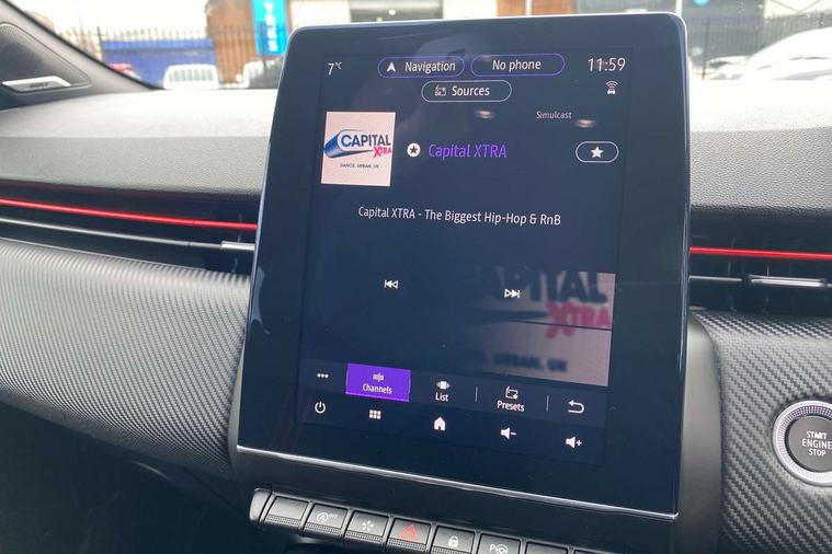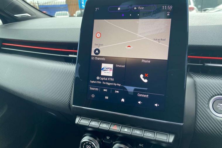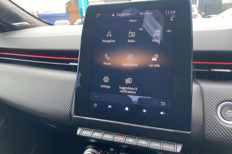 E-call, Easy link 9.3" screen with nav, 4x20W amp, DAB double tuner, 2xUSB, 1xJack/Bluetooth, and smartphone integration plus - Apple CarPlay/Android Auto, Eco mode, Gear change indicator, Lane departure warning system, Over speed prevention, Traffic sign recognition, Trip computer, Variable assistance electric PAS, Bose premium 9 speaker audio system, Sound auditorium, Automatic headlights + automatic windscreen wipers, Black headlamp surrounds, Body colour door handles, Body colour door mirrors, Body coloured bumpers, Body coloured rear spoiler, Chrome window surround, Drivers one touch window with anti-pinch feature, Electric adjustable/heated/folding door mirrors, Electric front windows, Electric rear windows, Exterior rear hidden door handles, Extra tinted glass on rear windows + tailgate, Full C-shape LED front and rear signature lighting, Full LED front and rear headlamps integrating daytime running lights at the front and rear, Gun Metal insert on lower side doors with Clio embossing, LED front fog lights, Rear fog lights, Rear wiper, RS Line badging, RS Line exterior styling, RS Line side marker chrome, RS Line sports front bumper, RS Line sports lower grill, RS Line sports rear bumper sport with chrome oval exhaust pipe, Variable speed on front windscreen wipers, 12V Accessory socket, 3 rear height adjustable headrests, 6.2L front glovebox, 60/40 split rear seats, Air recirculation control, Auto climate control, Dark roof lining and aluminimum pedal set, Driver's seat height adjustment, Front cupholders, Front decor strip in red, Front door storage bin, Height adjustable front headrests, Height/reach adjust steering wheel, Isofix system on outer rear seats, Multi function steering wheel, Pollen filter, RS branded top grain leather steering wheel, RS Line cloth upholstery with striped and red contrast stitching, RS Line Interior trim including airvent stripe and gearshifter in red, System for Restraint and Protection SRP-front seats, Exterior chrome pack - Clio, 3 point seatbelts on all rear seats, ABS+EBD+Brake assist, Automatic emergency braking system, Curtain airbags, Distance warning alert, Driver and passenger front and side airbag deactivation, Driver/Front Passenger airbags, ESC - Electronic Stability Control + traction control, Front side airbags(head+thorax), Height adjustable driver's seatbelt, Hill start assist, Seatbelt warning, Tyre pressure warning, Automatic door locking, Central door locking, Child lock control of rear doors and windows, Deadlocking system, Hands free key card with push button, start and stop function, Locking fuel filler cap, RAID (Renault Anti-Intruder Device) with automatic door locking, Remote central locking, Thatcham Cat 2 engine immobiliser, 17" RS diamond cut alloy wheels,