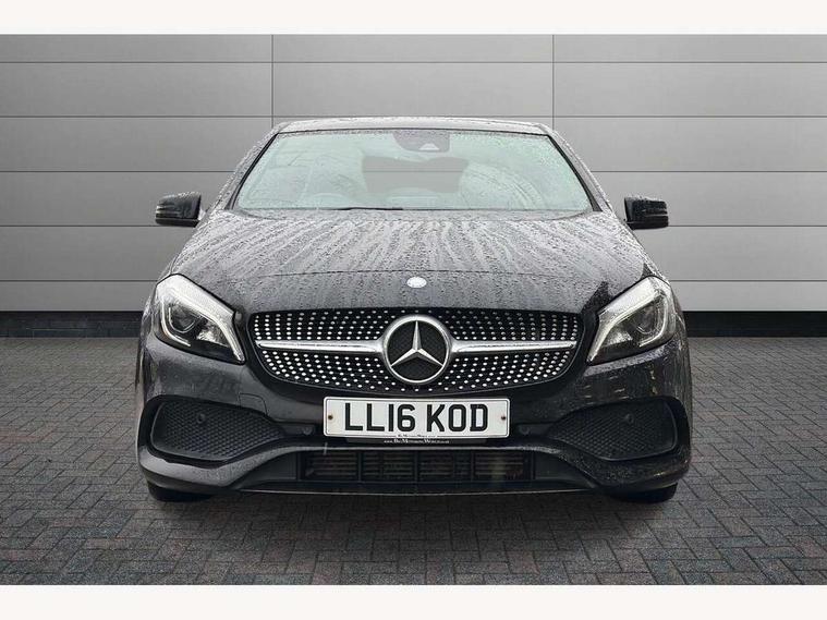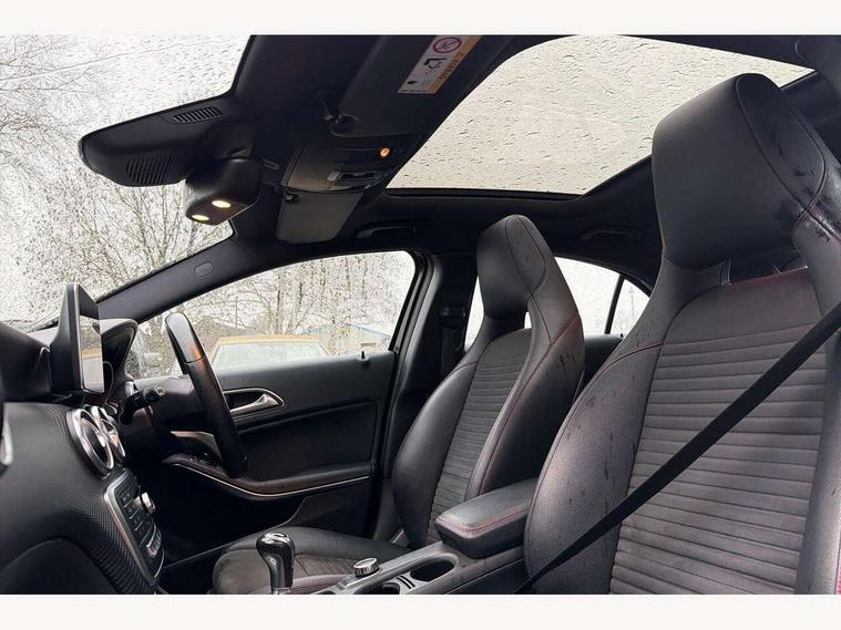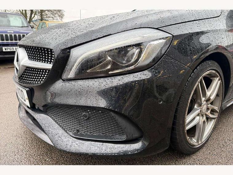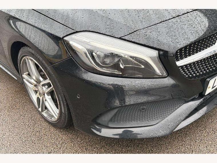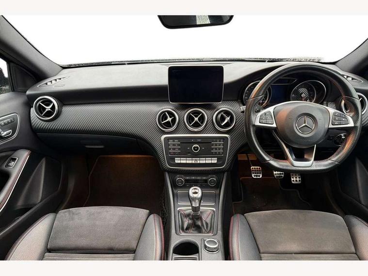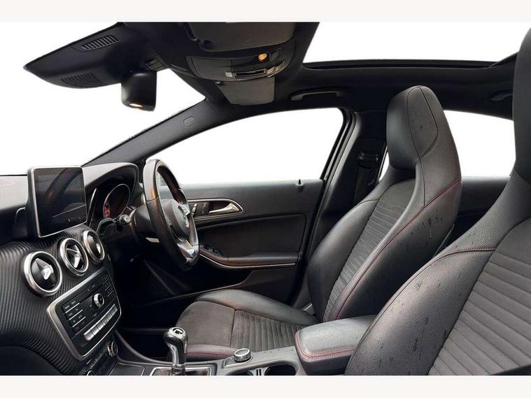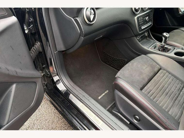 8" colour display screen, Attention assist, Bluetooth interface for hands free telephone, Bulb failure indicator, Collision prevention assist plus, DYNAMIC SELECT with a choice of driving modes (ECO, Comfort, Sport, Sport+ and Individual), External temperature gauge, Low fluid warning light, Park assist pilot with front and rear park assist, Reversing camera, Service indicator (ASSYST PLUS), Speed dependent sports steering system, Speedtronic cruise control, Trip computer, Lowered suspension, USB port, Adaptive brake lights, AMG body styling, Auto dimming driver's door mirror, Auto dimming rear view mirror, Body colour bumpers, Body colour door handles, Body colour side skirt, Daytime running lights, Diamond radiator grille with chrome pins and silver louvre + chrome insert, Electric adjustable heated door mirrors, Electric folding door mirrors, Electric front windows, Electric rear windows, Headlamp assist, Heated rear window with timer, High beam assist, LED Headlights, Panoramic sliding sunroof, Rain sensor windscreen wipers, Rear wiper, Twin Trapezoidal tailpipes, 1/3 to 2/3 split folding rear seats, 12 colour Ambient lighting, 12V socket, 3 Spoke sports multifunction flat bottomed leather steering wheel, Auto Mercedes-Benz child seat recognition sensor, Black headlining, Brushed stainless steel sports pedals, Dual zone automatic climate control, Electric front seats with memory function, Footwell lights, Front and rear reading lights, Front centre armrest with storage compartment, Front head restraints, Front sport seats, Heated front seats, Height adjustable front seats, Height/reach adjustable steering column, Illuminated door sills, Illuminated glovebox, Illuminated storage compartment, Isofix rear child seat preparation, Leather gearshift, Load securing rings in luggage compartment, Luggage compartment cover, Luggage net under rear parcel shelf, Parcel net in front passenger footwell, Rear head restraints, Storage compartment under load area floor, Sunvisors with illuminated vanity mirrors, Twin front cupholders, Seat comfort pack - A Class, Stowage Pack - A Class, 3 rear 3 point seatbelts, ABS with Brake Assist, Active bonnet, Adaptive brake system, Brake calipers with Mercedes-Benz lettering + perforated brake discs, Child proof door locks, Crash responsive emergency lighting, Drivers knee airbag, Dual stage driver/passenger airbags, Electronic parking brake, ESP with ASR, Front and rear seatbelt reminder, Front head airbags, Front passenger seat occupancy sensor, Front side airbags, Hill start assist, Tyre pressure monitoring system, Warning triangle and first aid kit, Window airbags, Alarm system/interior protection/immobiliser, Keyless Go access/ignition system, Remote central locking, Carbon effect trim, Chrome air vent surrounds, Tirefit sealant with electric air pump,