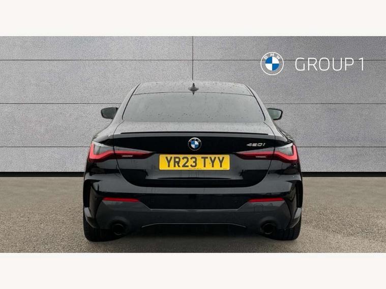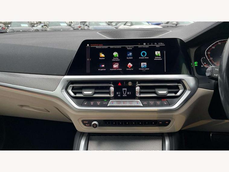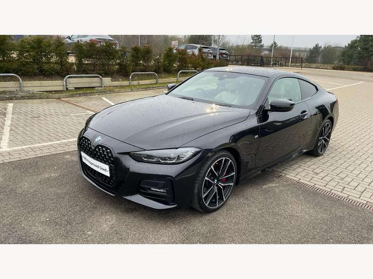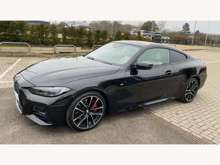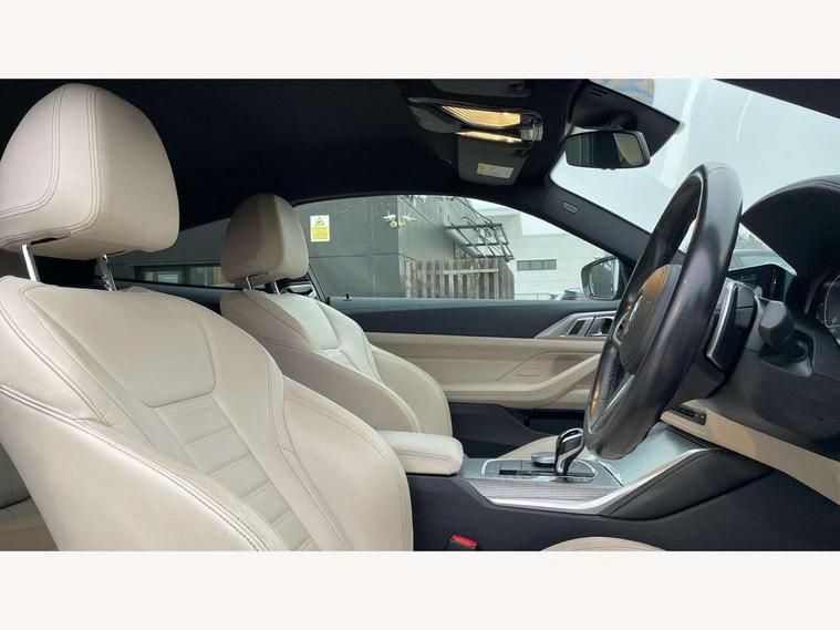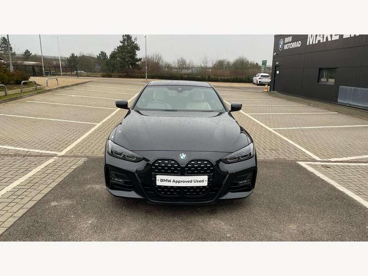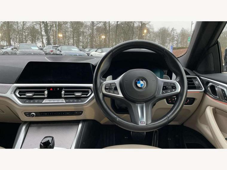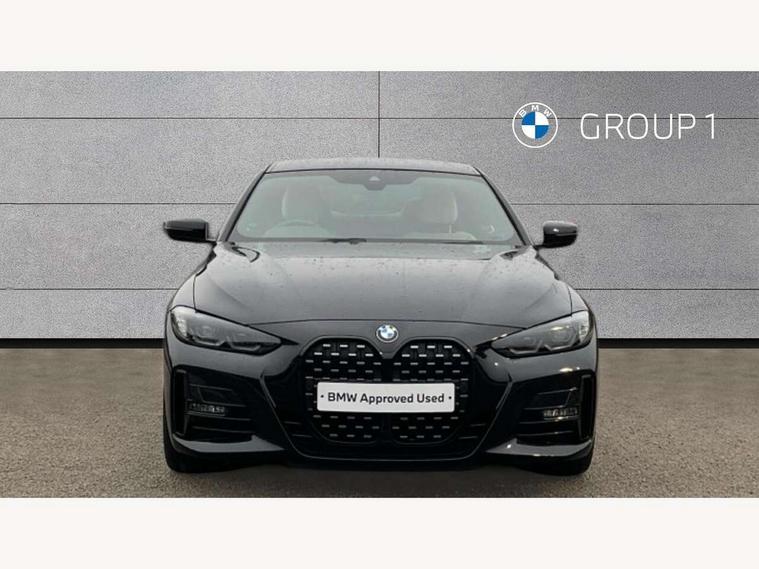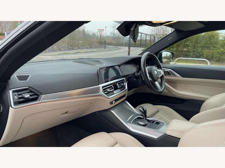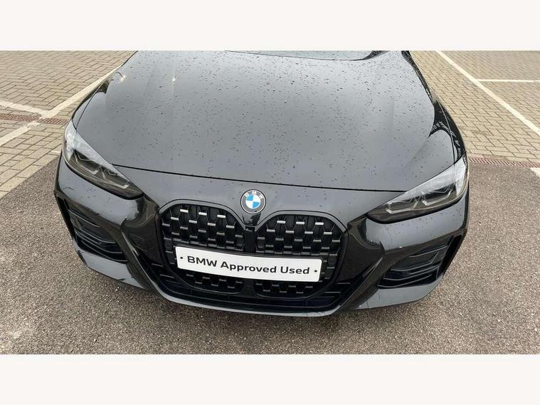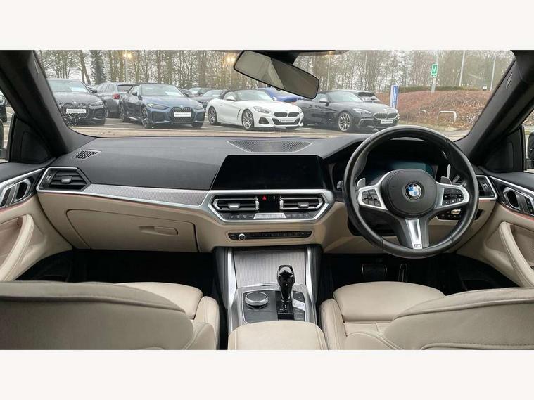 Active guard plus, Attentiveness assist, Auto start-stop, Bluetooth hands free facility with USB audio interface with audio streaming, BMW ConnectedDrive online services, BMW iDrive controller on centre console, BMW Live Cockpit Plus Nav-12.3" instrument&14.9" control Widescreen curved display/Intelligent Voice Assist/iDrive touch/Access 3rd party app/4G LTE, BMW service history, BMW Teleservices, Brake pad wear indicator in front and rear, Check Control warning system for monitoring of lights and door/luggage compartment open warning, Condition based service, Cruise control with speed limit function, Electric power steering with Servotronic steering optimised at all speed ranges, Gearshift time display in manual mode, Instrument cluster with speedometer with mph readout, tachometer, fuel gauge and oil temperature gauge, Integrated owners handbook, Oil sensor for level and grade, warning by check control system, On board computer - average speed, fuel consumption, outside temp display with acoustic warning, clock/date, service interval, odometer/trip meter, Optimum shift indicator, Run flat indicator, Shifting point display, Variable sport steering, 8 speed automatic steptronic transmission with gearshift paddles, Balanced 50/50 weight distribution, Double joint spring strut front axle, Double VANOS, Drive performance control - ECO PRO, comfort and sport modes, Electronic differential lock control (EDLC), High precision injection, Low centre of gravity, M sport suspension, Petrol Particulate Filter, Stroke dependent dampers, VALVETRONIC engine management, 2x USB Type C ports in front centre console for charging and data transfer, 2x USB Type C ports in rear centre console for charging, DAB tuner, Electronic service booklet, Acoustic glazing, Automatic headlight beam throw control with load dependent regulating reaction, dynamic compensation of braking dive and acceleration squat, Automatic windscreen wipers and automatic headlight, Automatically dimming electrochromatic rear view mirror, BMW emblem on engine compartment lid and tailgate, BMW kidney grille with mesh grille front side of the nuggets in matt aluminium and frame in chrome high gloss, Body colour fuel filler flap, Body colour roof fin, Brushed aluminium inserts in the front door sill finishers with BMW designation, Door sill strips, Dynamic brake lights, Electric windows - front and rear, with open/close fingertip control, anti trap facility and comfort closing function all round, Exterior mirrors - electrically folding with anti-dazzle, Fading support, Follow me home headlights, Front and rear bumper system, Front apron plastic in body colour, Green tinted heat protection glazing, High gloss shadow line exterior trim, Illuminated bow type door handles in body colour drivers side with door lock, Interior rear view electrochromatic mirror with automatic anti dazzle function, LED daytime running lights, LED front fog lights, LED front indicators, Licence plate panel integrated into front bumper and tailgate, Lightweight engineering, M designation on front side panels, left and right, M rear boot spoiler, Model designation on right side of tailgate, One piece front bumper cover including towing eye cover in body colour, Preparation for high beam assistant, Rear boot, Reversing light, Side frame decorative moulding black matt, Two part LED tailights in L-shape with components in smoked glass, brake light, LED turn indicator and rear fog light, Visible exhaust tailpipe finisher, Visible VIN plate, Welcome lights in interior and door handle area, Widened track and increased camber values for max transverse dynamics, agility and steering precision, Window recess cover black high gloss, Windscreen wipers with integrated heated washing jets, 12V power socket in front centre console, 2 front cupholder in centre console with clamping elements and matt black inlay, 2 Rear seat headrests, 2 seat bench in second row, 3 spoke M sport leather multifunction steering wheel, 3 zone automatic air conditioning, 4 pieces lashing eyelets in luggage compartment, 40:20:40 split folding rear seat and rear centre armrest with two cupholders, Anthracite headlining, Armrest integrated in front and rear door trim + front centre console armrest, BMW ID, Driver seat backrest width adjustment, Extended storage - Luggage compartment partition net on left side trim panel, Bag hook on both sides of the luggage compartment, Four grab handles integrated in roof lining, Front and rear door pockets, Front and rear reading lights, Front sport seats, Heated driver and front passenger seats, Height adjustable front headrests, Height adjustable mechanically and infinitely variable steering column, Illuminated armrest storage compartment, Illuminated glove compartment with separate small compartment, Make-up mirror lights, Single front passenger seat, Storage compartment in rear centre console, Sunvisors with illuminated vanity mirrors and ticket pocket, Toolkit located in luggage compartment, Velour front floor mats, Vernasca leather upholstery, Ambient lighting pack - 4 Series, Connected professional package - 4 Series, M sport exterior styling pack - 4 Series, 2 x 3-point rear seatbelts, Battery safety cut-off, BMW emergency call, Brake energy regeneration, Braking pre-tensioning, Child seat ISOFIX attachment for the two outer rear seats, Coasting in idle in ECO PRO mode, Cornering brake control (CBC), Crash sensor activating of airbags, Unlocking doors, hazard warning lights, interior light, safety battery terminal, Driver and front passenger side airbags, integrated in the door side seat backrest bolsters for all seat variants, Driver/Front Passenger airbags, Dry braking, Dynamic brake control, Dynamic stability control + (DSC+) - Anti-lock Braking System (ABS) with brake assist and cornering brake control + Automatic Stability Control (ASC), Dynamic Traction Control - DTC, Electric parking brake including automatic hold function and automatic release of the parkin