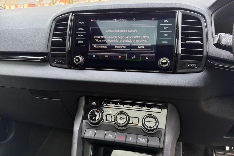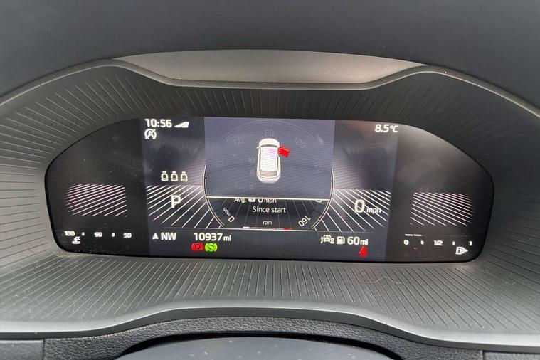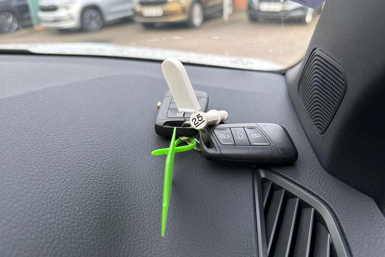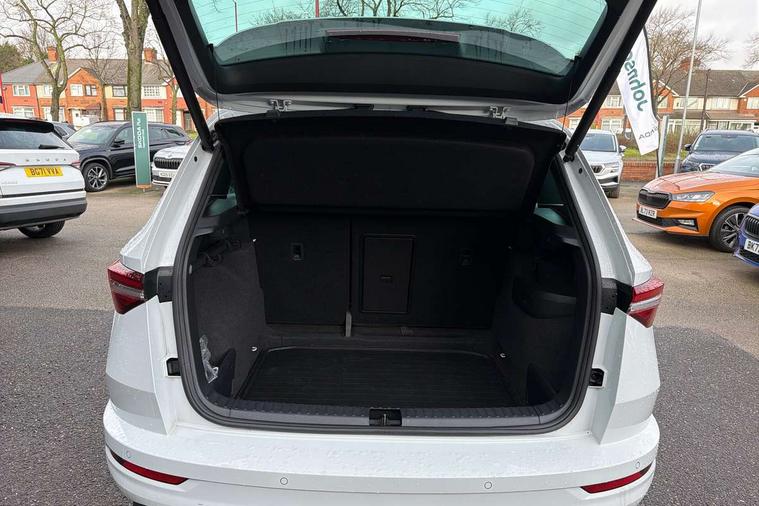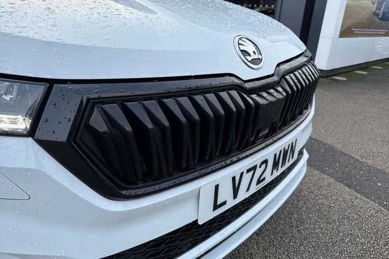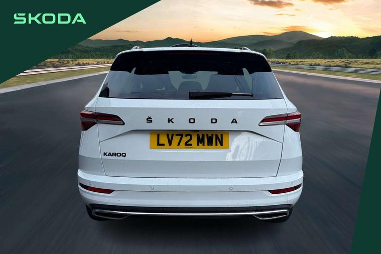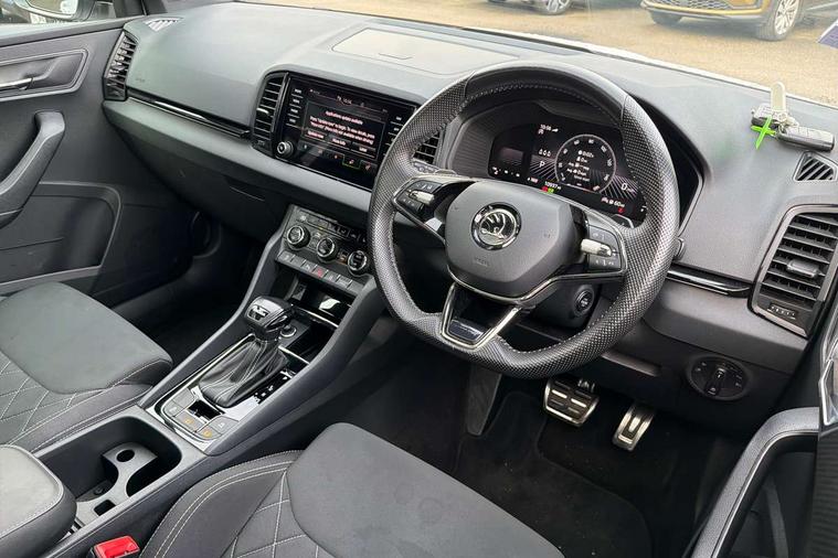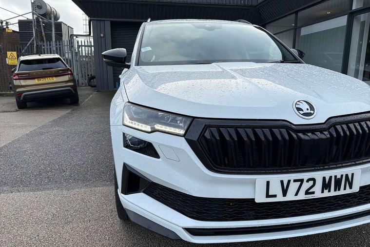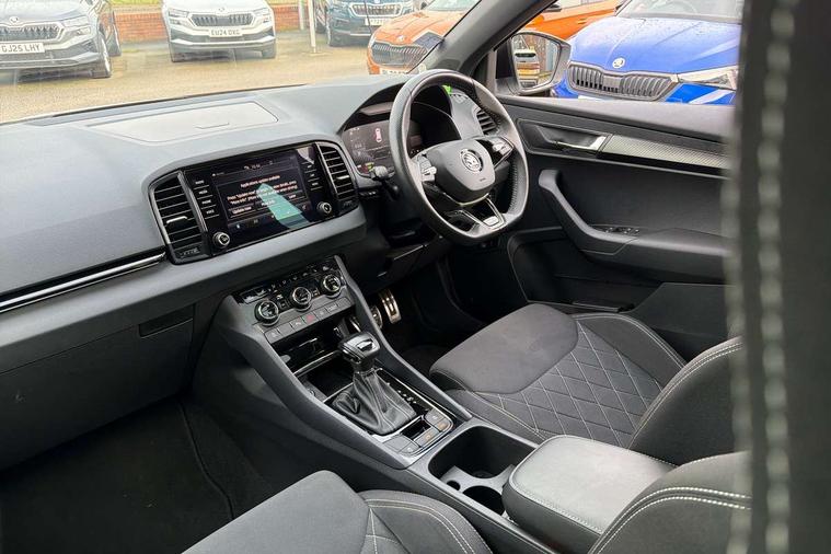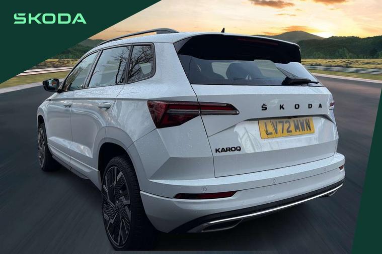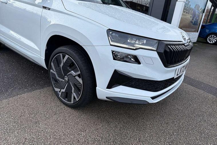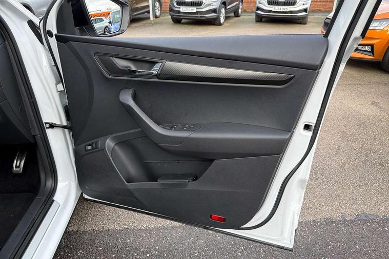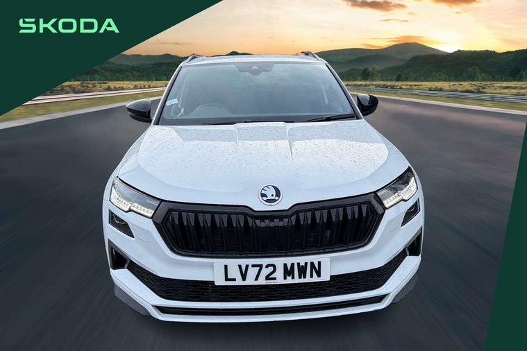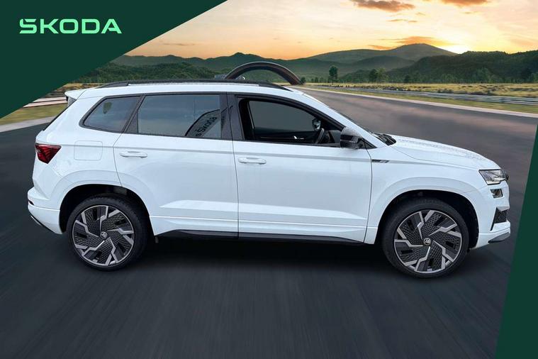 8" Digital display, Care connect, Driver fatigue sensor, Emergency services call system, Outside temperature gauge, Service interval indicator, SmartLink wireless for Apple and wired for Android, Start/stop system with regenerative braking, USB C Port x 2 in front centre console, Virtual pedal with electrically operated boot door, 8 Speakers, DAB radio with Bluetooth, USB connection, Acoustic glass, Aero front windscreen wipers with intermittent function, Auto dimming rear view mirror with light and rain sensors, Black door mirrors, Black electric window control buttons, Black radiator grille, Black roof rails, Body colour door handles, Dynamic headlight range control with cornering light function, Electric front and rear windows with child proof lock, Front door steps with SportLine logo, Heated rear windscreen, LED daytime running lights, LED rear lights with high functionality welcome effect and dynamic indicators, Light assistant (coming/leaving home/tunnel light), Panoramic sliding sunroof, Plastic scuff plates, Privacy glass, Protective door side sills in body colour, Rear diffuser, Rear side wing doors, Rear spoiler, Rear window wiper with washer system and intermittent control, Safety reflectors on front doors, Skoda lettering on tailgate in black, Sportline badge on front fender, Sportline decorative inserts with badging, Sports front and rear bumpers, 1.5 litre bottle holders in driver and front passenger door panels, 12V socket in boot, 12v socket in front centre armrest with storage compartment and rear air vents, 2 Folding hooks and nets in boot, 3 rear height adjustable headrests, 3 seat bench in 2nd row, 3 spoke leather sports multifunction steering wheel and silver stitching with gear shift paddles, 4 foldable roof handles with rear coat hooks, Black floor carpet, Black roof headlining, Chrome inner door handles, Double sided boot floor, Foldable hooks in the boot, Front head restraints, Height adjustable front three point seats belts with tensioners, Height/reach adjust steering wheel, Ice scraper, Illuminated glovebox, Illuminated luggage compartment, Isofix child seat preparation outer rear, Manual lumbar support for front seats, Pen holder, Pollen filter, Rear boot cover, Rear reading lights, Rear seats fixed folding and divided 60:40, Rubbish bin door, Safety vest holder, Single front passenger seat, Storage box in upper central dashboard closed, Sunvisors with illuminated vanity mirrors, Textile floor mats, Ticket holder, Titan black interior ceiling, Welcome animation with sportline logo, Light Pack - Karoq, Parking pack - Karoq, Automatic door unlocking in case of crash, Automatic fuel cut off in case of crash, Child locks on rear doors, Driver airbag, Electronic parking brake with auto hold function, Emergency rear braking signal, ESC including ABS, MSR, ASR, EDS, HBA, DSR, RBS, MKB and traction control, Front side airbags, Hill hold control, Knee airbags, Passenger airbag with switch-off function, Pedestrian monitor, Seatbelt reminder signalisation and pretensioner for all seats, Three point seatbelts rear, Two tone horn, Tyre pressure display, Tyre pressure monitor, Alarm with interior monitoring, back up horn and tilt sensor with safe function, Electronic engine immobiliser, Keyless entry and start/stop, Remote central locking with 2 remote folding keys, Black air vent surround, Black centre console, Satin black dashboard, Satin black door trim, 19" Sagitarius anthracite alloy wheels with matt black aero inserts, Anti-theft wheel bolts protection, Matt black aero hub caps, Storage on wheel cover, Tool kit,