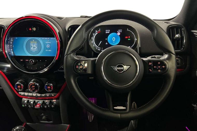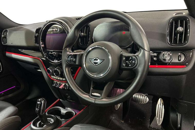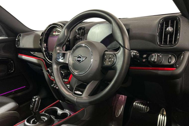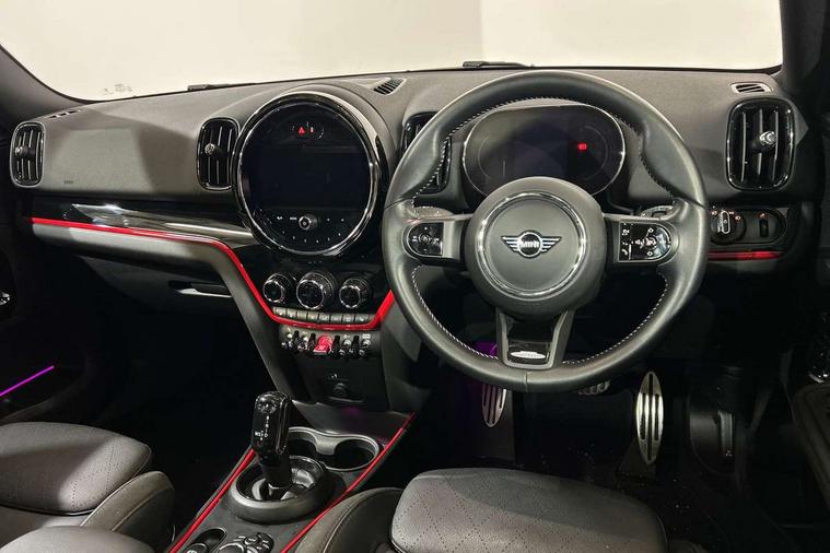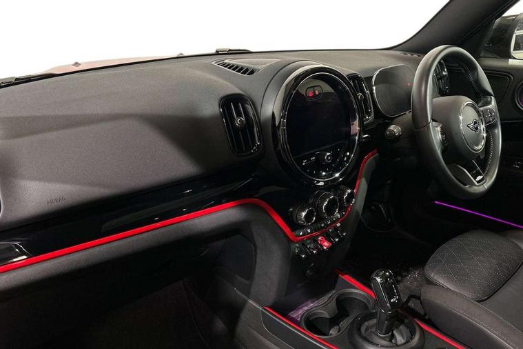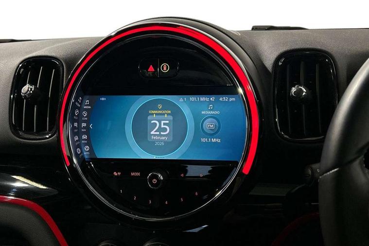 Active Guard incl speed limiting and lane departure functions with auto steering, and front collision warning with brake intervention, Automatic start/stop function with brake energy recuperation, Compatible mobile phone bluetooth with audio streaming, Cruise control with brake assist, Electro-mechanical speed dependant steering assistance, Instrument cluster, MINI Driving Modes - centre toggle switch to control driving setting (sport, mid and green), Mini E-call, On board computer, Double Vanos system, Fully variable valve control, High precision injection, Performance Control, Steptronic transmission with double clutch, FM tuner and DAB digital radio, 3rd brake light, Body colour fuel filler cap, Day time driving lights, Door sill strips, Dynamic brake lights, Electric windows, Heated rear window, Heated windscreen washer jets, John Cooper Works - aerodynamic kit (front and rear apron, spoiler), front and rear sport bumpers and part-painted side sills with door sill finishers, John Cooper Works Logo, LED fog lights, Model logo, Model logo on Tailgate, Rain sensor with auto headlights, Rear fog lights, Rear side wing doors, Rear window wiper, Side scuttle panel with integrated indicator, Split rear doors, Sun/heat protection glass, White indicator lenses, 12V socket in centre console, 3 seat bench in 2nd row, 360L luggage compartment capacity, 4 lashing eyes in luggage compartment, 40:20:40 split folding rear seats, Anthracite headlining with grab handles and clothes hooks, Chrome interior highlights, Colour line - Carbon black, Cupholders, English handbook, Front headrests, Glove compartment, Height and length steering column adjustment, Interior lighting with 12 basic colours selectable via toggle switch in roof, Isofix rear child seat preparation, LED reading lights, vanity mirror lights, front foot well light and spotlight on front seats, Mini John Cooper Works leather gearshift lever and handbrake gaiters, Multifunction steering wheel, Nappa leather steering wheel with MINI Yours logo, Rear headrests, Single front passenger seat, Stainless steel pedals and foot rest, Storage compartments in doors, Sunvisors with vanity mirrors, Excitement pack - Countryman, Navigation pack - Countryman, Piano black exterior pack - Countryman, 2 tone horn, 3 point seatbelts on all seats, 6 Airbags - front, side, head and seat belt tensioners, Anti-lock braking system (ABS), DSC - Dynamic Stability Control, Electronic handbrake, Front and rear disc brakes, Hill start assist, Manual rear child locks, Tyre pressure monitoring system, Alarm system with tilt sensor, monitoring doors, bonnet interior and tailgate, Auto drive away locking, Deadlocking function, Electronic vehicle immobiliser, Locking wheel bolts, Start/stop toggle with keyless go, Piano black JCW interior trim, Tool kit,