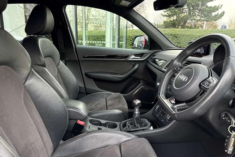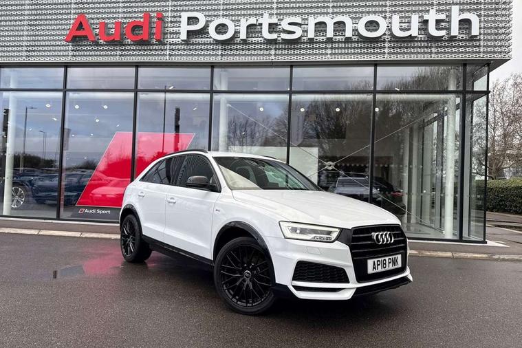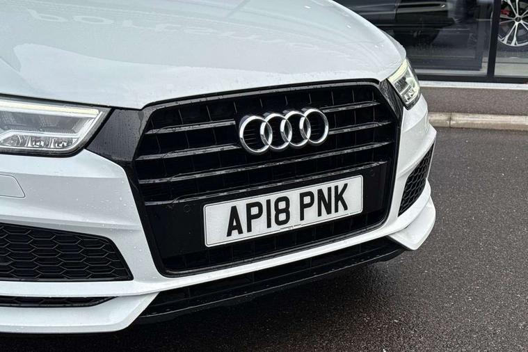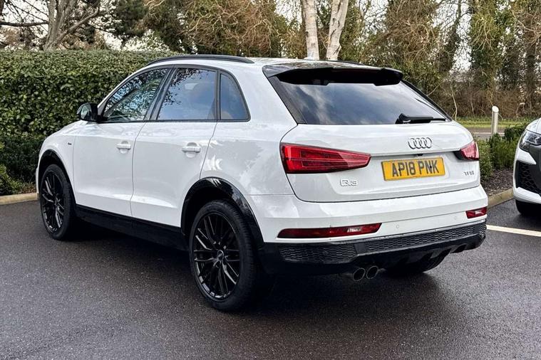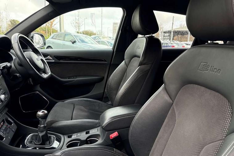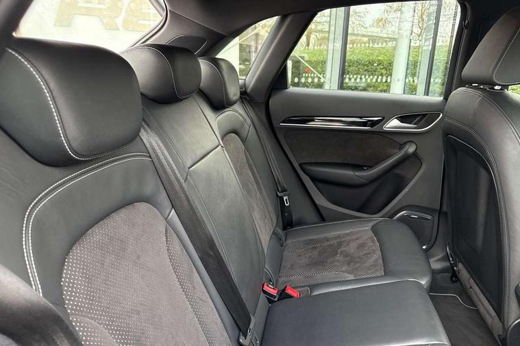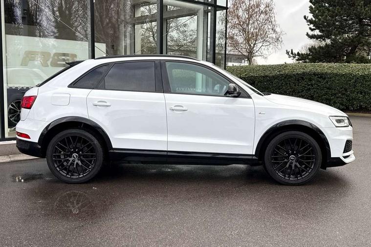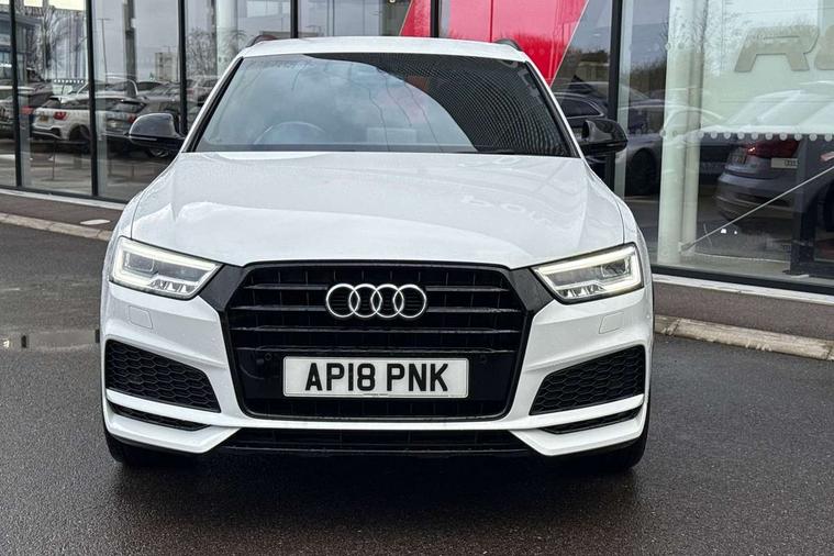 6.5" colour display screen, Audi drive select, Cruise control, Electro-mechanical PAS, Low washer fluid indicator, MMI - Multi Media Interface control system, On board computer, Remote electric boot opening/closing, Service interval indicator, Voice control system, Sports suspension, Audi music interface, BOSE sound system, DAB digital radio module, Acoustic windscreen, Aluminium window surround, Auto dimming rear view mirror, Black exhaust tailpipes, Black high gloss door mirrors, Black roof rails, Coming home function, Door mirror integrated indicators, Front and rear electric windows, Front fog lights, Front lip spoiler, Heated windscreen washer jets, High Gloss Black Contrast Bumpers, High Gloss Black rear spoiler, LED daytime running lights, LED headlights with headlight washers, LED rear lights, Light and rain sensor for auto activation of lights and windscreen wipers, Loading sill protector in stainless steel, Privacy glass, Rear diffuser with platinum insert, Rear wiper, S Line body styling, Sunband for windscreen, 12V socket in rear centre console, 3 spoke flat bottom multi-function perforated leather steering wheel with contrast stitching and aluminium gearshift paddles, Aluminium door sill trims, Aluminium gear knob, Black cloth headlining, Door sill trim strips, Dual zone climate control, Electric front lumbar adjustment, Front and rear headrests, Front and rear velour floor mats, Front centre armrest with storage compartment and angle adjustment, Front sports seats, Height/reach adjust steering wheel, ISOFIX on front passenger and rear outer seats, Jack and tool kit, Retractable luggage cover, Reversible boot floor, Split fold rear seat, Stainless steel pedals, Storage compartment and 12V socket, Under floor storage in luggage area, Audi Exclusive black styling pack - Q3, LED interior light pack - Q3, 3x3 point rear seatbelts, ABS+Electronic Brake force Distribution, Curtain airbags, Driver and passenger airbags, Driver and passenger side airbags, EDL + ASR, Electrically operated child locks on rear doors, Electromechanical parking brake, ESP, First aid kit, Front passenger airbag deactivation, Head airbags, Seatbelt warning light, Tyre pressure monitoring system, Warning triangle, Locking wheel bolts, Remote central locking, Thatcham category 1 alarm + immobiliser, Piano black finish inlay,
