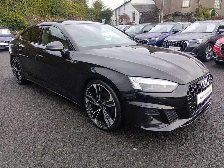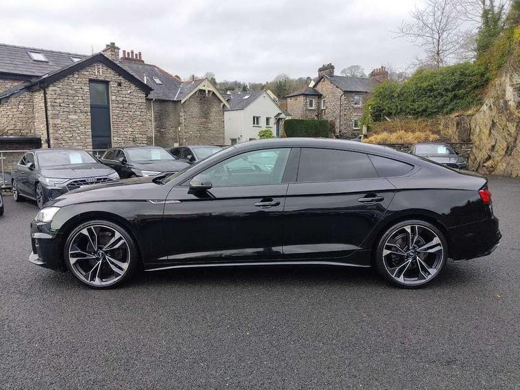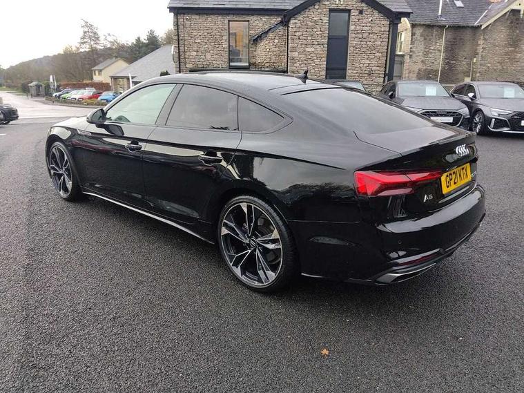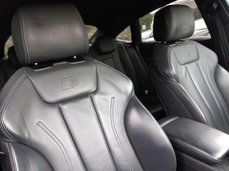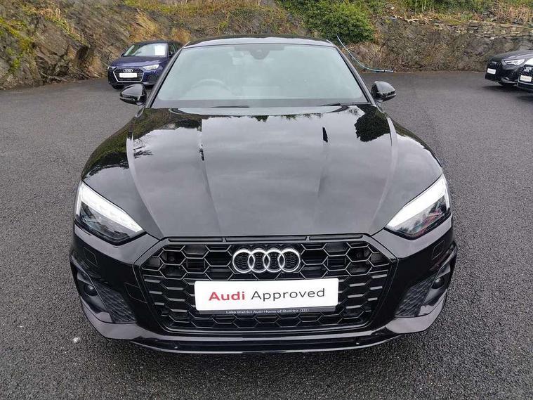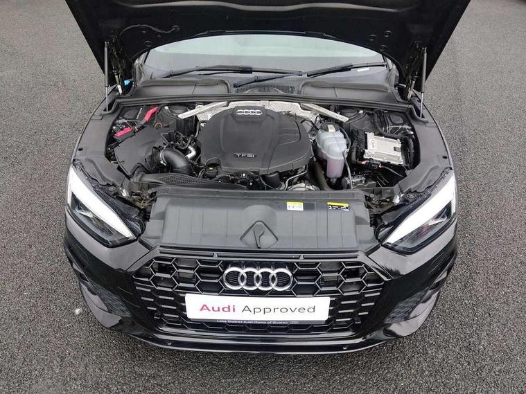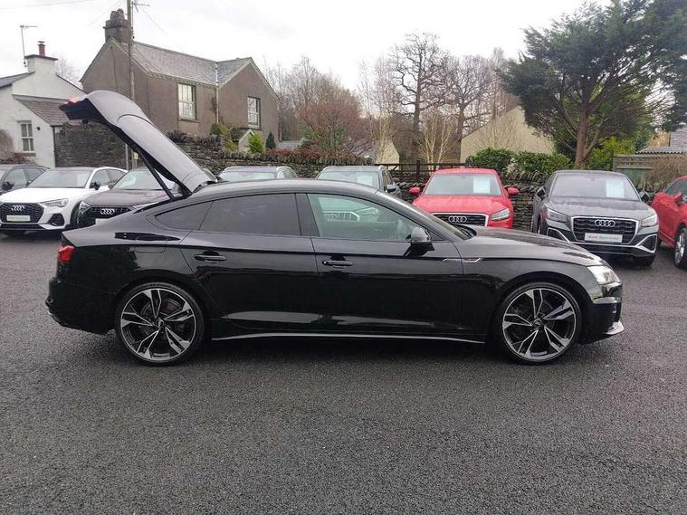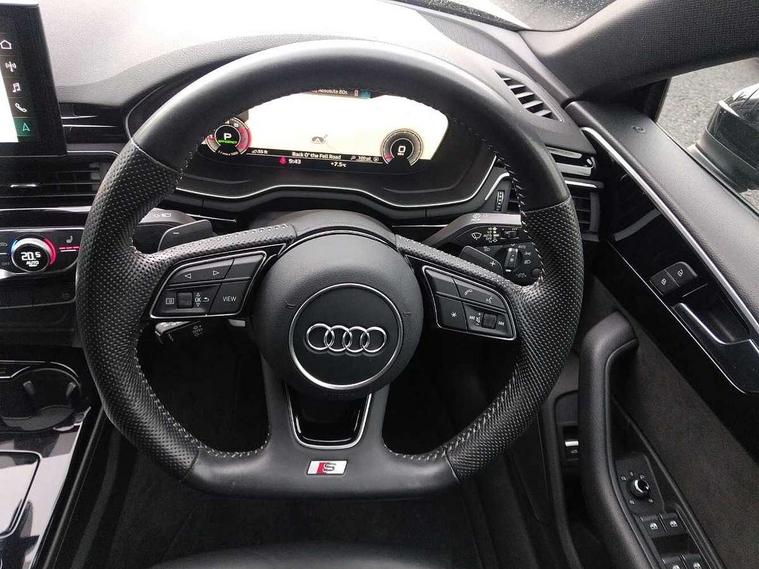 Piano black finish inlay, Black styling pack - A5 Coupe/Sportback, LED interior light pack - A5/RS5, 20" 5 twin spoke polygon design alloy wheels in gloss anthracite black and gloss turned finish, Tyre repair kit, Anti theft alarm system, Anti theft wheel bolts, Immobiliser, Keyless Go, Remote central locking, 8 passive loudspeakers, CD player, DAB digital radio reception, Two additional USB ports for rear passenger in rear centre console, Two SDXC card slots, 3x3 point rear seatbelts, 6 airbags - Driver, front passenger, curtain and side airbags, Electromechanical parking brake, Electronic Stabilisation Control (ESC) including ABS, ASR and EDL, Front passenger airbag deactivation, Height adjustable front seatbelts, Hill hold assist, Multi collision brake assist, Pop-up bonnet for pedestrian protection, Seatbelt monitoring, Tyre pressure warning, Variable restraint system, Warning triangle and first aid kit, Auto dimming rear view mirror, Black door mirror housings, Body colour bumpers, Body colour door handles, Body colour front spoiler lip, Body colour side sill trim, Electric adjustable heated door mirrors, Electric folding door mirrors, Electric front windows, Front fog lights, Honeycomb structure radiator grille in grained matt black, Matrix LED headlights with Audi laser light, dynamic light sequencing and dynamic indicator, Matt aluminium silver tailpipe trim, Privacy glass, Rain and light sensors, Rear diffuser in matt titanium black with trim strip in matt aluminium silver, Side air inlets in grained matt black with matt aluminium silver inlay, Sport front and rear bumpers with side skirts, Towbar preparation, Windscreen with acoustic glazing, 4 way electric lumbar support for driver and front passenger, 40/20/40 split folding 3 seater rear bench seat, Adjustable steering column, Black cloth headlining, Black perforated leather gearknob, Contrast stitching on seats, steering wheel and gear lever gaiter, Deluxe 3 zone electronic climate control, Electrically adjustable front seats, Fine Nappa leather upholstery with front sports seats S embossed logo, Front centre armrest, Front head restraints, Front/rear floor mats, Heated front seats, Illuminated door sill trim with S logo, ISOFIX child seat mounting and top tether, Luggage compartment mat, Rear headrests, Stainless steel pedals, Sunvisors with vanity mirrors, Tool kit, Audi connect safety and service (e-call), Audi drive select (Auto, Comfort, Dynamic, Efficiency and Individual), Audi parking system plus with front and rear sensors, Audi phone box with wireless charging, Audi smartphone interface, Audi virtual cockpit - 12.3" full colour digital instrument cluster, vehicle/engine speed, 3D navi map, Radio/media information+Driver assistance systems, Automatic start-stop system with coasting functionality and efficiency programme, Bluetooth interface, Electro-mechanical power steering, Email, calendar and text messages displayed via MMI, MMI nav+ with MMI touch - 10.1" high resolution MMI display, touch sensitive, 3D map, route/country info, dynamic route guide, personal route assist, Power operated tailgate, Rear view camera, Service interval indicator, Voice control system, Sports suspension lowered by 23mm,
