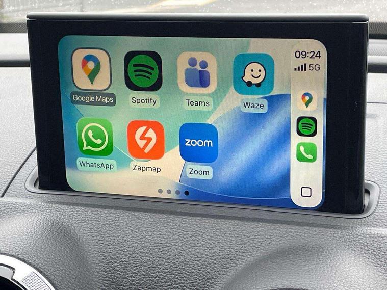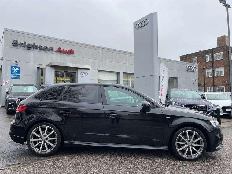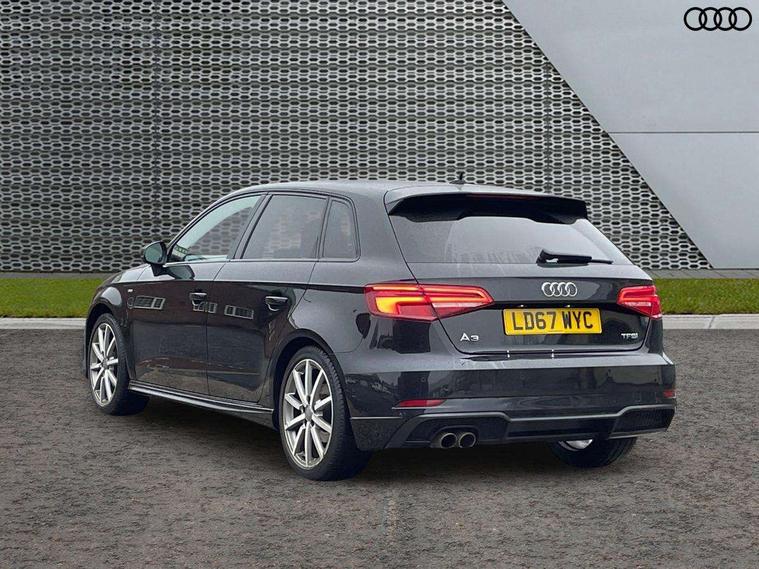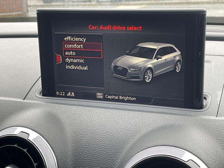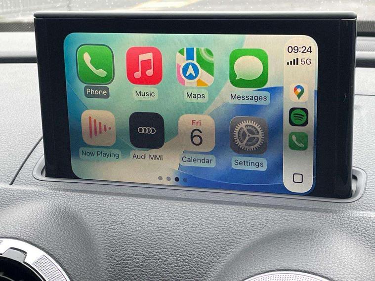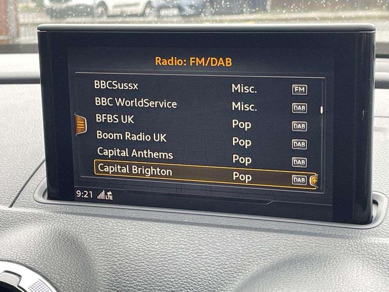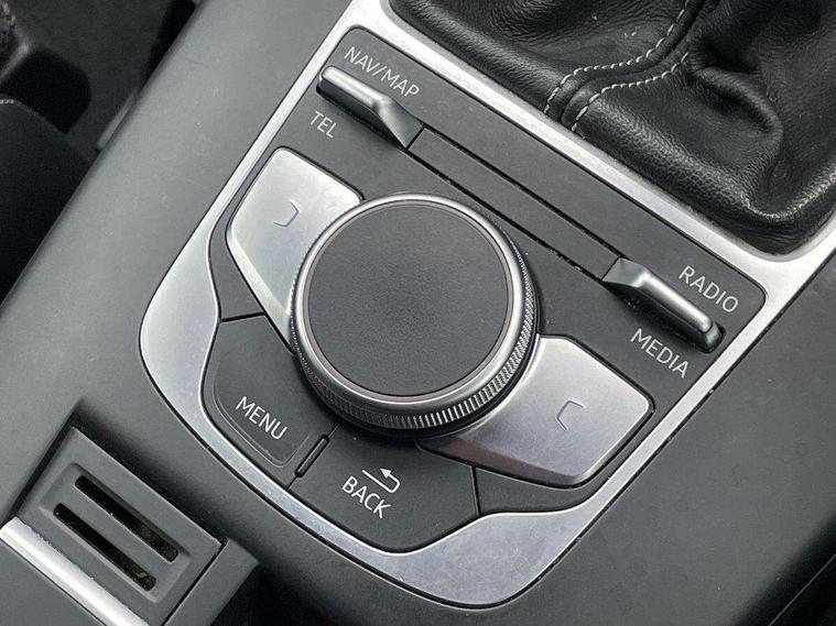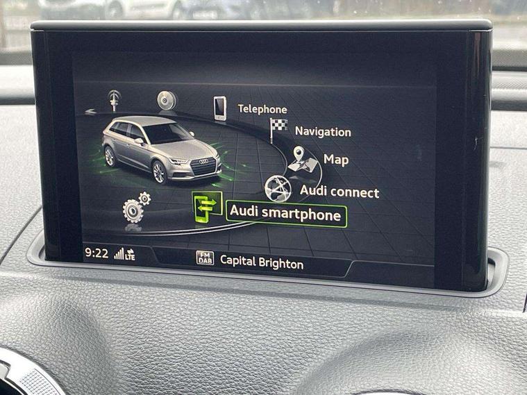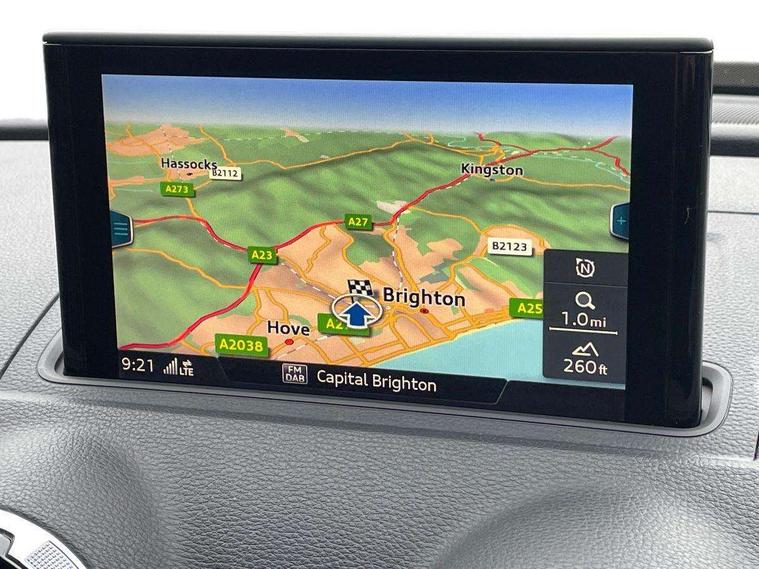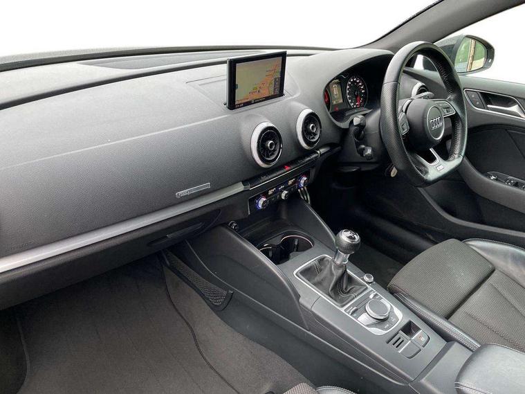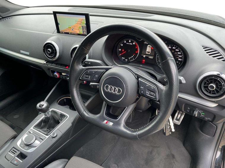 Audi connect, Audi drive select, Audi smartphone interface, Colour driver's information system display, Electro-mechanical PAS, HDD satellite navigation system radio single CD/DVD player MMI control system, Mobile telephone preparation - bluetooth interface, Service interval indicator, Speed limit display, Voice control system, 2 USB ports, Audi music interface, Audi sound system with 10 loudspeakers, Auxiliary input socket, CD player, DAB Digital radio, MMI radio plus with 7" colour MMI screen and MMI controller, Auto dimming rear view mirror with light and rain sensors, Black door mirrors, Black window surrounds, Body colour bumpers with black insert, Body colour roof spoiler, Chrome exhaust tailpipes, Electric front windows, Electric operated/heated door mirrors, Electric rear windows, Heated windscreen washer jets, LED daytime running lights, Matt black radiator grille, Privacy glass, Rear wiper, S Line body styling, Sport specific side air inlet grille and diffuser insert, 3 adjustable rear headrests, 3 spoke flat bottomed multi-function leather steering wheel, 4 lashing points to secure luggage, Adjustable front armrest, Black cloth headlining, Dual zone electronic climate control, Front and rear interior lights with delay, Front passenger seat isofix location point, Front sports seats, Front/rear floor mats, Height/depth adjustable steering column, Illuminated door sills, Illuminated glovebox, ISOFIX child seat preparation+airbag deactivation, Jack and tool kit, Stainless steel pedals, Storage compartment in centre console, Storage compartment under front seats, Storage compartments in doors, Black styling pack - A3/S3, LED interior light pack - A3/RS3, Non smoking pack - A3, Storage and luggage pack - A3/RS3, 3 point seatbelts on all seats, ABS/EBD, Active bonnet, Active front headrests, ASR, Curtain airbags, Driver and passenger side airbags, Driver/Front Passenger airbags, Drivers knee airbag, EDL, Electromechanical parking brake, ESC - Electronic Stability Control + traction control, Front passenger airbag deactivation, Manual rear child locks, Multi-Collision braking, Seatbelt warning, Tyre pressure warning, Warning triangle and first aid kit, Anti theft alarm, Anti-theft wheel bolts, Remote control central locking, Thatcham category 1 alarm + immobiliser, Aluminium air vent surrounds, Aluminium trim elements, Matt brushed aluminium inlays, 18" 10 spoke design alloy wheels in matt titanium look with diamond cut finish, Space saver spare wheel,