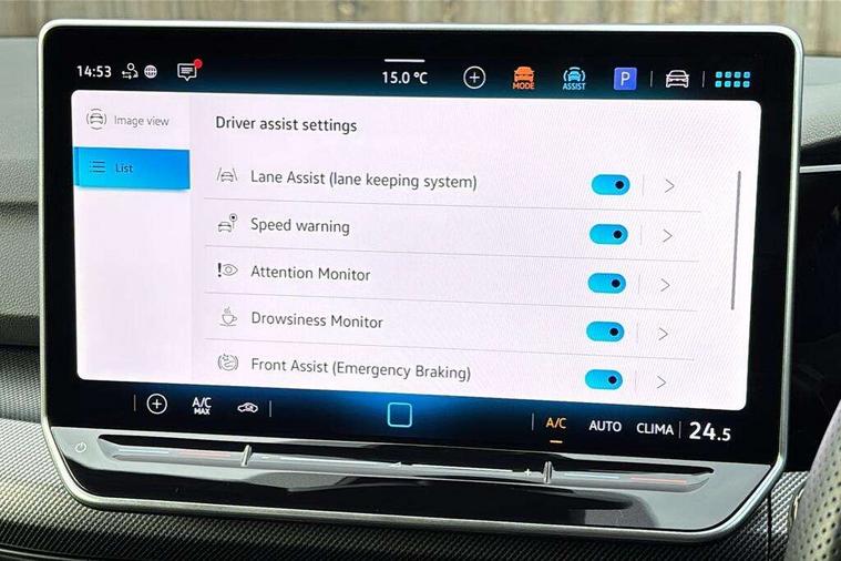 Activated carbon canister, Adaptive cruise control (ACC), Advanced driver attention and drowsiness monitor, Dynamic road sign display, Dynamic steering, E-Sim card for online connectivity, eCall emergency call system, Multi-color Digital cockpit pro, selection of different info profile possible, Multifunction front facing camera for distance control, Navigation system, Oncoming vehicle braking when turning including swerve support, Preparation for light assist system, Speed limiter, Speedo, rev counter, electronic odometer, trip, service interval display, exterior temperature and fuel gauge, Traffic jam assist, Voice enhancer and voice control, Warning signal and warning light for front and rear seatbelts not fastened, We connect plus preparation, We connect preparation, Wireless app connect, Diesel particulate filter, Hybrid propulsion system, Start-stop system with battery regeneration (recuperation - energy recovery during braking), XDS electronic differential lock for improved traction and handling, 2 USB C ports in front, 2 USB charging sockets on the centre console in the rear charging capacity upto 45W, Comfort telephony + wireless charging, without wireless aerial connection, Digital radio reception (DAB), Diversity antenna for FM reception, Gaming platform via car app, Infotainment system with 12.9" display, Mobile phone interface with inductive charging feature, 3rd brake light, Auto headlights, Automatic headlamp activation with Coming home and Leaving home feature, Body colored bumpers in R-Line style, Body colour door handles, Exterior ambient lighting with illuminated door handles, Exterior mirrors convex on the left and aspherical on the right, Front and rear electric windows, Heat insulating windshield made of laminated glass, LED daytime running lights, Rear exhaust tailpipe, Rear fog light on one side and reversing lights on both sides, Rear side wing doors, Rear windscreen washer and wiper with interval delay, Remote electrically foldable door mirrors, puddle lights and reverse activated passenger's door mirror, Welcome light with surround lighting, 12V socket in front centre console, 12V socket in luggage compartment, 3 rear head restraints, 3 seat bench in 2nd row, Ambient lighting with 30 colour including LED light unit in front footwell with selectable light colour, Brushed stainless steel pedals, Carpet mats, front and rear, Chrome plated radiator grille inserts, air vent surrounds and light switch surrounds, Front centre armrest, Integrated front head restraints, ISOFIX anchors for child seats on outer rear bench seats and on front passanger seat compatible for i-Size, Luggage compartment lighting, Plastic gear knob, Premium sports seats in front, Rear cupholder and loadthough, Single front passenger seat, Soul black instrument panel, Split folding backrest with centre armrest and unsplit rear seat bench, Storm grey roof lining, Sun visors with illuminated vanity mirrors, 3 point height adj front seatbelts + pretensioners, 3 rear three point seatbelts, ABS, Autonomous emergency braking front assist with pedestrian and cyclist monitoring, Child locks on rear doors, Driver and front passenger airbag with front passenger airbag deactivation, Electronic parking brake with auto hold, ESC (Electronic Stability Control), Extended pedestrian protection measures, Hill start assist, Rear disc brakes, Two tone horn, Tyre pressure loss indicator, Volkswagen roadside assistance, Anti theft wheel bolts, Preparation for alcohol interlock, Decorative inserts carbon grey for dashboard and front door trim panels,