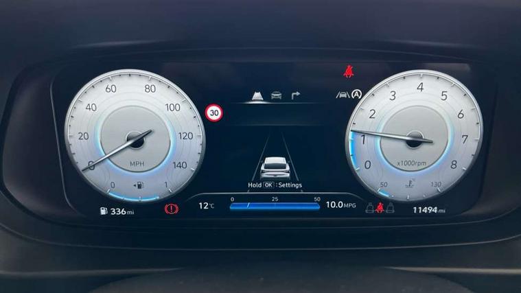 10.25" touchscreen + navigation, 2nd Gen eCall, 8" Touchscreen DAB Radio with android auto and apple carplay, Cruise control + speed limiter, Forward collision assist with car, pedestrian and cycle detection, Intelligent speed assist, Intelligent speed limit warning, Lane follow assist, Lane keep assist, PAS, Rear parking sensor, Rear view camera with dynamic guidelines, USB C port front, Automatic headlights with dusk sensor, Electric adjustable heated door mirrors, Front grille mesh pattern design, High beam assist, LED 3rd brake light, LED daytime running lights, LED Headlights, LED taillights, Rain sensor, Rear side wing doors, Rear wiper, Repositioned flat metal hyundai emblem, Trailer wiring, 3 seat bench in 2nd row, Adjustable head restraints, Air conditioning, Cloth upholstery, Floor mats, Leather steering wheel, Single front passenger seat, 3x3 point rear seatbelts, ABS with front and rear diagonally split, Autonomous emergency braking, Child locks on rear doors, Front ventilated disc brakes, Rear solid disc brakes, Tyre pressure monitoring system, 16" alloy wheels, Tyre repair kit,