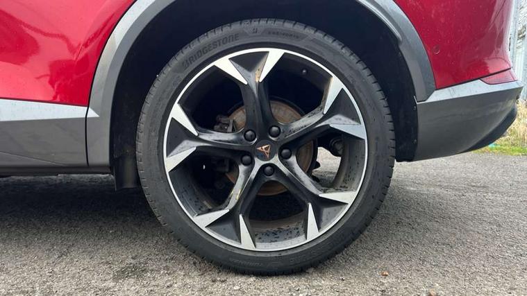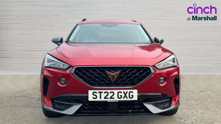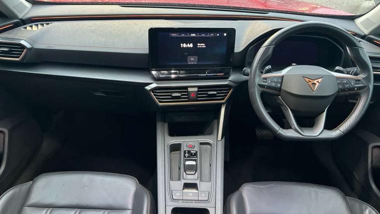 Digital cockpit and configurable dashboard, Driver alert system, Driving profile selection, E-call, Forward collision warning with automatic braking, Lane assist, Park assist (inc front/rear parking sensors), PAS, Predictive adaptive cruise control with speed limiter, Rear view camera, RPM, trip computer, outside temp gauge, instrument light brightness, low fuel warning light, lights on reminder, gearshift indicator, Service interval indicator, Start/stop system with regenerative braking, Wireless apple carplay, Wireless phone charger, Electronic locking differential and dynamic traction support, Standard suspension, 2 front and 2 rear USB type C sockets, Auxiliary input socket, DAB radio, Auto dimming rear view mirror, Body colour door handles, Body coloured bumpers, Dark grey wing mirror, Daytime running light with automatic headlight control and coming home feature, Dynamic headlight range control, Electric front/rear windows, Electrically adjustable heated and folding door mirrors with memory function, Front fog lamps with cornering function, Gloss black roof rails and window surrounds, LED Headlights, LED Taillights with dynamic indicator, Rain sensing wipers, Rear diffuser with black simulated exhaust pipes, Rear side wing doors, Rear wash/wipe, Third brake light, Tinted rear windows, Welcome lights, 12v power supply in centre console, 12V socket, 12v socket in loadspace, 2 front and 2 rear reading lights, 230V socket, 3 seat bench in 2nd row, 60/40 split rear bench seat with armrest and mechanical seat release, Dust/pollen filter, Front and rear head restraints, Front centre armrest, Height/reach adjust steering wheel, Illuminated interior front door sills, Illuminated sunvisor with mirror, Isofix, Leather multi function heated steering wheel with gear shift paddles, Luggage tie-down hooks, Single front passenger seat, Three zone climate control with control panel in rear, Variable luggage/load compartment floor, Wraparound lighting, Genuine Nappa leather Pack - Cupra, Navigation system pack with 10" navigation system - Formentor, 3 point seatbelts on all rear seats, ABS, Brake control system - ESC and brake booster, Child proof door locks, Driver and front passenger airbags with front passenger airbag de-activation, Electronic parking brake, Front and rear disc brakes, Front side curtain airbags, Hill hold control, Seat belt reminder for front and rear seats, Tyre pressure monitoring system, Anti theft alarm system, Keyless entry and start system (KESSY), Locking wheel bolts, Copper and aluminium interior detailing, 19" 'Exclusive' machined sport matte black and silver alloy wheels,