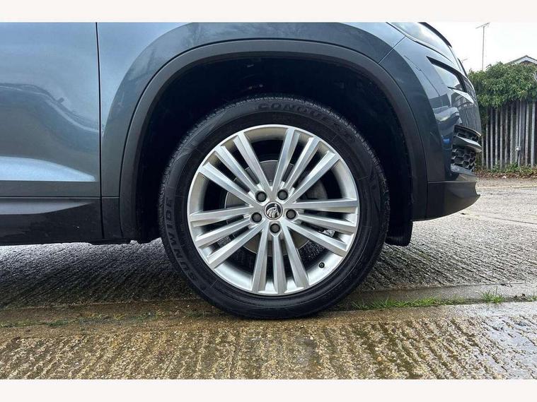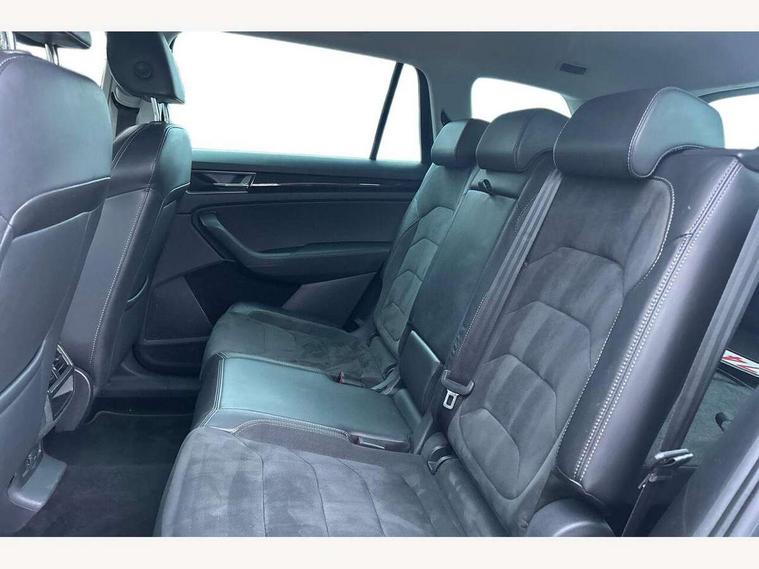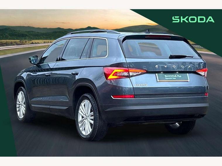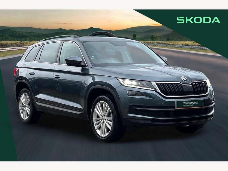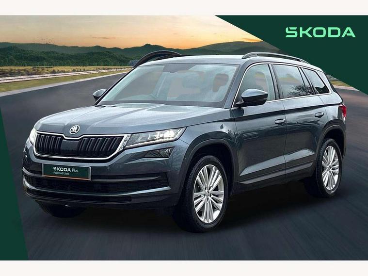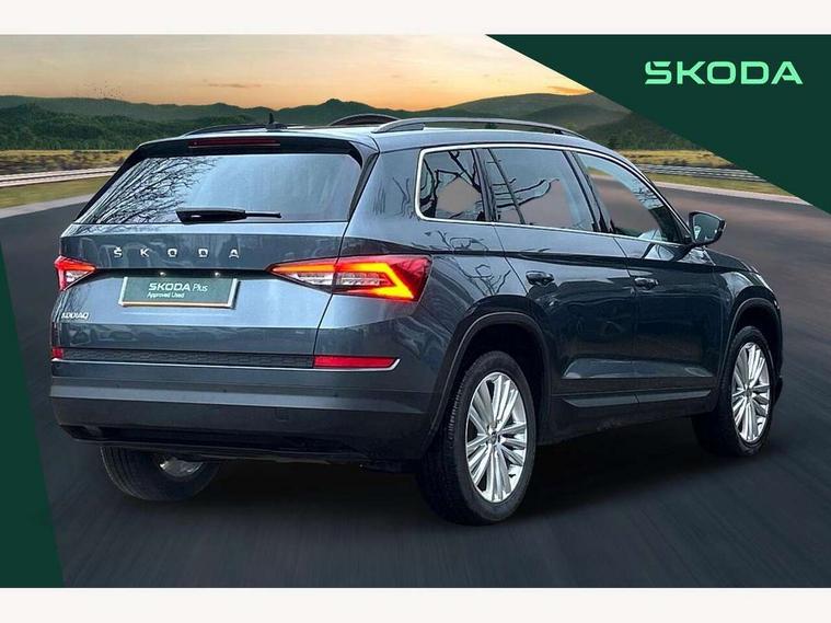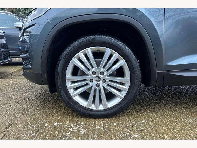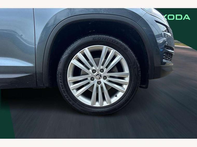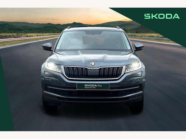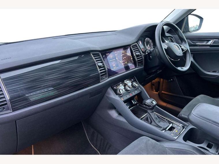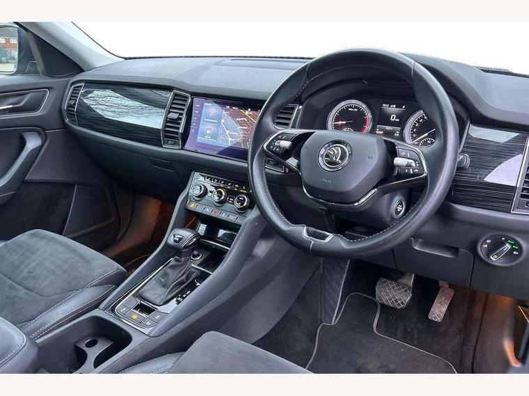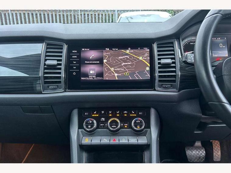 Bluetooth system, Columbus satellite navigation with 9.2" touch screen and integrated Wi-Fi + WLAN and web radio, Digital voice enhancement, ECO Stop/start function, Exterior temperature indicator, Map care, SmartLink plus, Speed limiter, USB C Port x 2 in front centre console, Bolero Radio, DAB Digital radio, DVD System, Aero front windscreen wipers with intermittent function, Aero rear window wiper, Auto dimming rear view mirror, Automatic activation of hazard warning lights, Black electric window control buttons, Black wheel arch surrounds, Body colour bumpers, Body colour door mirrors and handles, Electric front and rear windows, Electrically adjustable, heated and folding door mirrors, Front and Rear door steps, Full LED Headlights with adaptive front light system and LED daytime running lights, Headlight washers, Heated rear window, Invisible tailpipe, LED front fog lights with static cornering light function, LED rear fog light, LED third brake light in rear spoiler, Light assistant (coming home/tunnel light), Radiator grille frame in matt black with chrome strip, Rain and light sensors, Rear spoiler, Safety reflectors on front and rear doors, Sunset privacy glass, 12V socket in boot, 2 rails with 2 hooks including 4 hooks for net programme, 4 foldable roof handles with rear coat hooks, 4 lashing points on luggage floor, 60:40 foldable rear seat with sliding adjustment and backrest angle adjustment, Bottle holders in door panel in the 1.5 litre front and 1 litre rear, Cargo storage compartments, Centre console with open storage box, cup holder and 12V socket, Chrome headlight control button, Chrome interior door handles, Coat hooks on B pillar, Covered storage compartment on driver side, Front and rear door armrest with black adductor trim, Front and rear height adjustable headrests, Front centre armrest with storage compartment, cup holder and 12V socket, Front courtesy lights, Gear shift lever with chrome frame and black gloss insert, Illuminated and cooled glovebox, Illuminated luggage compartment, Isofix child seat fittings in outer rear seats with top tether, Manually adjustable steering column, Net programme in boot (1x horizontal Net, 2x vertical Nets), Overhead glasses storage compartment, Pollen filter, Rear centre armrest with cupholders, Roll up luggage compartment cover with intermediate position, Small Bags on the inner sides of the front backrests, Storage compartment in lower middle instrument panel with closing, Three rear height adjustable headrests, Ticket holder on A Pillar, Umbrella in door panel, Chrome pack - Kodiaq, Auto door release and activation of warning lights, Driver and passenger airbags, Electronic parking brake with hill hold control, Emergency rear braking signal, ESC (incl. ABS+MSR+ASR+EDS+HBA+DSR+RBS+MKB), Front and rear three point safety belt on all seats, Front assist includes AEB city/urban, Front passenger airbag deactivation switch, Front side airbags, Fuel cut off safety device, Head and knee airbags, Rear disc brakes, Safety vest holder in door, Seat belt reminder for all seats, Tailgate unlocking from outside, Two tone horn, Tyre pressure monitor, Warning lights in front doors, Alarm with interior monitoring and tilt sensor with safe function, Immobiliser, Keyless entry and start system (KESSY), Remote central locking,