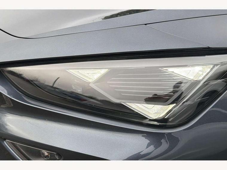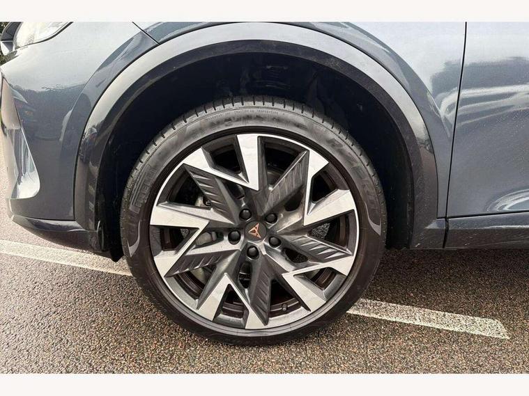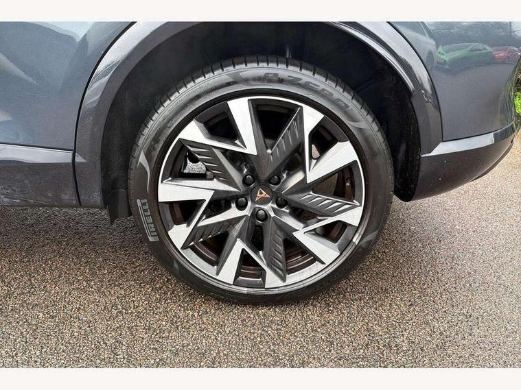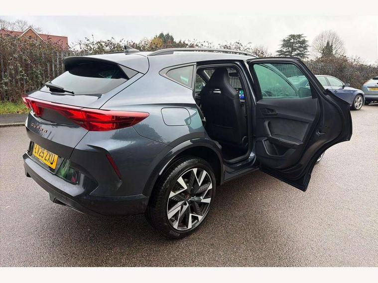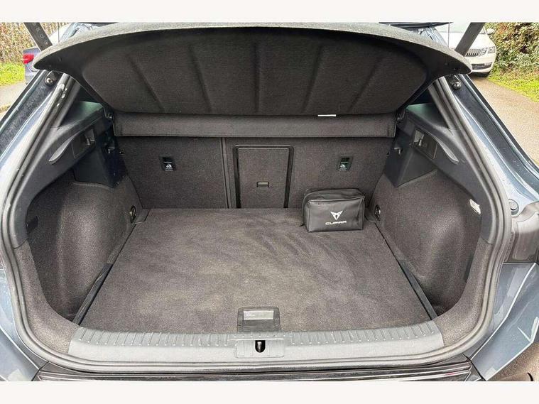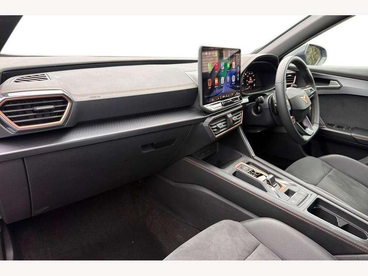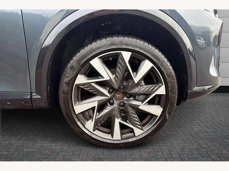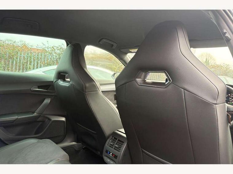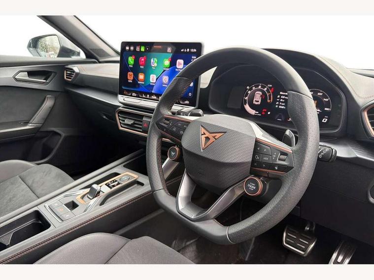 10.25" digital cockpit and configurable dashboard, Adaptive cruise control with follow-to-stop and speed limiter, Advanced driver alert system, Driving profile selection, Dynamic road sign display, Emergency steering support with turn assist, Forward collision warning with automatic braking, Front and rear parking sensors, Full link phone integration, Lane assist, Progressive steering, Rear view camera, RPM, trip computer, outside temp gauge, instrument light brightness, low fuel warning light, lights on reminder, gearshift indicator, Service interval indicator, Start/stop system with regenerative braking, Virtual pedal and electric tailgate, Voice control system, Wired Android Auto, Wireless apple carplay, Wireless phone charger, CUPRA sport suspension, Electronic locking differential and dynamic traction support, 2 front and 2 rear USB type C sockets, Media system with navigation, 12.9" touchscreen display, voice control, DAB, steering wheel mounted controls, Auto dimming rear view mirror, Body colour door handles, Body coloured bumpers, Dark grey wing mirror, Daytime running light with automatic headlight control and coming home feature, Door panel ambient lighting, Dynamic headlight range control, Electric front/rear windows, Electrically adjustable heated and folding door mirrors with memory function, Gloss black roof rails and window surrounds, High beam assist, LED 3rd brake light, LED front fog lamps with cornering function, LED Headlights, LED Taillights with dynamic indicator, Rain sensing wipers, Rear diffuser with black simulated exhaust pipes, Rear fog lights, Rear side wing doors, Rear wash/wipe, Tinted rear windows, Welcome lights (within exterior mirror housing), 12V socket, 2 front and 2 rear reading lights, 3 seat bench in 2nd row, 60/40 split rear bench seat with armrest and mechanical seat release, Black headlining, Black interior roof lining, Cupra sports pedals, Dust/pollen filter, Electrically adjustable driver's seat with memory and lumbar support, Front and rear head restraints, Front centre armrest, Heated front seats, Heated supersports multifunction leather steering wheel with satellite buttons and gear shift paddles, Height/reach adjust steering wheel, Illuminated aluminium doorsteps, Illuminated interior front door sills, Illuminated sunvisor with mirror, Isofix, Leather dashboard, door insert and side trim panel, LED smart wraparound lighting, PVC/Dinamica microfiber upholstery + bucket seats, Satellite steering wheel, Single front passenger seat, Storage pockets on rear of front seats, Three zone climate control with control panel in rear, Variable luggage/load compartment floor, 3 point seatbelts on all rear seats, ABS, Brake control system - ESC and brake booster, Child proof door locks, Driver and front passenger airbags with front passenger airbag de-activation, Electronic parking brake, Front and rear disc brakes, Front side curtain airbags, Hill hold control, Public e-call, Seat belt reminder for front and rear seats, Tyre pressure monitoring system, Anti theft alarm system, KESSY Advanced - Keyless start, keyless entry with SAFELOCK, Locking wheel bolts, Copper and aluminium interior detailing, 19" Sandstorm machined sport black and silver alloy wheels,