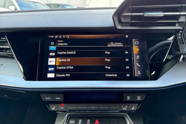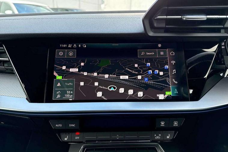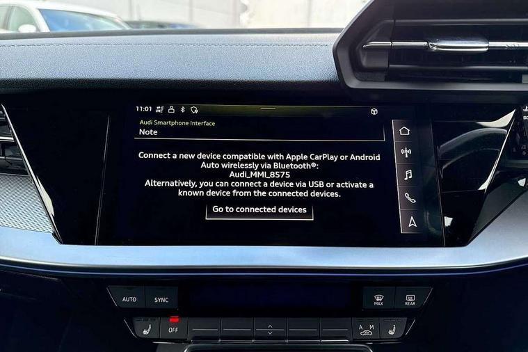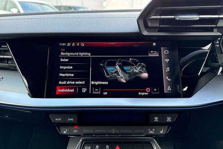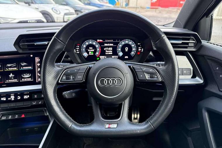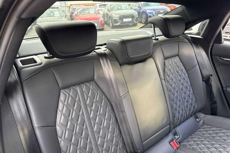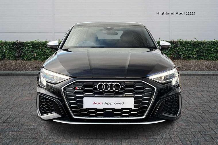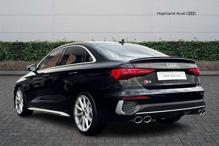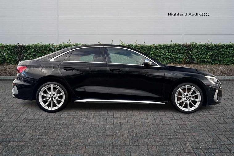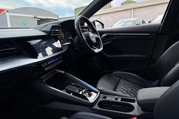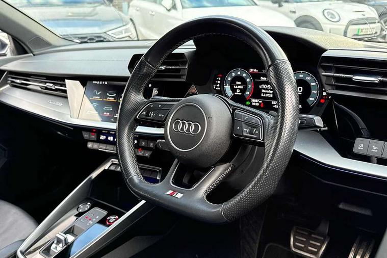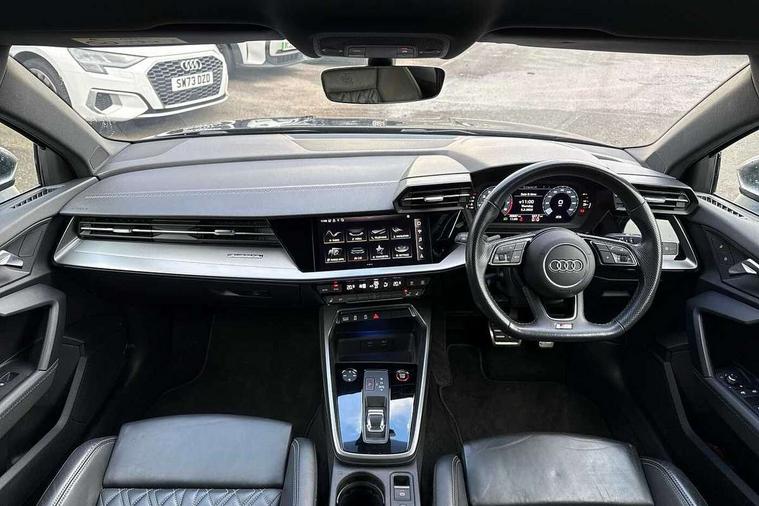 2x USB Type C ports (for charging and data transfer), Audi connect emergency call and service, Audi drive select (Auto, Comfort, Dynamic, Efficiency and Individual), Audi smartphone interface, Audi Virtual Cockpit - 10.25" digital and colour instrument cluster, Automatic start/stop system with recuperation, Bluetooth interface, Collision avoidance assistant, Lane departure warning system, MMI Navigation Plus with high resolution 10.1" colour touch screen display, Progressive steering, Service indicator, Voice control system with natural language interaction, Quattro permanent all wheel drive, S sport suspension with spring damper adjustment and lowering by 15mm, 6 passive loudspeakers, CD player, DAB Digital radio, Acoustic glass windscreen, Audi Beam uses LEDs to project the Audi logo onto the ground as you exit your S3, Auto dimming frameless rear view mirror, Dual branch oval twin tailpipes in chrome plated finish, Electrically adjustable/heated/folding/dimming door mirrors with kerb view includes integrated LED indications + kerb view function for passenger side, Front electric windows, Headlight washers, Illuminated door sills with aluminium inserts at the front with S logo, LED daytime running lights, LED headlights with LED rear lights and dynamic rear indicators, Light and rain sensors, Model and engine designation badges at rear, Privacy glass - dark tinted rear window, rear door and side windows, Rear electric windows, 12V socket and storage compartment in front centre console, 40/20/40 split folding rear seat bench with cupholder, Black cloth headlining, Dual zone electronic climate control, Front and rear centre armrest in leather, Front and rear headrests, Front/rear floor mats, Heated front seats, Height and reach adjustable steering wheel, Interior lighting - glove compartment light and right hand side, Luggage compartment floor covering, Manual boot compartment lid, Seat side bolsters, Stainless steel pedals and front footrest, Body styling design pack - S3, Storage pack - A3/S3 Saloon, 3x3 point rear seat belts, Driver and front passenger airbag with passenger airbag deactivation, Electronic Stabilisation Control (ESC) including ABS, ASR and EDL, First aid kit with warning triangle and 2 safety vests, Front side airbags with head airbags and interaction airbag, Hill hold assist, Pre-sense front with pedestrian and cyclist detection, Seatbelt monitoring, Tyre pressure loss indicator, Anti theft alarm, Anti-theft wheel bolts, Electronically operated child lock, Immobiliser, Remote control central locking, Aluminium air vent surrounds, Aluminium trim elements, Dark spectrum aluminium inlays, accent surfaces in the dashboard and centre console in platinum grey silk effect paint finish,