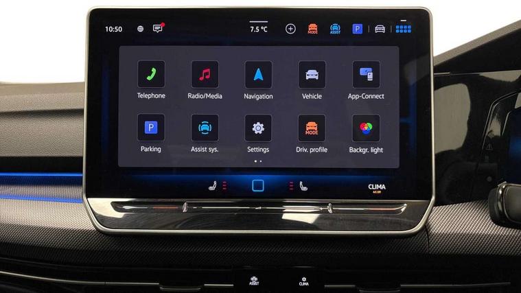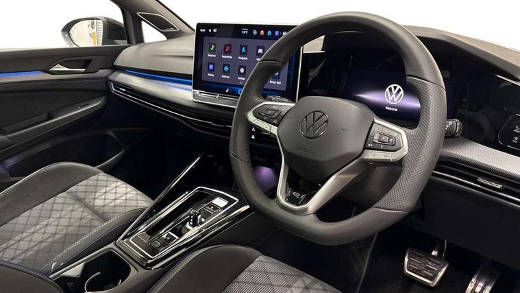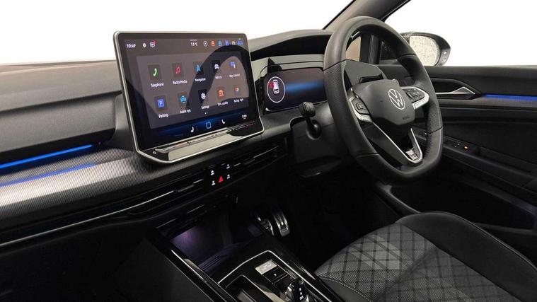 Activated carbon canister, Adaptive cruise control (ACC), Advanced driver attention and drowsiness monitor, Dynamic road sign display, Dynamic steering, E-Sim card for online connectivity, eCall emergency call system, Multi-color Digital cockpit pro, selection of different info profile possible, Multifunction front facing camera for distance control, Navigation system, Oncoming vehicle braking when turning including swerve support, Speed limiter, Speedo, rev counter, electronic odometer, trip, service interval display, exterior temperature and fuel gauge, Traffic jam assist, Voice enhancer and voice control, Warning signal and warning light for front and rear seatbelts not fastened, We connect plus preparation, We connect preparation, Wireless app connect, Hybrid propulsion system, Petrol Particulate Filter, Start-stop system with battery regeneration (recuperation - energy recovery during braking), XDS electronic differential lock for improved traction and handling, 2 USB C ports in front, 2 USB charging sockets on the centre console in the rear charging capacity upto 45W, Digital radio reception (DAB), Diversity antenna for FM reception, Gaming platform via car app, Infotainment system with 12.9" display, Mobile phone interface with inductive charging feature, 3rd brake light, Auto dimming rear view mirror, Automatic headlamp activation with Coming home and Leaving home feature, Body colored bumpers in R-Line style, Body colour door handles, Exterior ambient lighting, Exterior mirrors convex on the left and aspherical on the right, Front and rear electric windows, Heat insulating windshield made of laminated glass, LED separate daytime running light, Rain sensor, Rear exhaust tailpipe, Rear fog light on one side and reversing lights on both sides, Rear side wing doors, Rear windscreen washer and wiper with interval delay, Remote electrically foldable door mirrors, puddle lights and reverse activated passenger's door mirror, Volkswagen logo in front, illuminated lighting animation with wake up/goodbye scenario and illuminated door handles, Welcome light with surround lighting, 12V socket in front centre console, 12V socket in luggage compartment, 3 rear head restraints, 3 seat bench in 2nd row, Ambient lighting with 30 colour including LED light unit in front footwell with selectable light colour, Black roof lining, Brushed stainless steel pedals, Chrome plated radiator grille inserts, air vent surrounds and light switch surrounds, Door insert, side trim panel and arm support in leatherette, Front + rear black carpet mats, Front centre armrest, Front seat lumbar support adjuster, Integrated front head restraints, ISOFIX anchors for child seats on outer rear bench seats and on front passanger seat compatible for i-Size, Luggage compartment lighting, Manual height adjustable front passenger seat, Manually height adjustable driver seat, Plastic gear knob, Premium sports seats in front, Rear cupholder and loadthough, Sardegna cloth upholstery with front and outer rear seats Art Velour inner sides of bolsters, Single front passenger seat, Split folding backrest with centre armrest and unsplit rear seat bench, Sun visors with illuminated vanity mirrors, Titanium black instrument panel, Black exterior Styling package with Matrix LED headlights - Golf, Winter package - Golf DSG Estate/Hatchback, 3 point height adj front seatbelts + pretensioners, 3 rear three point seatbelts, ABS, Autonomous emergency braking front assist with pedestrian and cyclist monitoring, Child locks on rear doors, Driver and front passenger airbag with front passenger airbag deactivation, Electronic parking brake with auto hold, ESC (Electronic Stability Control), Extended pedestrian protection measures, Hill start assist, Rear disc brakes, Two tone horn, Tyre pressure loss indicator, Volkswagen roadside assistance, Anti theft wheel bolts, Preparation for alcohol interlock, Decorative inserts carbon grey for dashboard and front door trim panels, 18" Leeds alloy wheels, Tool kit for tyre mobility set, Tyre mobility kit Includes 12V compressor and tyre sealant,