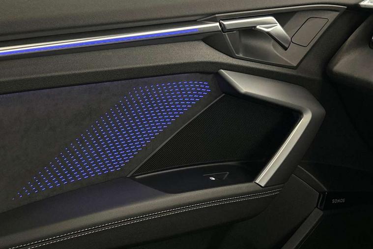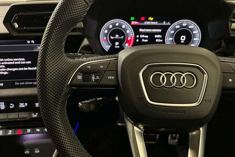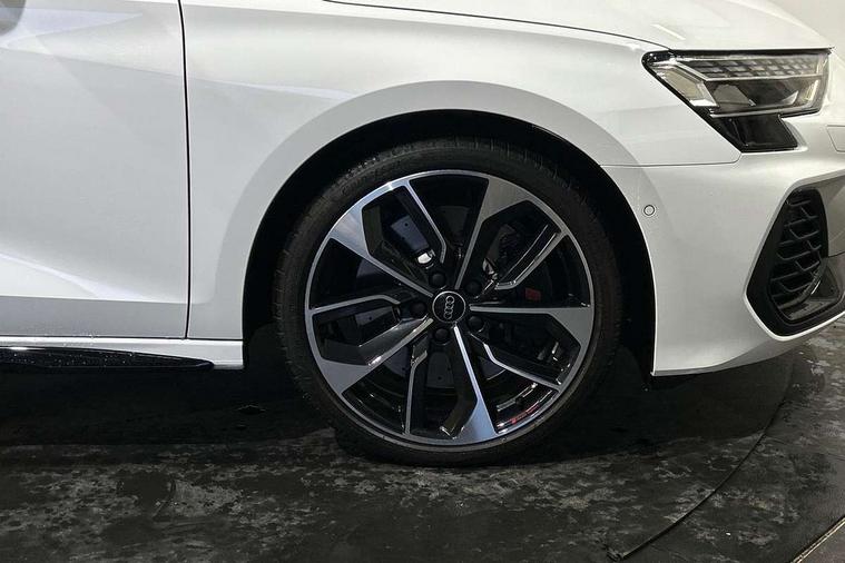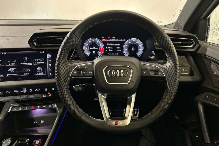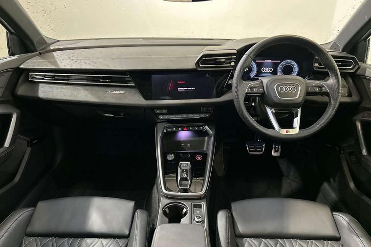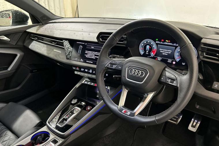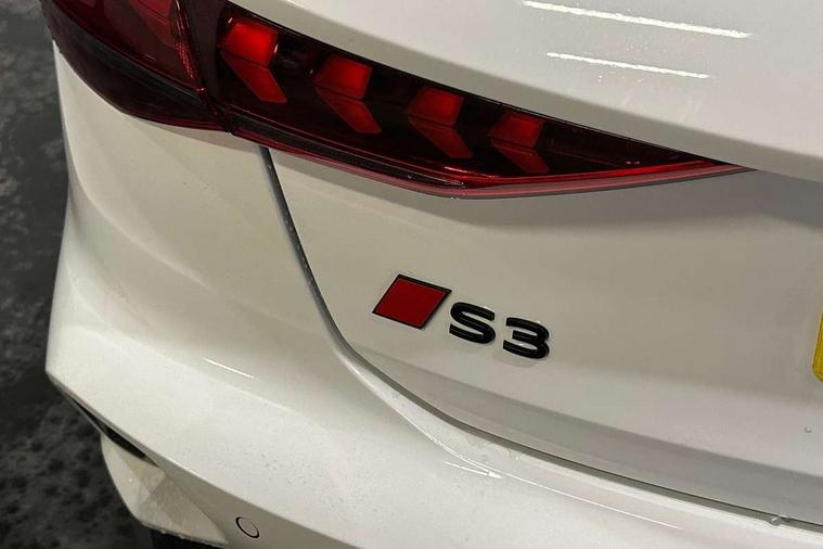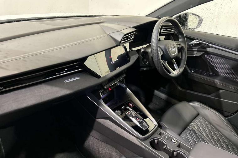 Adjustable speed limiter, Audi drive select, Audi smartphone interface with app store includes wireless Apple carplay, Android auto and Amazon alexa integration, Audi virtual cockpit plus - 12.3" full HD resolution dynamic digital instrument cluster, Automatic start/stop system with recuperation, Bluetooth interface, Camera based traffic sign recognition, Collision avoidance assistant, Distraction and Fatigue warning, e-Call (emergency call), Electromechanical power speed sensitive steering, Lane departure warning system, MMI Navigation Plus with high resolution 10.1" colour touch screen display, Park Assist with parking system Plus, Progressive steering, Service indicator, Tailgate, Trip computer, Voice control system with natural language interaction, S sport suspension with spring damper adjustment and lowering by 15mm, Audi Phonebox light with wireless charging, DAB Digital radio, USB ports with charging function in the rear, Anthracite grey Audi rings (front and rear), Audi Beam uses LEDs to project the rhombus S logo onto the ground as you exit your S3, Auto dimming frameless rear view mirror, Black accents front and rear bumpers including air inlets, Black accents in front grille and frame, Black accents window trims strips, Electrically adjustable/heated/folding/dimming door mirrors with kerb view includes integrated LED indications + kerb view function for passenger side, Exterior model badging, Front electric windows, Headlight washers, Heat insulating glass windscreen, Illuminated door sills with aluminium inserts at the front with S logo, LED 3rd brake light, LED daytime running lights, LED headlights with LED rear lights and dynamic rear indicators, Light and rain sensors, Privacy glass - dark tinted rear window, rear door and side windows, Rear electric windows, Rear side wing doors, Rear wiper, S grille, S3 front bumper with S specific air intake grilles, S3 roof spoiler, 12V socket and storage compartment in front centre console, 3 seat bench in 2nd row, 3 spoke flat bottomed leather multifunction sport steering wheel with gear shift paddles, 3-zone deluxe automatic air conditioning, 4 way electrically adjustable lumbar support for driver and front passenger, 40/20/40 split folding rear seat bench, Black cloth headlining, Fine Nappa leather upholstery with front sports seats S embossed logo, Front and rear centre armrest in artificial leather, Front and rear headrests, Front/rear floor mats, Heated front seats, Manual boot compartment lid, Manually adjustable front seats, S badging on the steering wheel, Seat side bolsters, Single front passenger seat, Stainless steel pedals and front footrest in black, Aluminium interior elements pack - A3 Sportback, Extended ambient lighting package Pro - S3 Black edition, Storage package - A3, Technology package - A3, 3x3 point rear seat belts, Driver and front passenger airbag with passenger airbag deactivation, Electronic Stabilisation Control (ESC) including ABS, ASR and EDL, First aid kit with warning triangle and 2 safety vests, Front side airbags with head airbags and interaction airbag, Hill hold assist, Pre-sense front with pedestrian and cyclist detection, Seatbelt monitoring, Tyre pressure loss indicator, Anti theft alarm, Anti-theft wheel bolts, Electronically operated child locks, Immobiliser, Remote control central locking, Inlays in black dynamica microfibre,