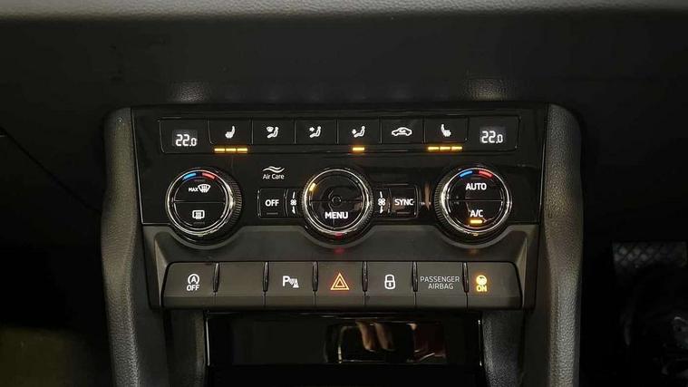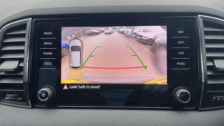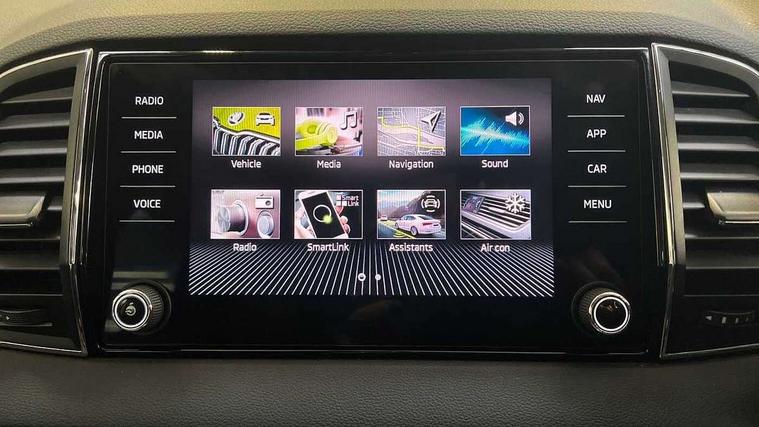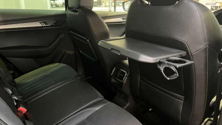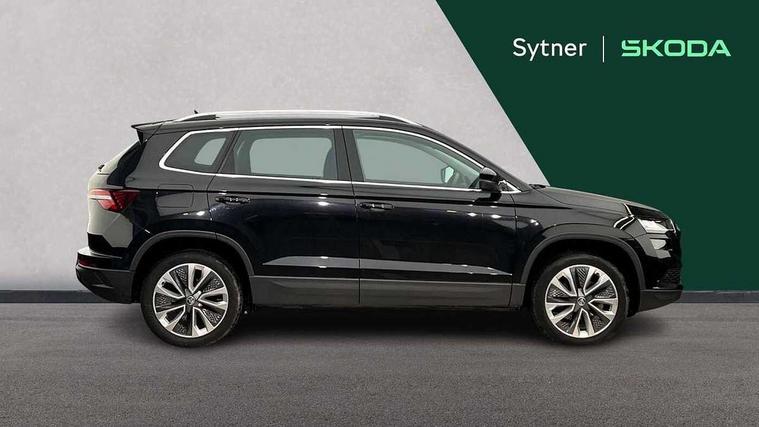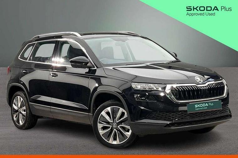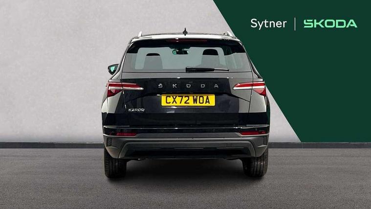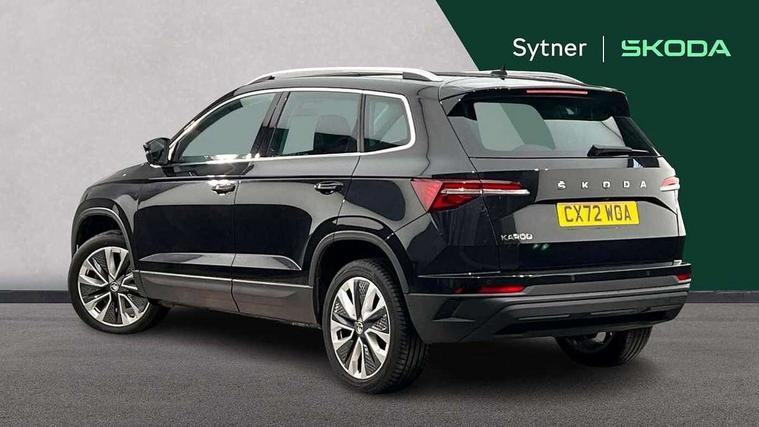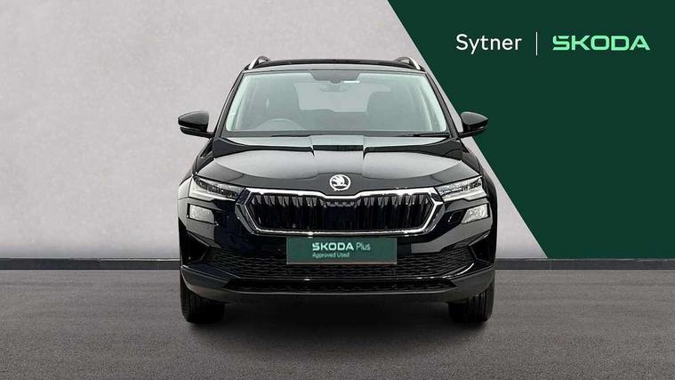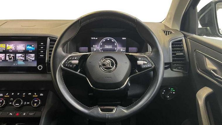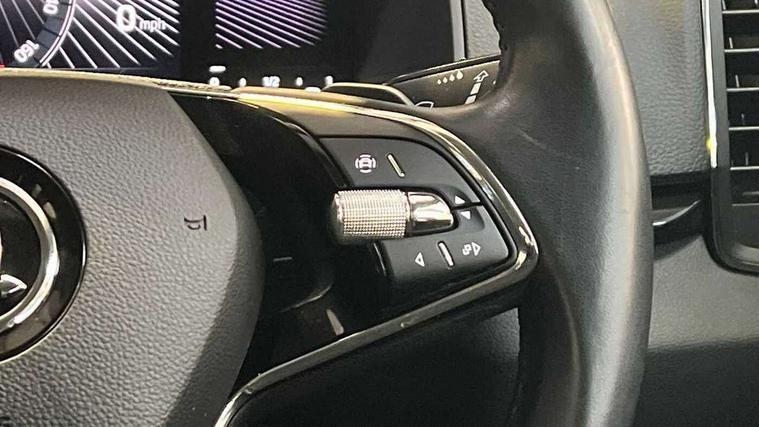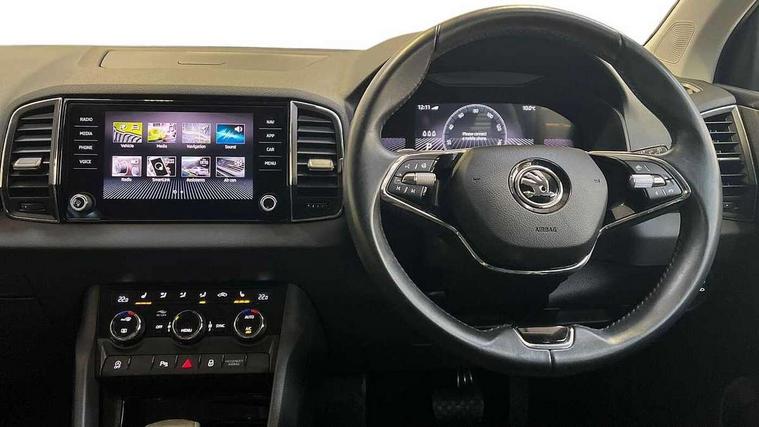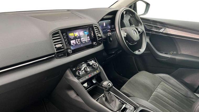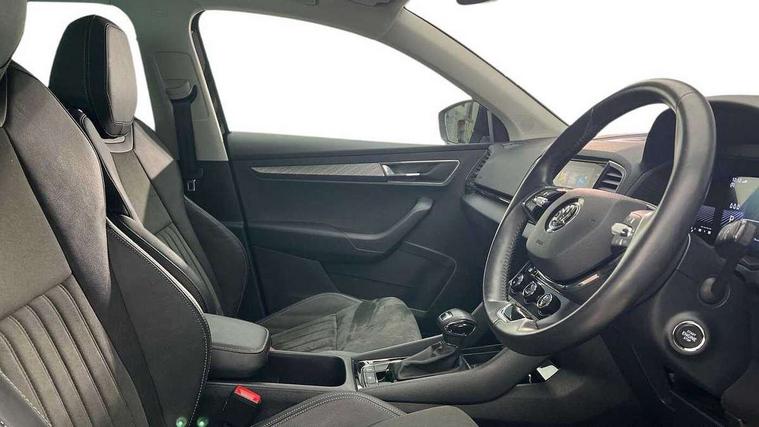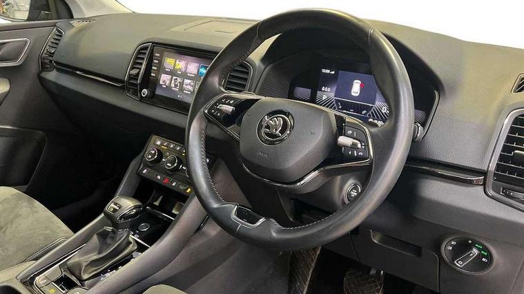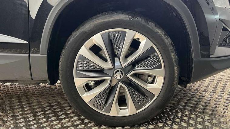 8" Digital display, Care connect, Driver fatigue sensor, Emergency services call system, Outside temperature gauge, Service interval indicator, SmartLink wireless for Apple and wired for Android, Start/stop system with regenerative braking, USB C Port x 2 in front centre console, 8 Speakers, DAB radio with Bluetooth, USB connection, Acoustic glass, Aero front windscreen wipers with intermittent function, Auto dimming rear view mirror with light and rain sensors, Black electric window control buttons, Body colour door mirrors and handles, Dynamic headlight range control with cornering light function, Electric front and rear windows with child proof lock, Heated rear windscreen, LED daytime running lights, LED rear lights with high functionality welcome effect and dynamic indicators, Light assistant (coming/leaving home/tunnel light), Plastic scuff plates, Privacy glass, Rear side wing doors, Rear spoiler, Rear window wiper with washer system and intermittent control, Safety reflectors on front doors, 1.5 litre bottle holders in driver and front passenger door panels, 12V socket in boot, 12v socket in front centre armrest with storage compartment and rear air vents, 2 Folding hooks and nets in boot, 2 spoke leather heated multifunction steering wheel with DSG paddles, 2 x Tablet holder, 3 rear height adjustable headrests, 3 seat bench in 2nd row, 4 foldable roof handles with rear coat hooks, Black floor carpet, Chrome inner door handles, Decorative door sills with KAROQ badging, Double sided boot floor, Foldable hooks in the boot, Front head restraints, Height adjustable front three point seats belts with tensioners, Height/reach adjust steering wheel, Ice scraper, Illuminated glovebox, Illuminated luggage compartment, Isofix child seat preparation for front passenger seat, Isofix child seat preparation outer rear, Manual lumbar support for front seats, Pen holder, Pollen filter, Rear boot cover, Rear reading lights, Rubbish bin door, Safety vest holder, Single front passenger seat, Storage box in upper central dashboard closed, Sunvisors with illuminated vanity mirrors, Textile floor mats, Ticket holder, VarioFlex seats with standard rear seat release, Chrome roof rails + chrome pack - Karoq, Parking pack - Karoq, Automatic door unlocking in case of crash, Automatic fuel cut off in case of crash, Child locks on rear doors, Driver airbag, Electronic parking brake with auto hold function, Emergency rear braking signal, ESC including ABS, MSR, ASR, EDS, HBA, DSR, RBS, MKB and traction control, Front side airbags, Hill hold control, Knee airbags, Passenger airbag with switch-off function, Pedestrian monitor, Seatbelt reminder signalisation and pretensioner for all seats, Three point seatbelts rear, Two tone horn, Tyre pressure display, Tyre pressure monitor, Alarm with interior monitoring, back up horn and tilt sensor with safe function, Electronic engine immobiliser, Keyless entry and start/stop, Remote central locking with 2 remote folding keys, Chrome framed air vents, 18" Procyon silver alloy wheels with anthracite aero inserts, Anti-theft wheel bolts protection, Storage on wheel cover, Tool kit,