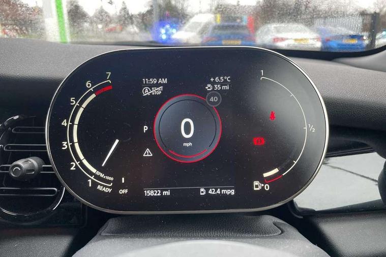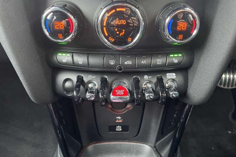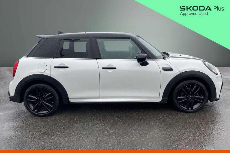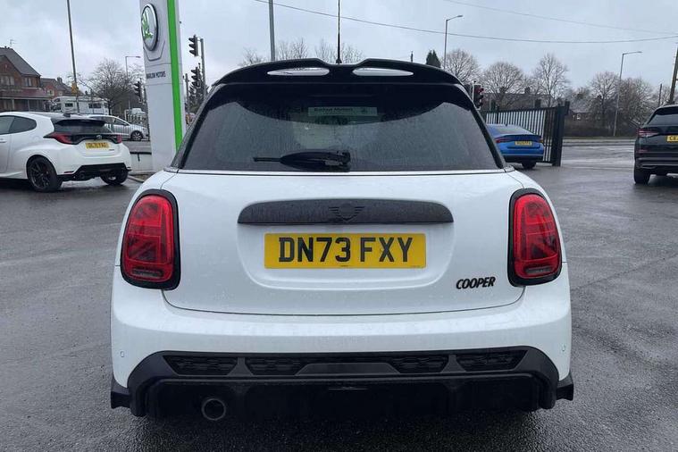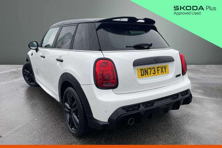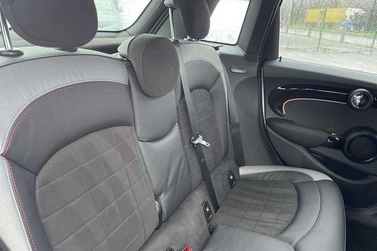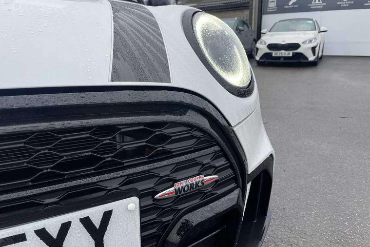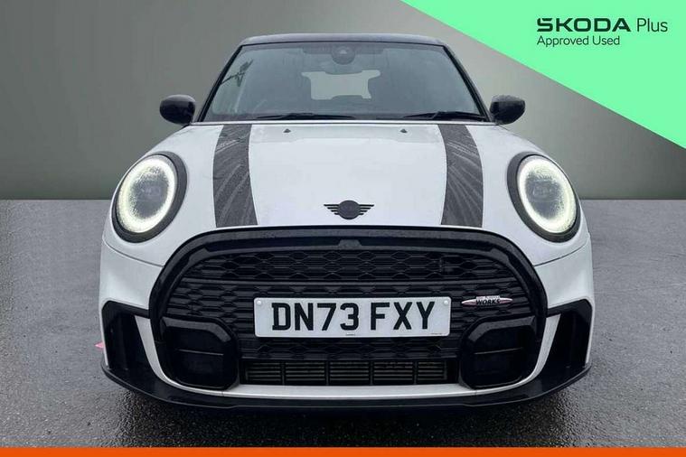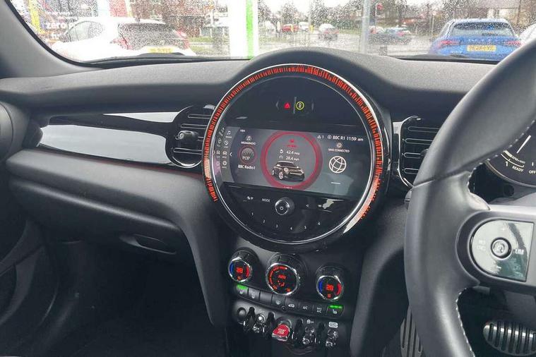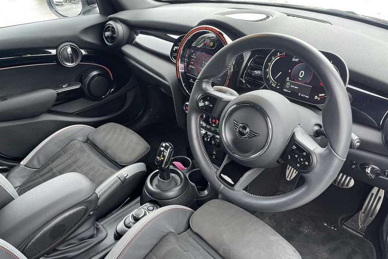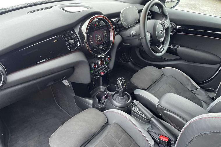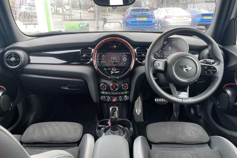 Apple CarPlay, Automatic start/stop function with brake energy recuperation, Compatible mobile phone bluetooth with audio streaming, Electro-mechanical speed dependant steering assistance, Flexible car sharing preparation, MINI Driving Modes - centre toggle switch to control driving setting (sport, mid and green), Mini E-call, MINI TeleServices, On board computer, Rear park distance control, Service interval indicator, Adaptive suspension, Double Vanos system, Fully variable valve control, Gear change indicator display, High precision injection, Performance Control, Steptronic transmission with double clutch, 8.8" touchscreen with LED ring, FM tuner and DAB digital radio, 3rd brake light, Automatic headlight activation switch, Body colour fuel filler cap, Chrome border high gloss black slats radiator grille, Dynamic brake lights, Electric front+rear windows, Exhaust tailpipe on left with chrome finisher, Heated rear window, Heated windscreen washer jets, JCW Aerodynamic kit - Front and rear bumpers with sporty JCW styling and part-painted side sills with MINI John Cooper Works door sill finishers, John Cooper Works rear spoiler, Metal door sill strips with MINI imprint, Model logo Cooper on right of tailgate, Rain sensor window wipers, Rear fog lights, Rear LED lights with union jack design, Rear side wing doors, Rear window wiper, Side scuttle panel with integrated indicator, Sun/heat protection glass, White indicator lenses, 12V Accessory socket in centre console, 3 seat bench in 2nd row, 4 lashing eyes in luggage compartment, 60/40 split folding rear seat, Anthracite headliner including grab handles and clothes hooks, Carbon black colour line - Knee roll and door armrest, Chrome interior highlights, Cupholders, Front and rear isofix with front passenger airbag deactivation, Front and rear velour floor mats, Glove compartment, Height and length steering column adjustment, Interior lighting with 12 different colours across the dashboard, underneath door bezel with illuminated laser-engraved design on central display, JCW Sport seats with integrated headrests, adjustable thigh support and John Cooper Works logo, Leatherette gearshift lever and handbrake gaiters, LED reading lights, vanity mirror lights, front foot well light and spotlight on front seats, Mechanical seat adjustment - forward/back & backrest for front seats and driver seat height adjust, Multifunction steering wheel, Single front passenger seat, Storage compartments in doors, Sunvisors with vanity mirrors, Walknappa leather steering wheel with grey seam and John Cooper Works badge on Piano Black lower steering wheel spoke, Piano black exterior pack - Mini Hatchback Cooper, 3 point seatbelts on all five seats, 6 Airbags - front, side, head and seat belt tensioners, Anti-lock braking system (ABS), Child locks on rear doors, DSC - Dynamic Stability Control, Front and rear disc brakes, Hill start assist, Single tone fanfare horn, Tyre pressure monitoring system, Alarm system with tilt sensor, monitoring doors, bonnet interior and tailgate, Electronic vehicle immobiliser, Start/stop toggle with keyless go, Piano black interior trim, Tool kit,