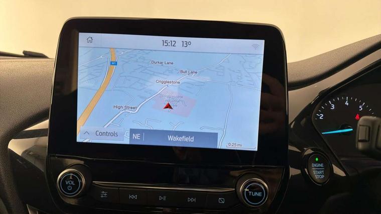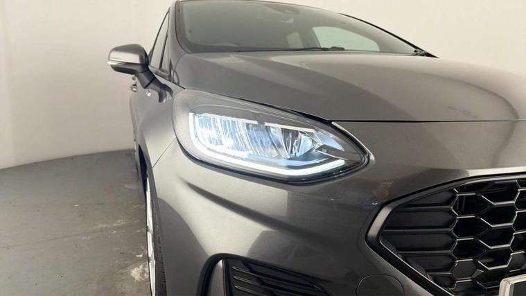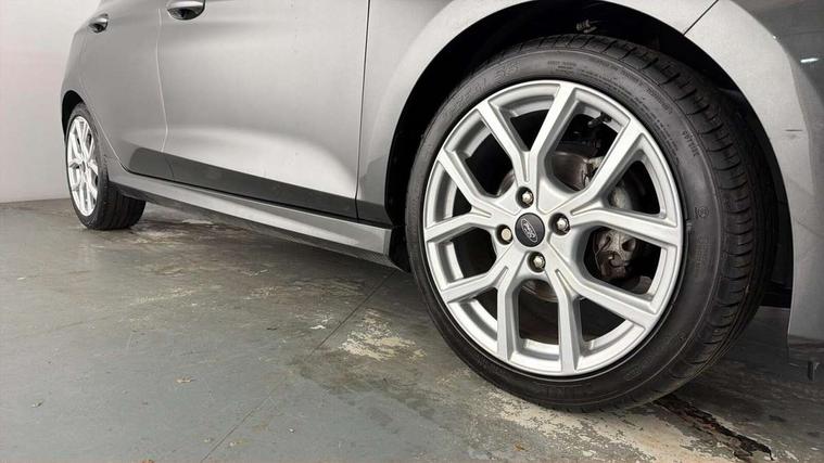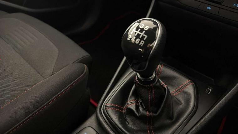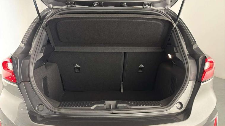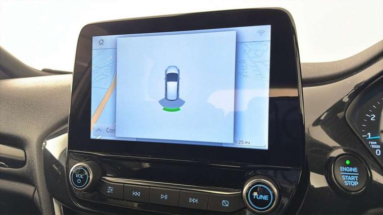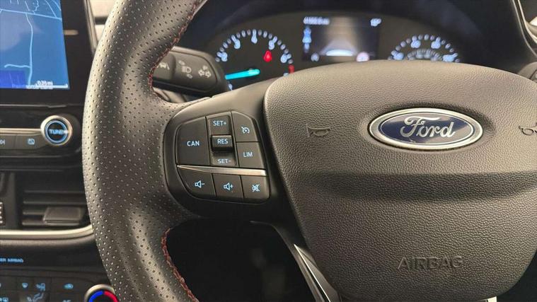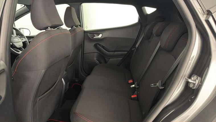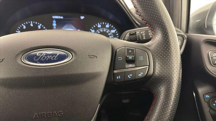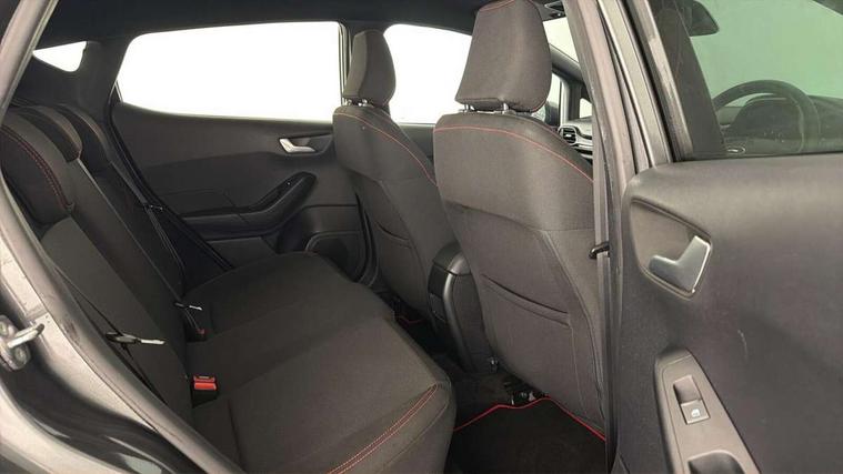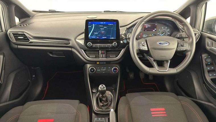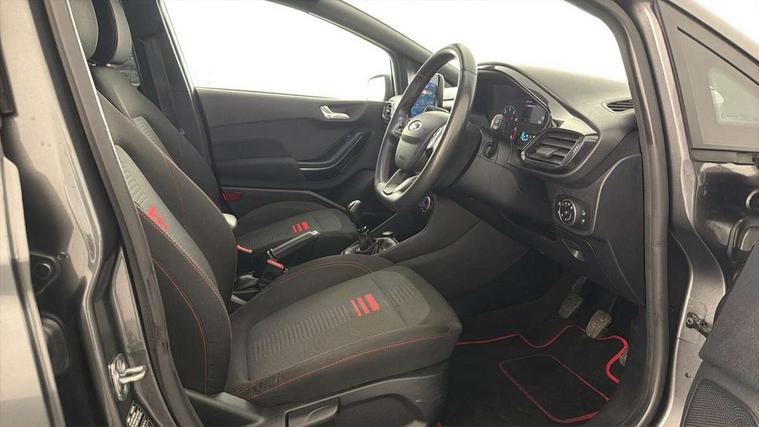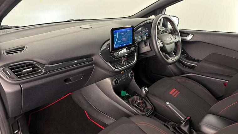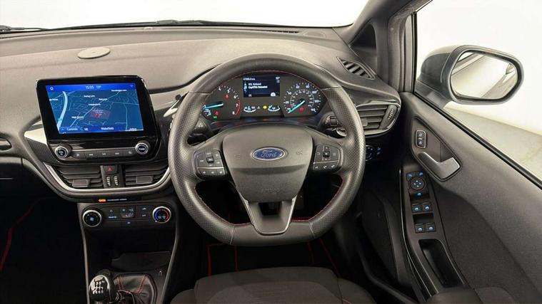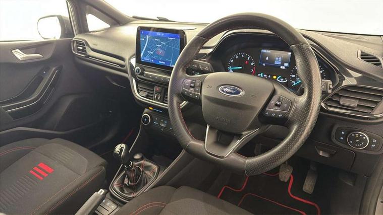Bluetooth system, Electric power steering, Ford easy fuel, Ford SYNC 3 Navigation system incl 8" touchscreen, 7 speakers, FordPass connect, Apple carplay, android auto, voice control and emergency assistance, Rear parking distance sensors, Selectable drive modes (Normal, Sport, Track), Trip computer, Sports suspension, 2 USB ports, Auxiliary input socket, DAB Digital radio, Steering wheel mounted controls, Body colour bumpers, Body colour door handles, Body colour large rear spoiler, Body coloured electrically operated and heated door mirrors with side indicators, Cornering front fog lights, Electric front windows/one touch facility, Electric rear windows, LED Night signature to rear lights, Quickclear heated windscreen, Rain sensing wipers and auto dimming rear view mirror, Rear privacy glass, Rear wiper, Unique ST-Line upper grille & full bodystyling kit with ST-Line wing badges, 3 spoke flat bottomed leather steering wheel, 60/40 split folding rear seat, Adjustable head restraints, Black headlining, Boot carpet, Centre console with opening armrest, 2x cupholders, 12v and USB, Chrome inner door handles, Cloth upholstery, Footwell illumination, Front floor mats in velour, Front map reading lights, Front seat and rear pockets, Illuminated glovebox, Leather gaiter, Load area light, Manual 2 way passenger seat adjust, Manual 4-way driver seat adjust, Manual air conditioning, Overhead console with sunglasses holder, Pollen filter, Rake/reach adjustable steering wheel, Sensico wrapped steering wheel, Sports front seats, NCAP Pack - Fiesta, 3 point seatbelts on all rear seats, ABS+EBA, Curtain airbags, Driver and passenger airbags, Drivers knee airbag, Electronic stability control with hill start assist, Front passenger airbag deactivation, Front side airbags, Seatbelt warning, Two tone horn, Tyre pressure monitoring system, Keyless start with 'Ford Power' starter button, MyKey system, Remote central locking & engine immobiliser, Thatcham Cat.1 alarm, 17" 5 spoke alloy wheels with rock metallic finish,
