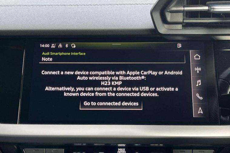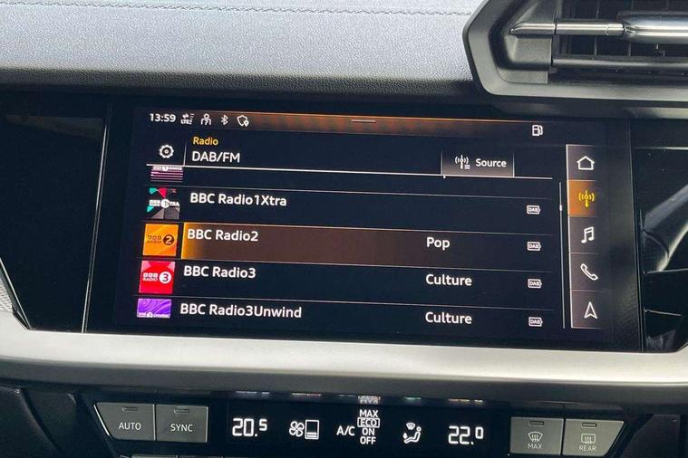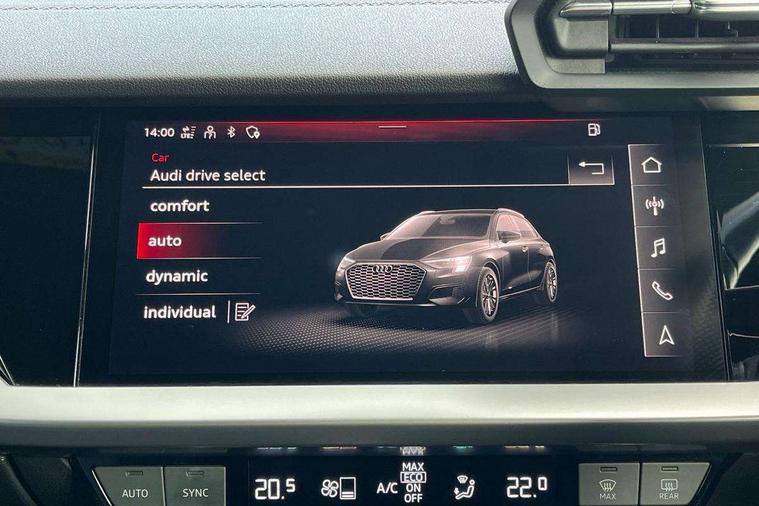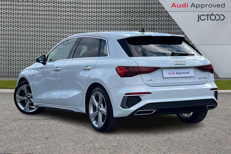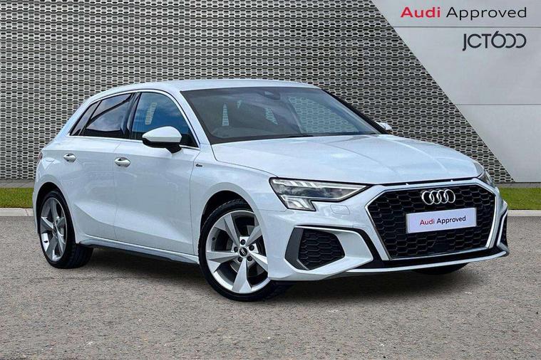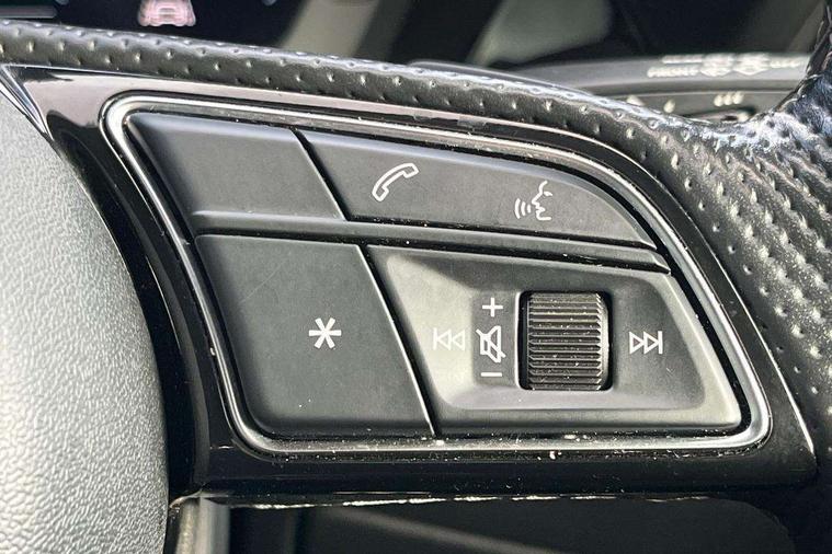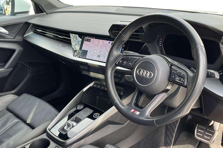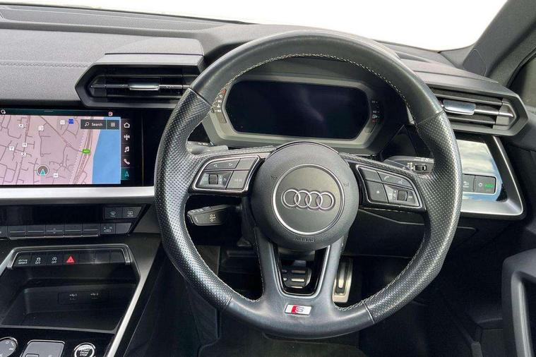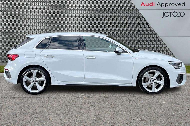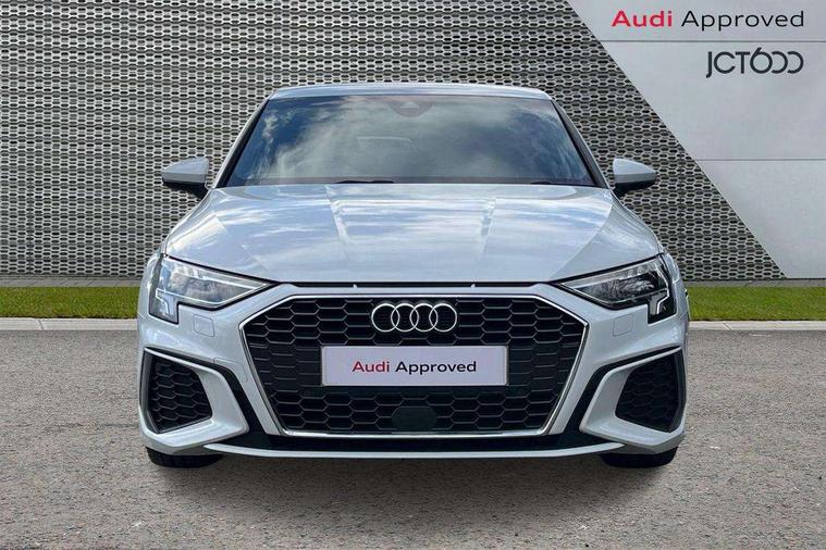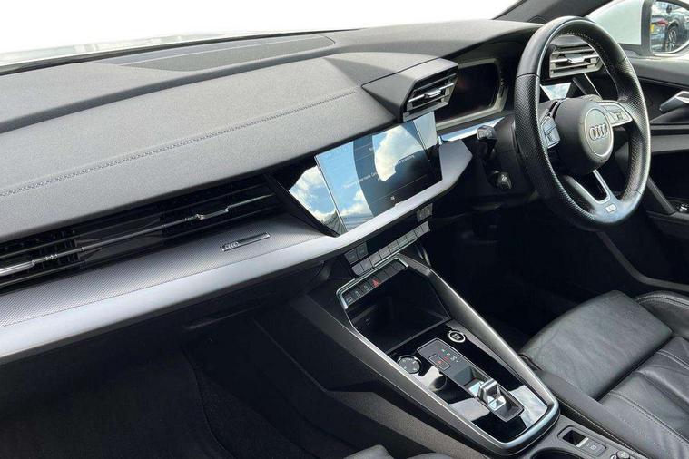 Audi connect emergency call and service, Audi drive select (Auto, Comfort, Dynamic and Individual), Audi smartphone interface, Audi Virtual Cockpit - 10.25" digital and colour instrument cluster, Automatic start/stop system with recuperation, Bluetooth interface, Collision avoidance assistant, Cruise control, Electromechanical power speed sensitive steering, Lane departure warning system, MMI Navigation Plus with high resolution 10.1" colour touch screen display, Rear parking sensors, Service indicator, Trip computer, Voice control system with natural language interaction, 2xUSB-C connection with data and charging functions, 6 passive loudspeakers, DAB Digital radio, Acoustic glass windscreen, Aluminium window trim, Auto dimming frameless rear view mirror, Body colour exterior mirrors, Electrically adjustable/heated/folding/auto dimming door mirrors with integrated LED indications + kerb view function for passenger side, Front electric windows, Illuminated aluminium inserts front door sills with S logo, LED daytime running lights, Light and rain sensors, Privacy glass - dark tinted rear window, rear door and side windows, Rear electric windows, Rear side air outlets in grained matt black, Rear wiper, S line bumpers, S roof spoiler, 12V socket and storage compartment in front centre console, 40/20/40 split folding rear seat bench with cupholder, Black cloth headlining, Dual zone electronic climate control, Front and rear centre armrest in leather, Front and rear headrests, Front/rear floor mats, Height and reach adjustable steering wheel, Interior lighting - glove compartment light and right hand side, Luggage compartment floor covering, Manual boot compartment lid, Manually adjustable front seats, Seat side bolsters, Stainless steel pedals and front footrest, Twin leather upholstery with front sports seats S embossed logo, Aluminium interior elements pack - A3 Sportback, S line styling pack - A3 Sportback, 3x3 point rear seat belts, Driver and front passenger airbag with passenger airbag deactivation, Electronic Stabilisation Control (ESC) including ABS, ASR and EDL, First aid kit with warning triangle and 2 safety vests, Front side airbags with head airbags and interaction airbag, Hill hold assist, Pre-sense front with pedestrian and cyclist detection, Seatbelt monitoring, Tyre pressure loss indicator, Anti theft alarm, Anti-theft wheel bolts, Electronically operated child lock, Immobiliser, Remote control central locking, Accent surfaces in the dashboard and centre console in platinum grey silk effect paint finish, Dark spectrum aluminium inlays,