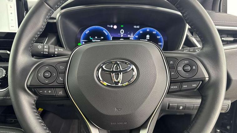 10.5" Multimedia display screen, Blind spot monitor and safe exit assist, Bluetooth telephone connectivity, Connected car functionality upgrade, tracker, remote status and e-care, Drive mode select (Eco, Normal), E-call, Electrically assisted power steering, EV drive indicator, Front and rear parking sensors with auto brake, Full Digital 12.3" TFT Digital Combimeter, Head up Display, Key reminder warning, Lane Departure Alert (LDA) switch on steering wheel, Memory on adjustable speed limiter, MyT connected services, Proactive driving assist (PDA), Rear cross traffic alert, Reversing camera, Smart entry and push button start, Smartphone integration with Apple CarPlay and wired android auto, Tailgate, Toyota remote services, Toyota smart connect navigation, Wireless charger, Gasoline particulate filter, Vehicle Stability Control (VSC), AM/FM radio, DAB Digital radio, Front USB-C in centre console, Front USB-C in dashboard, JBL Premium sound system with 8 speakers, Rear USB-C device charger, Smart voice assist/ Voice recognition, USB and Aux in connectors + 12V front outlet, Adaptive high beam system (AHS), Anti-jam protection on power windows, Auto headlight levelling system, Auto up and down function on all power windows, Automatic folding mirrors, Automatic headlights with high beam assist, Black centre and side air vents, Black metallic meshed front grille, Black toyota logo in front, Body coloured bumpers, Body coloured door mirrors, Body coloured front spoiler, Body coloured outside door handles, COROLLA alloy door scuff plates, Electrochromatic mirror, Follow me home headlights, LED daytime running lights, LED front fog lights, LED High mounted stop light, LED multi beam headlights, LED rear combi lights with LED lightguide, Noise reduction layer on windscreen, Piano black diffuser, Power adjustable heated door mirrors, Power front windows, Power rear windows, Privacy glass with UV filter, Rain sensing wipers, Rear bumper decoration with chrome plated inserts, Rear side wing doors, Rear under guard with chrome ornament, Rear window defogger, Rear window wiper, Reverse tilting door mirrors, Roof spoiler, Satin chrome insert on front air vents, Satin chrome insert on front door assist grips, Satin chrome inserts on rear passenger air vents, Shark fin antenna, Tailgate release with push button, Time adjustment on intermittent wiper, Turning signal integrated indicators in door mirrors, Unique grille pattern, Unique lower skirt, Unique side rocker with black insert, UV-filter on driver and passenger windows, 2 Shopping bag hooks in luggage compartment, 3 rear headrests, 3 seat bench in 2nd row, 3 spoke leather steering wheel with satin insert + gear knob, 4 tie down hooks in luggage compartment, 60/40 split folding rear seat, Adaptive cruise control (ACC) switch on steering wheel, Adjustable speed limiter switch on steering wheel, Audio, multimedia and telephone switches on steering wheel, Black armrest on centre console box, Black gear shift console, Boot light, Boot underfloor storage, Centre room light, Driver and front passenger personal light, Driver and passenger assist grip, Driver and passenger seatback pockets, Driver and passenger sun visor with mirror and light, Dual zone automatic air conditioning with ECO mode switch, Front and rear cup and bottle holders, Front door pockets, Front head restraints, Front passenger seat, Front sliding synthetic leather armrest, Heated seats, Illuminated entry system in room lamp, ISOFIX seat fixing (2 fixings on rear outer seats), Leather gear shift with satin chrome on gear shift console, Manual height adjustable for driver and front passenger seat, Manually tilt with sliding driver and front passenger seat, Nanoe-X air purifier, Paddle shifts, Parcel shelf, Perforated leather upholstery, Pollen filter, Power window switches with satin chrome inserts, Rear air conditioning, Rear armrest with 2 cupholders, Rear passenger coat hooks (2), Remote air conditioning, Satin chrome inside door handles, Satin chrome surround on heater control panel, Satin chrome surround on speedometer, Sliding armrest on centre console box, Slow opening glovebox with lights, Sports seats, Textile floor mats, Tilt/telescopic steering column, Voice recognition switch on steering wheel, Whiplash Injury Lessening (WIL) feature (active headrest) for seats, White ambient lighting on open tray and front cup holder, Toyota safety sense 3 pack - Corolla, 3x3 point rear seatbelts, Adjustable driver and front passenger seat belt extender to top anchor point, Anti lock braking system + Electronic brake force distribution, Brake assist function, Child locks on rear doors, Downhill Assist Control (DAC), Electronic parking brake, Emergency brake light signal (EBS), Front passenger airbag on/off switch, Front seatbelt reminder, HAC - Hill start assist control, Rear seat belt reminder, Seatbelt pretensioners and force limiters, Supplemental restraint system (SRS) 7 airbags - dual driver, dual side curtain, side impact and driver knee airbags, Traction control, Tyre pressure warning system, Acoustic vehicle alert system (AVAS), Alarm with motion sensor and immobilizer, Power passenger window lock, Remote central locking + deadlocks, Satin chrome dash trim, Soft touch texture on upper dashboard, Stitching on lower dashboard, Stitching on upper dashboard, 18" Dark grey machined face 5 double spoke alloy wheels, Tyre repair kit, Unique wheel finish with red wheel cap,