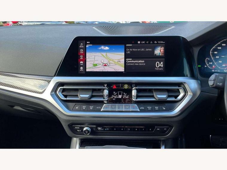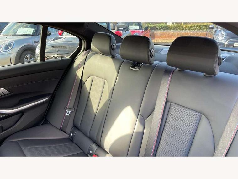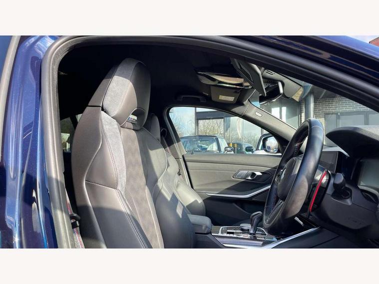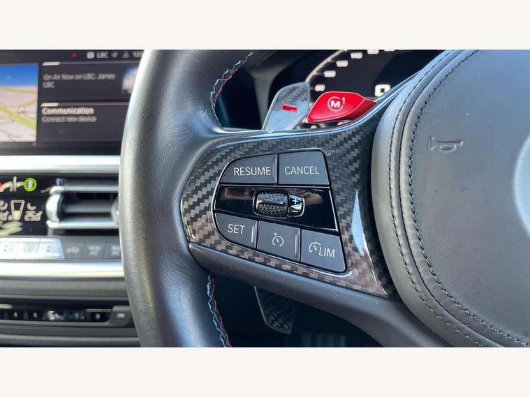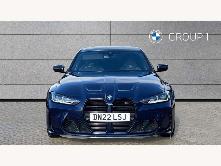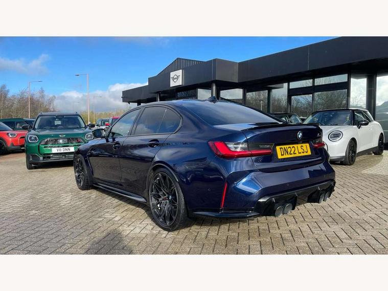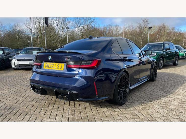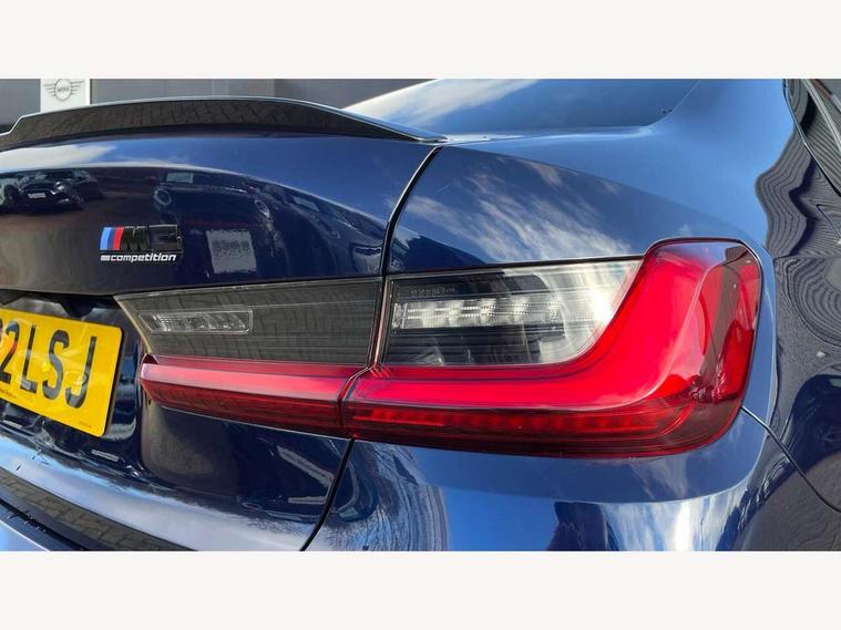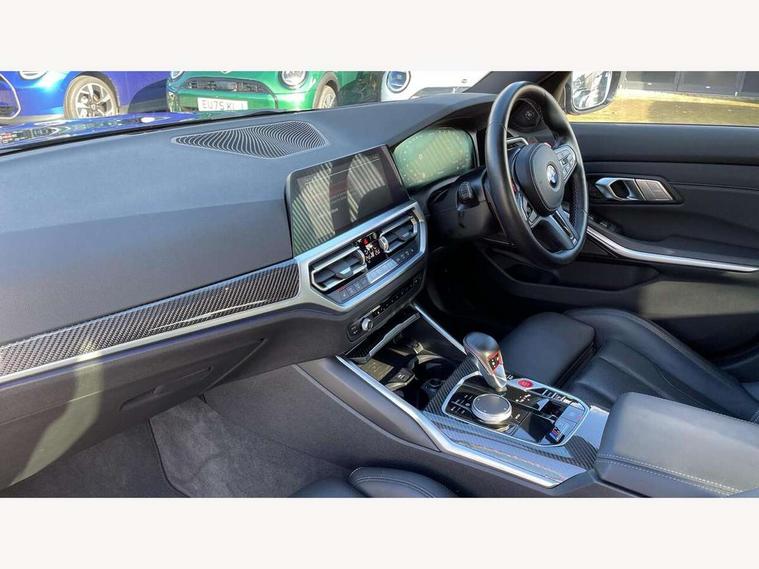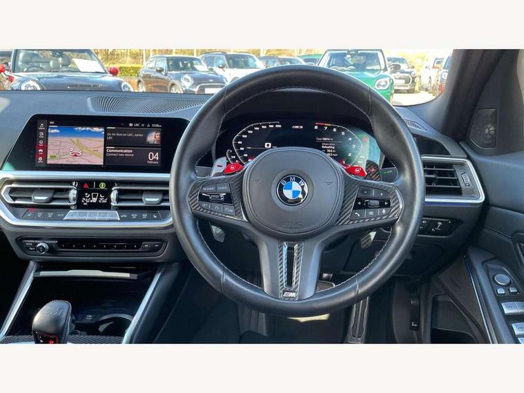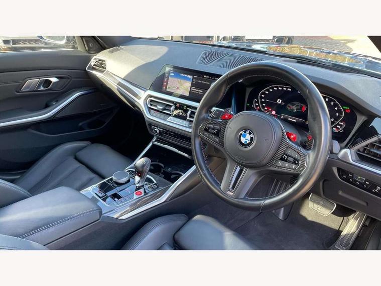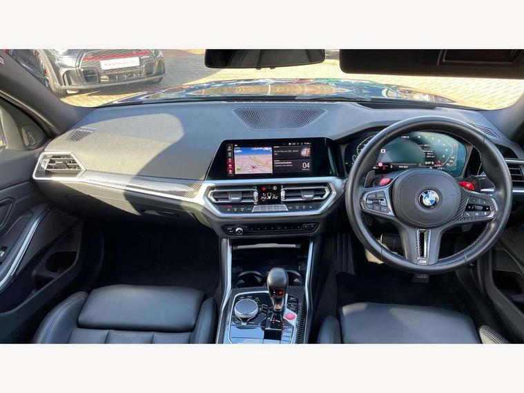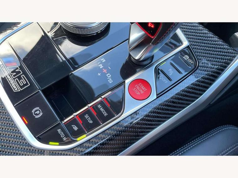 Active guard plus, Automatic start/stop system, Bluetooth functionality with Apple CarPlay/Android Auto, BMW iDrive controller on centre console, BMW legal emergency call, BMW Live Cockpit Professional sat nav system with 12.3" instrument display and high resolution control display, BMW Online services, BMW Teleservices, Brake pad wear indicator warning light, Condition based service, Connected drive services, Door/boot open warning light, Driving experience switch, Electric Power Steering (EPS) with Servotronic, Instrument cluster with extended contents, Lights on warning, M drive buttons, Oil sensor for level and grade, warning by check control system, Oil temperature gauge, On board computer, On board diagnostics, Optimum shift indicator, Outside temperature display, Pull away assistant, Run flat indicator, Service interval indicator, Speed limiter, Widescreen display, Adaptive M Sport suspension, Double joint spring strut front axle, Electronic differential lock control (EDLC), M Drive Professional including track mode, laptimer, traction control & Drift analyser, M Sport differential, M steptronic sport transmission with drivelogic, Safety battery terminal clamp, 8 programmable favourite buttons, Auxiliary point for auxiliary devices, BMW professional radio/CD/MP3, DAB Digital radio, Harman/Kardon loudspeaker system, 3rd brake light, Acoustic glazing, Auto dimming driver's door mirror, Auto dimming rear view mirror, Automatic headlights + automatic windscreen wipers, Black chrome exhaust tailpipes, Black model designation badges, BMW emblem on engine compartment lid and tailgate, BMW high gloss shadow line with extended contents, BMW Individual shadowline lights, Body colour bumpers, Body colour door handles, Carbon fibre reinforced plastic (CFRP) roof, Day time running light, Door mirror integrated indicators, Door sill finishers with aluminium inserts, Dynamic brake lights, Electric adjustable heated door mirrors, Electric folding door mirrors, Electric front and rear windows with one touch/convenient open/close function, Follow me home headlights, Front and rear apron plastic in body colour, Front and rear bumper system, Headlight beam throw control, Heat protection, sun protection glazing, Heated rear window with automatic switch off, High beam assistant, High gloss black frameless kidney grille with M badge, LED number plate light, LED tail lights with 3D L-shaped LED light design, M designation, Mirror glass aspheric on driver's side, convex on passenger side, Rear boot, Rear fog lights, Rear reflectors, Rear right M3 competition inscription, Rear side wing doors, Reversing light, Shark fin roof aerial, Strakes in front side panel, black matt/black high-gloss, with model badge, Visible VIN plate, Welcome lighting, Windscreen wipers with integrated washing jets, 2 cupholders in front centre console, 2 x 12 V Power sockets (luggage compartment and front centre console), 2 x USB Type C ports for charging and data transmission in front centre console, 2 x USB Type C ports for charging in rear centre console, 3 folding rear headrests, 3 seat bench in 2nd row, Ambient lighting, Anthracite headlining, Battery in luggage compartment, Carbon fibre centre console incl. cover for cupholders, Carbon fibre decorative steering wheel finishers, Carbon fibre shift paddles, Carbon fibre strip in instrument panel on front passenger side, Centre console armrest with storage compartment, Compartment in front of cupholder, Driver/passenger sunvisors with illuminated vanity mirrors + covers, Electric front seats + driver memory, English handbook, Floor mats in velour, Footwell lighting, Front and rear door exit lights, Front door storage bins with bottle holder, Front interior light, Front isofix attachment + airbag deactivation, Front seat backrest width adjustment, Front seats lumbar support, Front/rear door armrests, Gearshift lever with embossed M badge, Heated front seats, Height adjustable front headrests, Interior mirror lighting, Isofix on 2nd row outer seats, Lockable/illuminated glovebox, Luggage compartment lighting, Manual 40:20:40 split folding rear seat with two tilt positions for backrest, Rake/reach adjustable steering wheel, Single front passenger seat, Storage compartment in rear doors, Storage tray and compartment with cover in centre console, Three zone automatic air conditioning, Through loading system, Toolkit located in luggage compartment, Wireless charging tray, Additional storage compartment pack - M3, Connected package professional - M3, High gloss shadowline exterior trim pack - M3, 3 point seatbelts on all seats, ABS/EBD, Automatic Stability Control (ASC), Brake energy regeneration, Brake fade compensation, Compound structure brake discs, Cornering brake control (CBC), Crash sensor, Driver/Front Passenger airbags, Dry braking, Dynamic brake control, Dynamic Stability Control with M Dynamic mode, Dynamic Traction Control - DTC, Electromechanical parking brake, Front and rear head airbags, Front seat side impact airbags, Front seatbelt pretensioners + load limiters, Hill start assist, M Sport seat belts, Rear child proof door locks, Seatbelt warning, Side impact protection, Two tone horn, Tyre pressure sensor, Warning triangle and first aid kit, Digital key, Electronic immobiliser, Remote central locking, Thatcham cat 1 remote alarm, Vehicle Key with 4 buttons including the integrated key, Galvanic finish to control surrounds, High gloss black interior trim, Tyre repair kit,