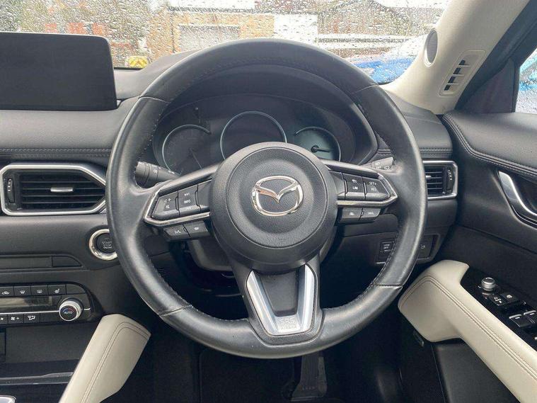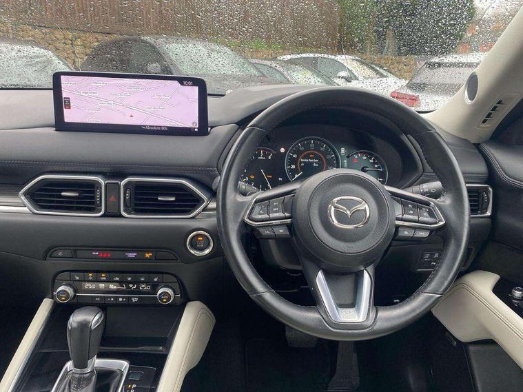 10.25" display with Mazda Connect infotainment, 7" colour TFT display, Apple car play/Android Auto, Blind spot monitoring with rear cross traffic alert, Bluetooth connectivity with voice control, Collision prevention assist, Connected services, Cruising Traffic Support, Drive mode selector, Electric power steering, Emergency stop signalling system, Engine start/stop button, Forward collision warning, Front and rear parking sensors, Integrated navigation system, Intelligent speed assist, Lane departure warning system, Lane keep assist, Power liftgate, Qi wireless phone charging, Radar cruise control with Stop and Go, Reversing camera, Service indicator, Trip computer, Windscreen projected colour active driving display (HUD) with memory, i-stop, 2 USB sockets in rear, 2x USB sockets in front, AM/FM radio, Bluetooth audio streaming, Bose premium sound system with 10 speakers, DAB Digital radio, Multimedia Commander including separate volume dial, Steering wheel mounted audio controls, Adaptive front lighting system, Auto dimming rear view mirror, Automatic headlights, Black inlay dashboard panel, Body colour door mirrors, Body colour roof spoiler, Body coloured front and rear black lower bumper mouldings, Bright finish signature wing, Coming/leaving home lighting function, Door mirror integrated indicators, Dual chrome tailpipes, Dusk sensitive headlamps, Electric front/rear windows with one touch auto up/down, Front grille in gloss black finish, Gloss black B and C pillars garnish, High beam assist, Intermittent rear wash/wipe, LED auto levelling, LED daytime running lights, LED front fog lights, LED Headlights, LED third brake light, Power folding and heated door mirrors, Power tilt/slide sunroof, Privacy glass (rear side windows only), Rain sensing front wipers, Rear side wing doors, Satin black side mouldings, Scuff plates, Shark fin antenna, Signature LED rear combination lights, Vinyl with wood grain metal inlay door trim panel, Windscreen wiper de-icer, 12v electrical power outlet, 3 seat bench in 2nd row, 3 stage heated front seats, 40:20:40 Karakuri fold-flat seat system, 6 way electric adjustable passenger seat, 8 way electric driver seat with lumbar support + memory, Cargo room flat floor board with waterproof undertray, Driver seat power slide, recline and height adjustment, Driver, Front passenger and two rear grab handles with coat hooks, Driver/passenger front seatback pockets, Driver/passenger sunvisors + illuminated vanity mirrors (drivers with ticket holder), Dual zone climate control, Folding centre armrest with 2 cup holders, Front and rear door pockets, Front centre storage with two cupholders, Front passenger seat power slide, recline and height adjustment, Heated steering wheel, Humidity sensor, Illuminated glovebox, Interior dome light with integral spotlight, ISOFIX child seat anchorage points attached on outer rear seats, Karakuri tonneau cover, Leather upholstery, Leather wrapped steering wheel and gear knob, Light roof lining, Luggage compartment LED lighting, Luggage compartment power outlet, Paddle shifts, Rear air vents, Rear headrests, Rear seat recline, Roof mounted sunglasses holder, Single front passenger seat, Three height adjustable head restraints, Tilt/height adjustable steering wheel, White interior LED illumination lighting, 3 point front seatbelts with pre-tensioners, 3 rear 3 point seatbelts, ABS, Advanced Smart City Brake Support - SCBS, Child locks on rear doors, Driver and front passenger side airbags, DSTC-Dynamic Stability and Traction Control, Dual front airbags, Electronic brake force distribution, Electronic parking brake with auto hold, ESP, Front and rear curtain airbags, Front passenger airbag deactivation, G-Vectoring control, Hill hold assist, Seatbelt reminder front and rear, Single stage passenger airbags, Smart brake support with forward obstruction warning, Tyre pressure monitoring system, Automatic door locking when moving off, Deadlock, Immobiliser, Power door locks, Remote central locking, Smart keyless entry, Thatcham Cat.1 alarm, 19" diamond cut black alloy wheels, Tyre repair kit,