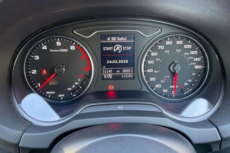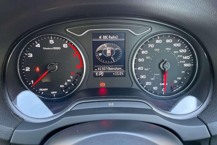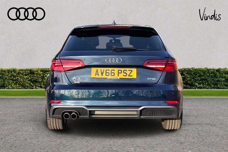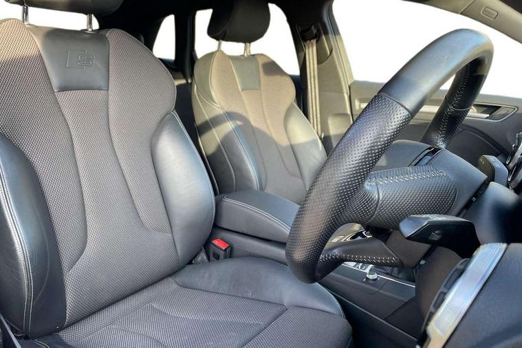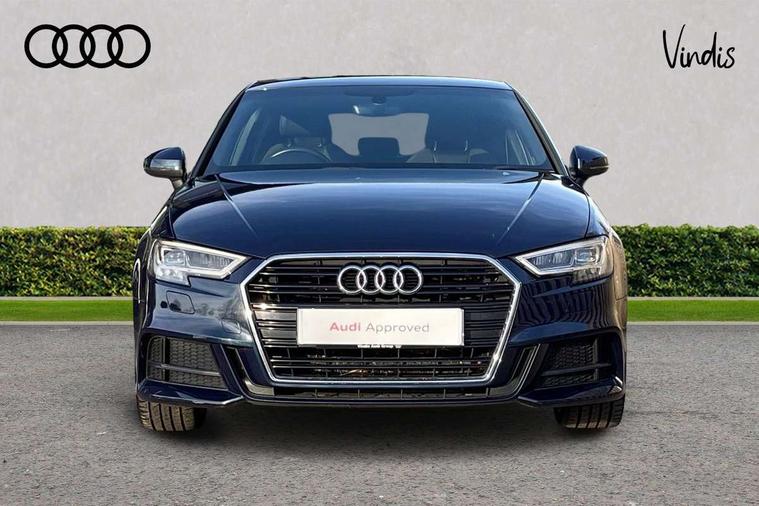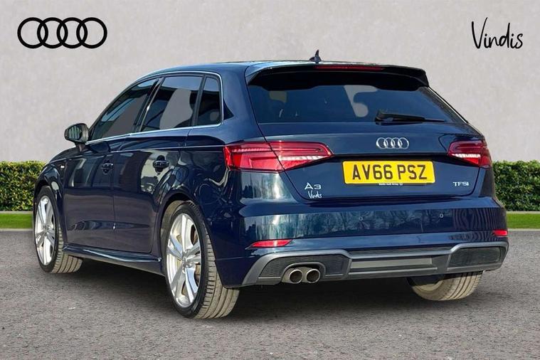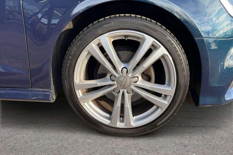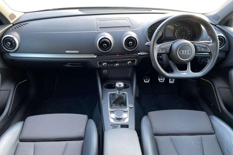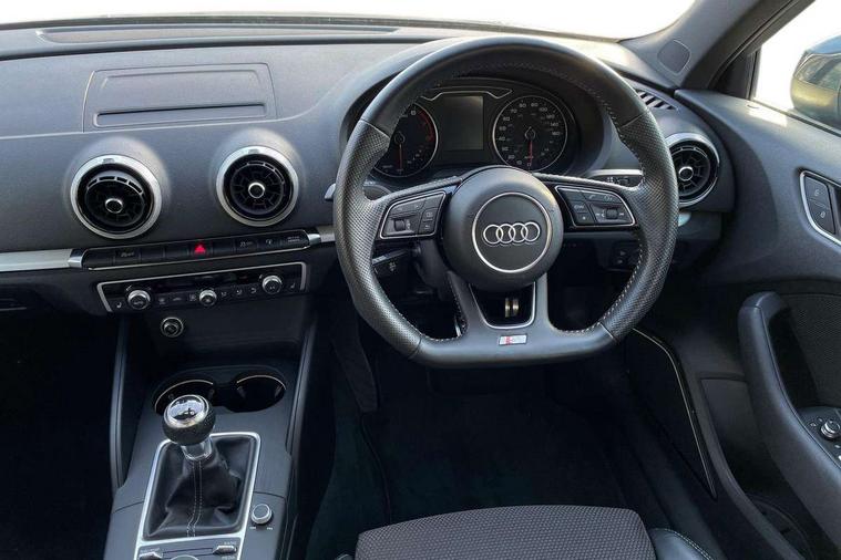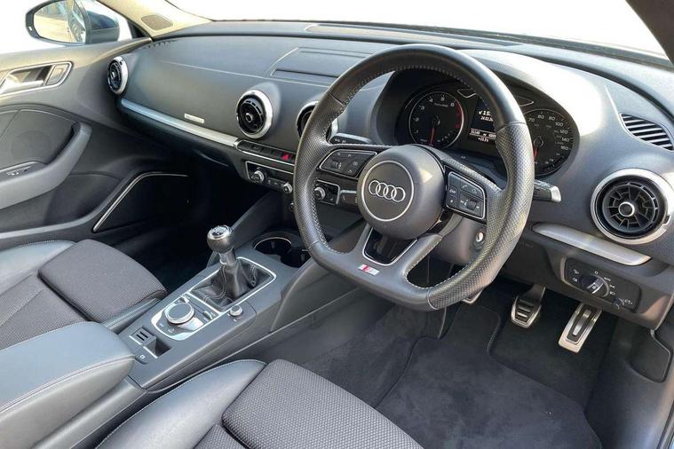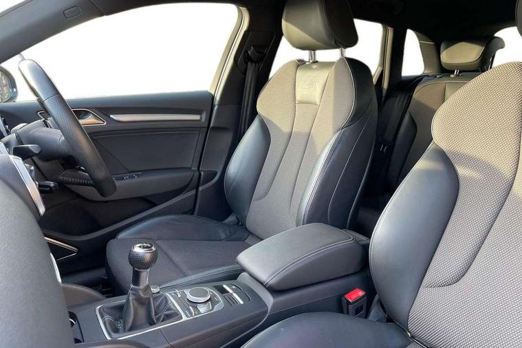 Audi connect, Audi drive select, Audi smartphone interface, Colour driver's information system display, Electro-mechanical PAS, Mobile telephone preparation - bluetooth interface, Service interval indicator, Speed limit display, Voice control system, 2 USB ports, Audi music interface, Auxiliary input socket, DAB Digital radio, Aluminium window trim, Body colour bumpers, Body colour door mirrors with integral indicators, Body colour roof spoiler, Chrome exhaust tailpipes, Electric front windows, Electric operated/heated door mirrors, Electric rear windows, Heated windscreen washer jets, Matt black radiator grille, Rear wiper, S Line body styling, Single exhaust tailpipe, Sport specific side air inlet grille and diffuser insert, 3 adjustable rear headrests, 3 spoke flat bottomed multi-function leather steering wheel, 4 lashing points to secure luggage, Adjustable front armrest, Black cloth headlining, Dual zone electronic climate control, Front and rear interior lights with delay, Front passenger seat isofix location point, Front/rear floor mats, Height/depth adjustable steering column, Illuminated door sills, Illuminated glovebox, Illuminated luggage compartment, ISOFIX child seat preparation+airbag deactivation, Jack and tool kit, Stainless steel pedals, Storage compartment in centre console, Storage compartment under front seats, Storage compartments in doors, LED interior light pack - A3/RS3, Light and rain sensor pack - A3 Hatchback/Sportback, Storage and luggage pack - A3/RS3, 3 point seatbelts on all seats, ABS/EBD, Active bonnet, Active front headrests, ASR, Curtain airbags, Driver and passenger side airbags, Driver/Front Passenger airbags, Drivers knee airbag, EDL, Electromechanical parking brake, ESC - Electronic Stability Control + traction control, Front passenger airbag deactivation, Manual rear child locks, Multi-Collision braking, Seatbelt warning, Tyre pressure monitor, Warning triangle and first aid kit, Anti-theft wheel bolts, Remote control central locking, Thatcham category 1 alarm + immobiliser, Aluminium air vent surrounds, Aluminium trim elements, Space saver spare wheel,