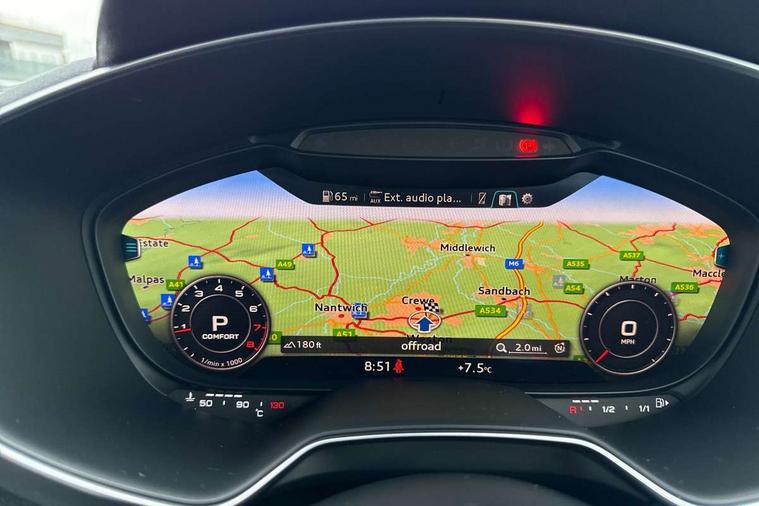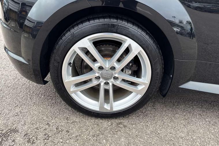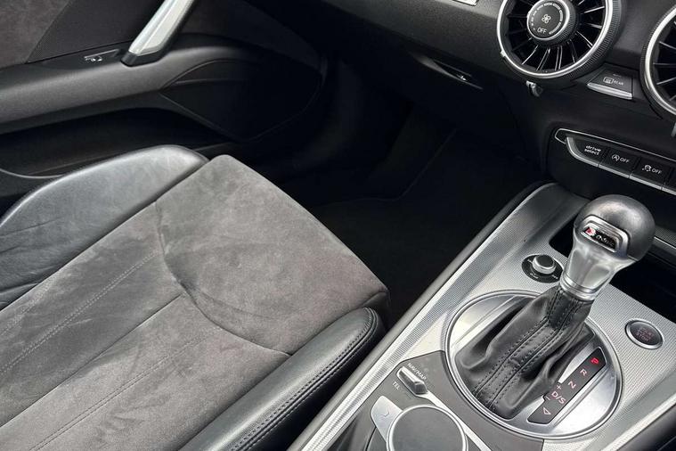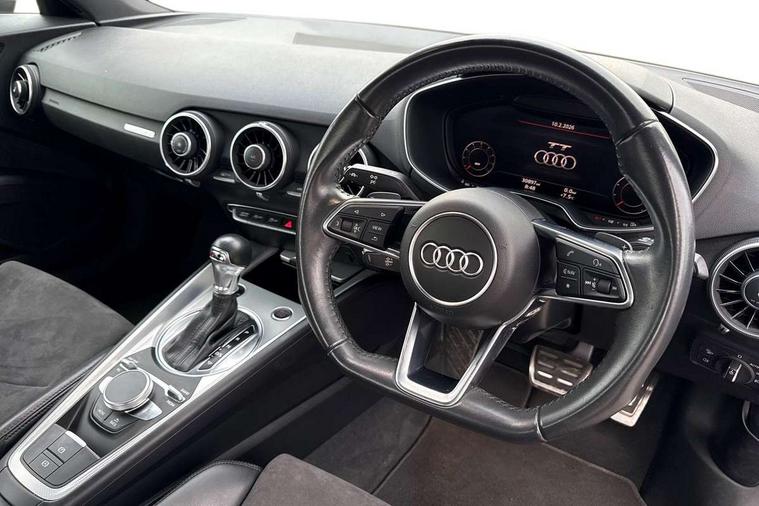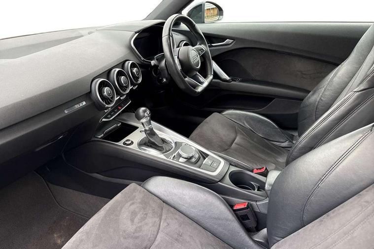 Audi active lane assist, Audi drive select with 4 Pre configured modes, Audi virtual cockpit - 12.3" high-resolution LCD display with fully customisable instrument cluster, Cruise control + speed limiter, MMI touch panel, Mobile phone preparation with bluetooth interface, Progressive power assisted steering, Service interval indicator, Start/Stop system with energy recuperation, TP memo, Sports suspension, AM/FM radio, Audi music interface, Bluetooth audio streaming, DAB Digital radio, MMI Radio with CD player and SD/XC card slot, Auto dimming rear view mirror, Body colour bumpers, Body colour electrically adjustable and heated door mirrors with built in LED side indicators, Electric folding door mirrors, Electric front windows, Front fog lights, Green tinted heat insulating glass, Light and rain sensors, Retractable rear boot spoiler, Sunband for windscreen, Xenon headlights with LED daytime running lights with automatic headline range control + LED rear lights, brake lights and rear indicators, 12V socket, 3 spoke flat bottomed high multi-function leather sport steering wheel with gearshift paddles, Air conditioning, Alcantara/Leather upholstery includes seat centre panels, door trim inserts in black Alcantara with side bolsters, head restraints in black leather, Aluminium door sill trims, Front centre armrest, Front sports seats, Heated front seats, Height adjustable driver's seat, Height adjustable front head restraints, Height/reach adjust steering wheel, ISOFIX child seat mounting for front passenger seat with airbag deactivation, Reading lights, Rear head restraints, Rear top tether child seat ISOFIX attachment, Split folding rear seat, Top tether anchor plate for isofix child seat, Non smoking pack - TT/TT RS, 3 point front seat belts, ABS, ASR traction control, Brake energy regeneration, Curtain airbags, Driver and front passenger airbag with front passenger airbag deactivation, EDL traction control, Electromechanical parking brake, ESP, First aid kit, Front side airbags, Head airbags, Hill hold assist, Seatbelt warning, Tyre pressure warning, Warning triangle, Anti theft alarm, Anti theft wheel bolts, Immobiliser, Keyless Go, Remote central locking, Aluminium design inlays, Tool kit, Tyre repair kit,