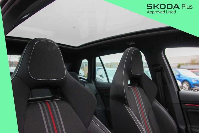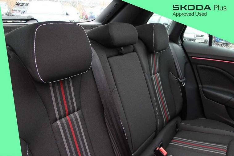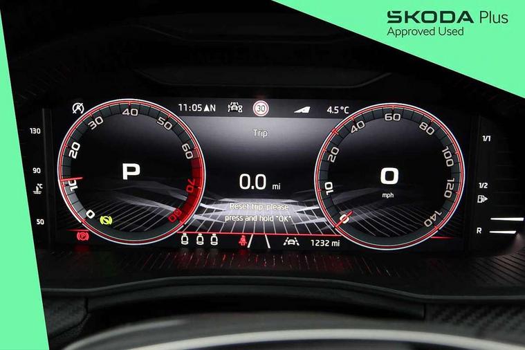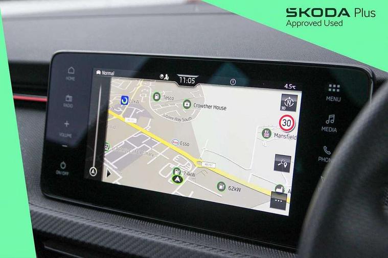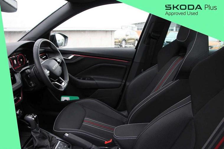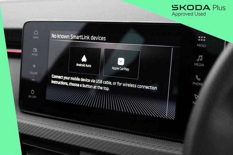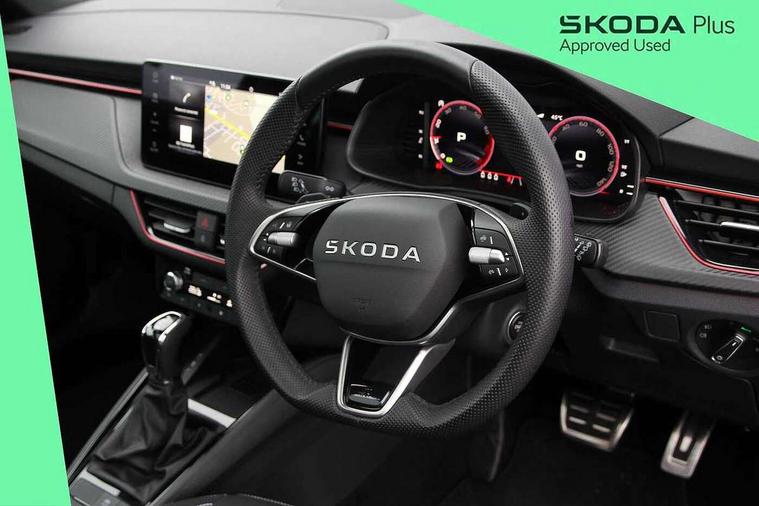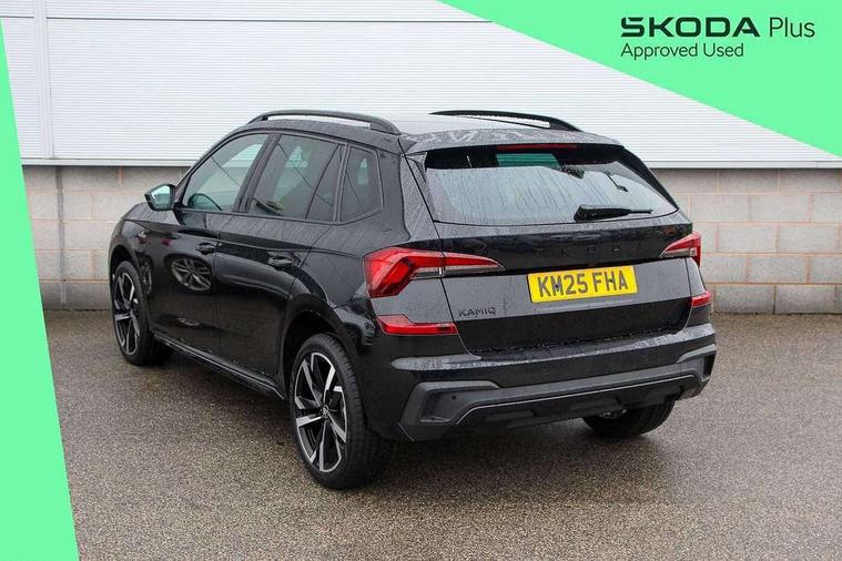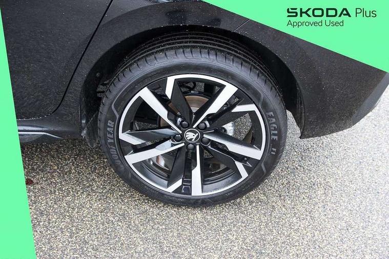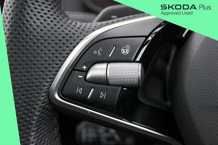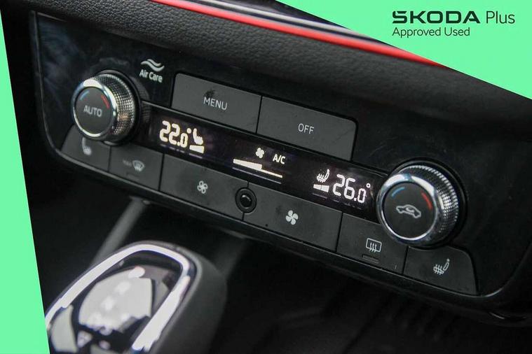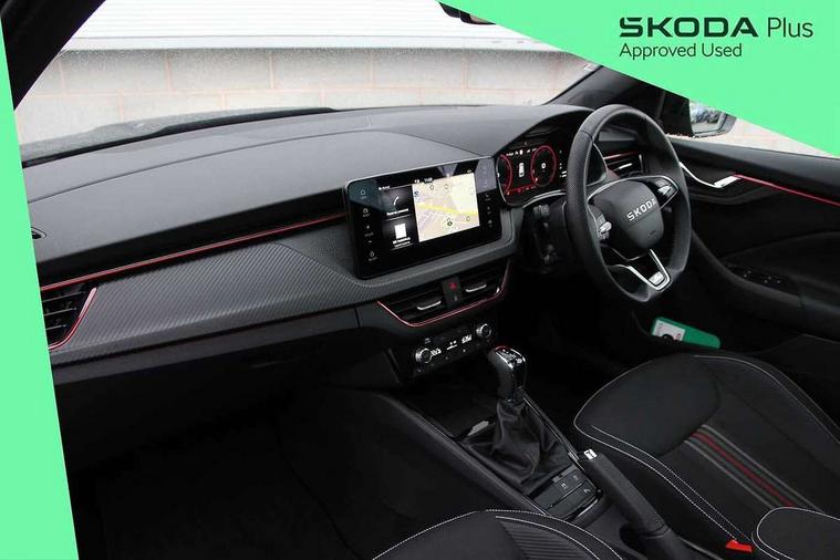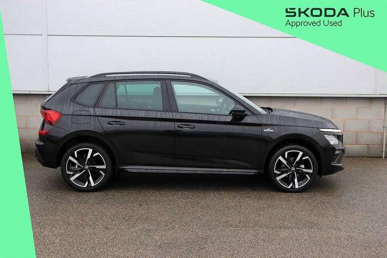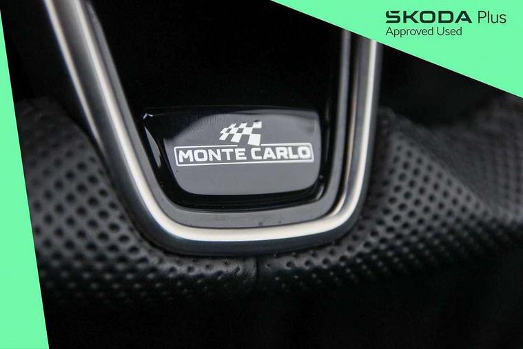 Advanced driver attention and drowsiness monitor, Bluetooth system, E-call, Front assist system, PAS, Rear parking sensors, Rear view camera, Service indicator, Speed limiter, Traffic sign recognition, Virtual cockpit with 10.25" display, Voice control system, Wireless smartlink, 4 USB C ports, 8 Speakers, 9.2" Skoda navigation display, DAB Digital radio, Auto dimming rear view mirror, Automatic headlight control with coming home and leaving home feature, Black door mirrors, Black radiator grille, Black rear diffuser, Black roof spoiler, Body colour bumpers, Body colour door handles, Boot lettering in black, Extended tailgate glass, Fixed panoramic sunroof with black roof rails, Front and rear electric windows, Heated rear window, LED daytime running lights, LED high beam, LED low beam, LED third brake light, Light sensors, Monte carlo plaque, Privacy glass, Rear side wing doors, Rear wiper, Ticket holder inside windscreen, 12V socket in luggage compartment, 3 seat bench in 2nd row, Aluminium pedals, Ambient lighting in white/red, Art leather carbon decor inserts, Art leather carbon door inserts, Black roof lining, Cargo elements, Chrome inner door handles, Driver and passenger sun visors with vanity mirror, Dual zone climate control, Front and rear roof lights, Front centre armrest, Front head restraints, Glove compartment with illumination, Height adjustable driver seat, Height adjustable front passenger seat, Ice scraper, Inner circulation control with pollen filter, ISOFIX on front passenger seat, Isofix preparation for back seats, Leather gearknob and handbrake lever, Manual lumbar support for front seats, Monte Carlo cloth upholstery, Net package and top tether hooks in boot space, Net under rear shelf, Pocket on the back of both front seats include mobile phone pockets, Rake/reach adjustable steering wheel, Reading lights, Rear centre armrests, Red hotstamping, Single front passenger seat, Sports seats, Textile floor mats, Third rear headrest, Top tether for front passenger seat, Umbrella in driver's door, Light and view plus package - Kamiq, 3x3 point rear seatbelts, Airbags - driver and front passenger, Disc brakes, ESP, Extended and predictive pedestrian/cyclist protection, Front passenger airbag deactivation switch, Front side airbags with curtain airbags, Hill hold control, Manual leather parking brake, Manual rear child locks, One tone horn, Seatbelt reminder for driver an co-driver, Traction control, Tyre pressure monitor, Anti-theft alarm system with interior monitoring, backup horn, towing protection and remote central locking with SAFE system, Anti-theft wheel bolts, Electronic engine immobilizer, 18" Ursa black diamond cut alloy wheels,