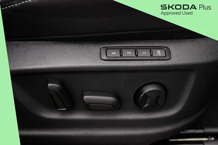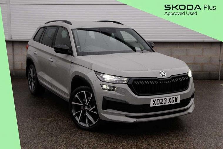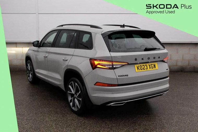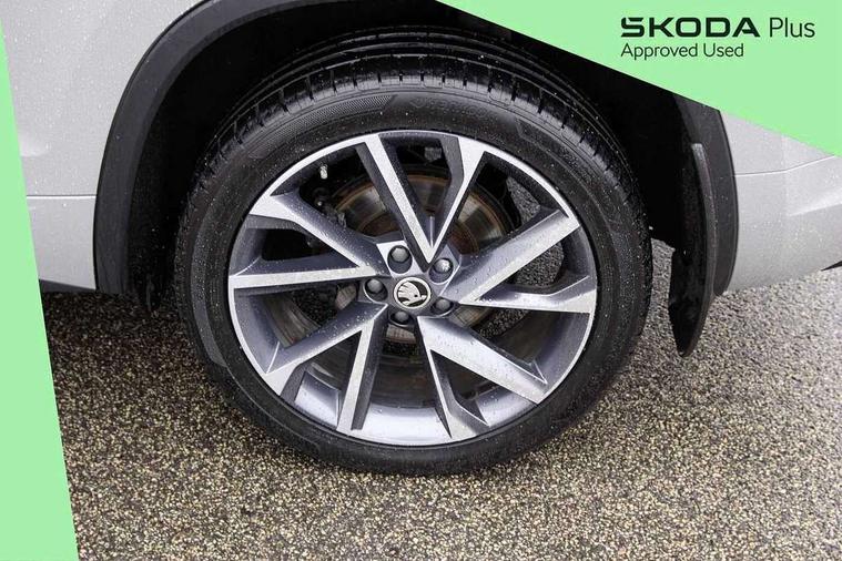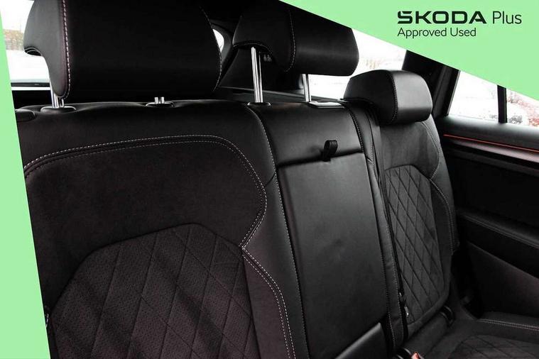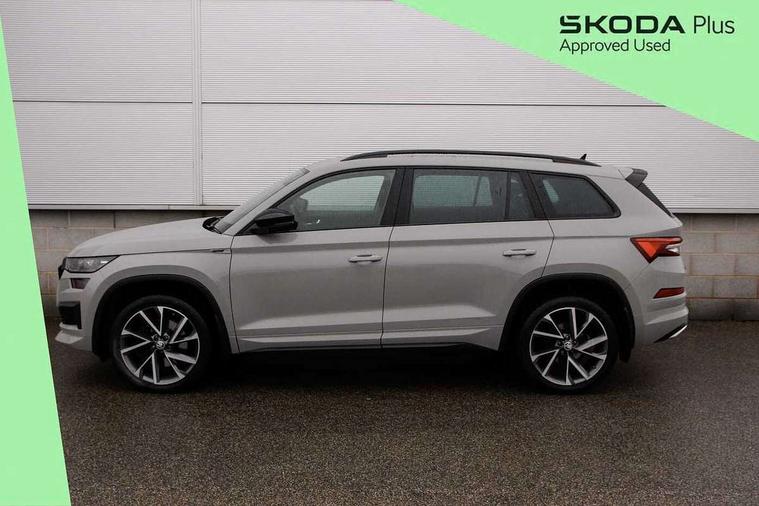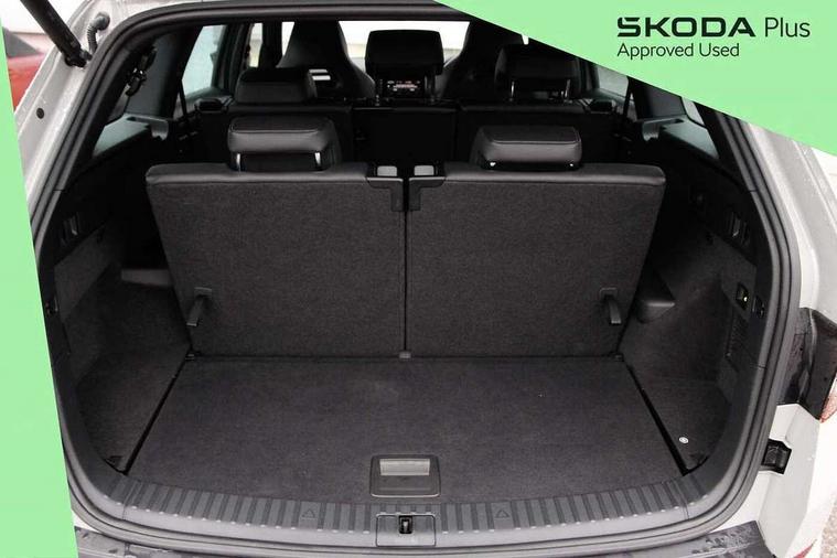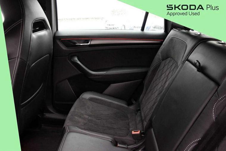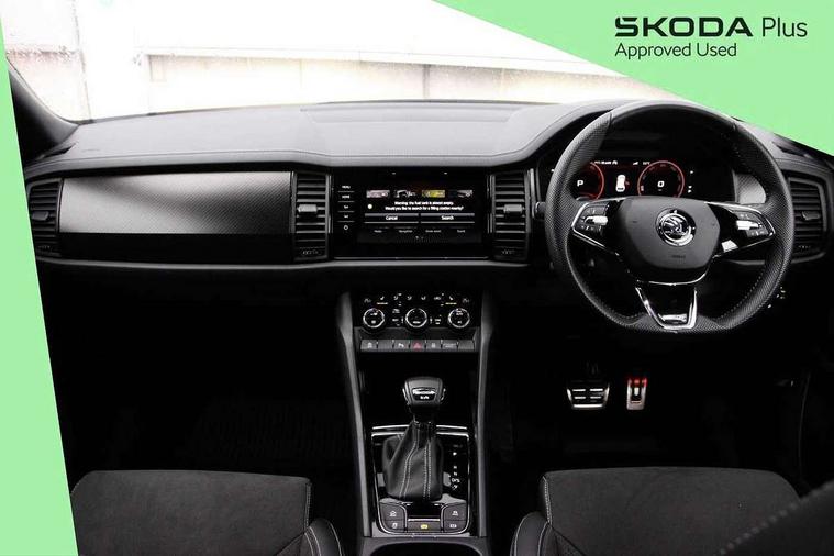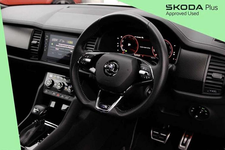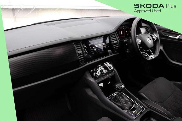 Bluetooth system, Columbus satellite navigation with 9.2" touchscreen, integrated Wi-Fi, web radio, Digital voice enhancement, e call+, ECO Stop/start function, Exterior temperature indicator, Progressive steering, Rear view camera, Smartlink wireless for apple carplay and wired for android auto, Speed limiter, USB C Port x 2 in front centre console, Virtual Cockpit - 10.25" digital display with additional sports design, Wireless charging, 8 speakers, DAB Digital radio, Aero front windscreen wipers with intermittent function, Aero rear window wiper, Auto dimming rear view mirror, Black roof rails, Black sports styling including front grille and window surrounds, Black wheel arch surrounds, Body colour bumpers, Body colour door handles, Electric adjustable/heated/folding door mirrors, driver side auto dimming with boarding sports and memory function, Electric front and rear windows, Extended rear spoiler with finlets in gloss black, Front fog lights, Full LED matrix headlights with AFS (adaptive front light system), cornering function and AWL (all weather lighting system), Gloss black door mirrors, Headlight washers, Heated rear window, Invisible tailpipe, LED daytime running lights, LED rear fog light, LED third brake light in rear spoiler, Light assistant (coming/leaving home/tunnel light), Off-road style lower front bumper element, Privacy glass, Rain and light sensors, Rear diffuser, Rear LED lights (high functionality) with welcome effect and dynamic indicators, Rear side wing doors, Safety reflectors on front and rear doors, Sportline badge on front fender, Sports front and rear bumpers including lower rear chrome strip, Tailgate lettering in Black, Window control switches with black trim, Without engine designation, 12V socket in boot, 2 rails with 2 hooks, 2 seat bench in 3rd row, 3 seat bench in 2nd row, 3 spoke leather multifunction sports steering wheel with DSG paddles, 4 foldable roof handles with rear coat hooks, 60:40 foldable rear seat with sliding adjustment and backrest angle adjustment, Aluminium pedals, Black roof headlining, Bottle holders in door panel in the 1.5 litre front and 1 litre rear, Cargo storage compartments, Chrome headlight control button, Chrome interior door handles, Coat hooks on B pillar, Covered storage compartment on driver side, Decorative door sill covers, Front and rear door armrest with black adductor trim, Front centre armrest with storage compartment, cup holder and 12V socket, Front courtesy lights, Gear shift lever with chrome frame and black gloss insert, Grey stitching in front and rear armrests and door armrests + door inserts, Height adjustable front headrests, Illuminated glovebox, Illuminated luggage compartment, Isofix child seat fittings in outer rear seats with top tether, Manually adjustable steering column, Microsuede door panels, Net programme in boot (1x horizontal Net, 2x vertical Nets), Overhead glasses storage compartment, Pollen filter, Rear centre armrest with cupholders, Single front passenger seat, Sliding trunk cover, Small Bags on the inner sides of the front backrests, Sports seats, Sunvisors with illuminated vanity mirrors, Three rear height adjustable headrests, Ticket holder on A Pillar, Umbrella in door panel, Variable boot floor, LED Interior light pack - Kodiaq, Auto door release and activation of warning lights, Driver and front passenger airbag with knee airbag and front passenger airbag deactivation, Electronic parking brake with hill start assist, Emergency rear braking signal, ESC (incl. ABS+MSR+ASR+EDS+HBA+DSR+RBS+MKB), Front assist with autonomous emergency braking, Front side airbags with curtain airbags, Fuel cut off safety device, Height adjustable front 3 point seatbelts + pretensioners, Hill hold control, Rear disc brakes, Safety vest holder in door, Seat belt reminder for all seats, Tailgate unlocking from outside, Three point rear seat belts, Two tone horn, Tyre pressure monitor, Alarm with interior monitoring and tilt sensor with safe function, Anti-theft wheel bolts, Immobiliser, Keyless entry and start system (KESSY), Remote central locking with 2 keys, Black air vent surround, Carbon finish dashboard and door inserts, Grey stitching in dashboard, 20" Vega Anthracite alloy wheels, Temporary spare wheel (space saver),