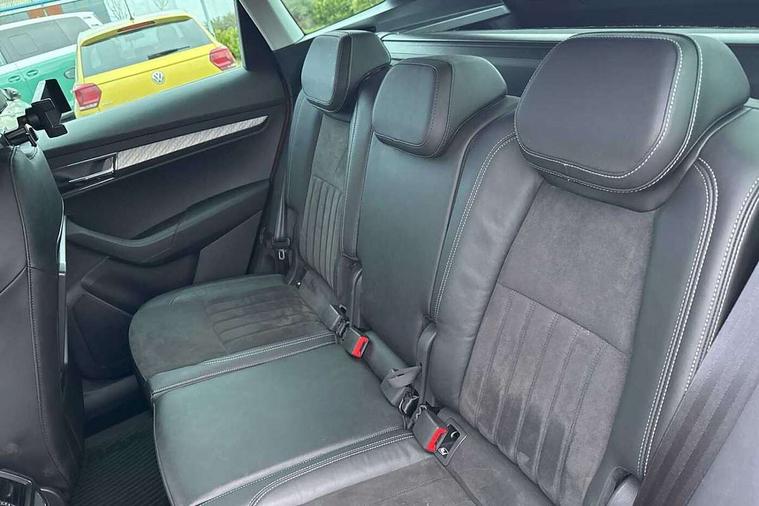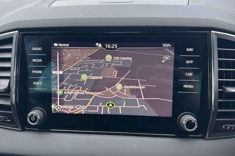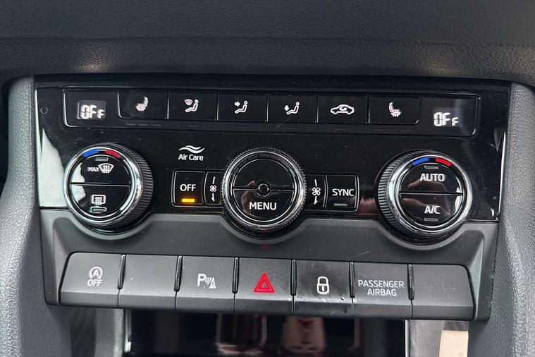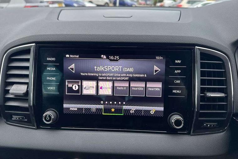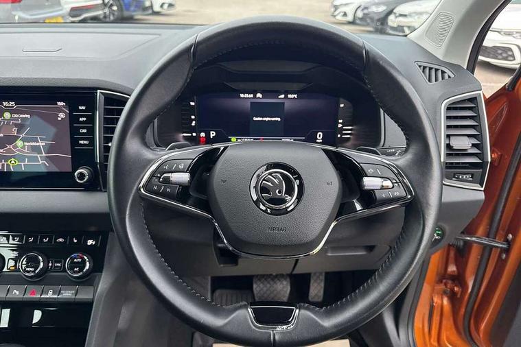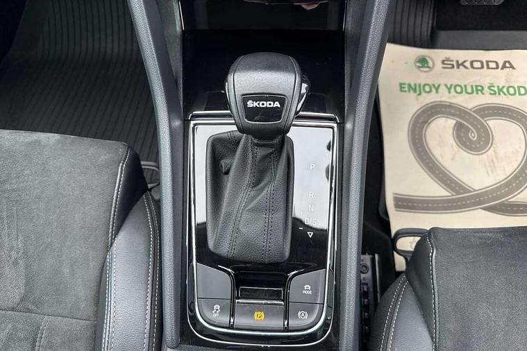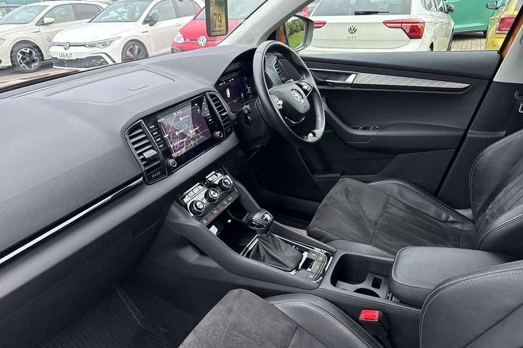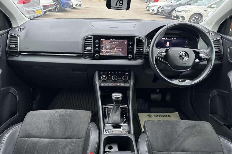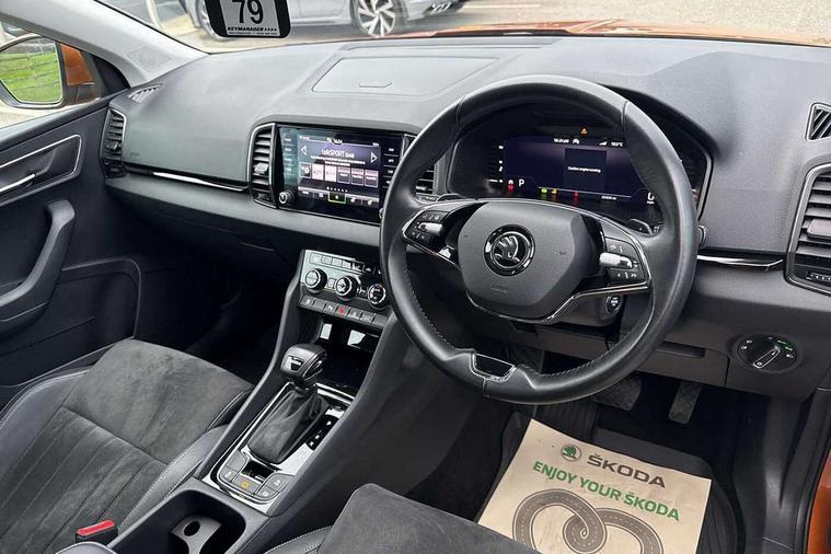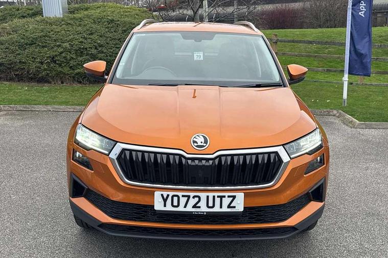 8" Digital display, Care connect, Driver fatigue sensor, Emergency services call system, Outside temperature gauge, Service interval indicator, SmartLink wireless for Apple and wired for Android, Start/stop system with regenerative braking, USB C Port x 2 in front centre console, 8 Speakers, DAB radio with Bluetooth, USB connection, Acoustic glass, Aero front windscreen wipers with intermittent function, Auto dimming rear view mirror with light and rain sensors, Black electric window control buttons, Body colour door mirrors and handles, Dynamic headlight range control with cornering light function, Electric front and rear windows with child proof lock, Heated rear windscreen, LED daytime running lights, LED rear lights with high functionality welcome effect and dynamic indicators, Light assistant (coming/leaving home/tunnel light), Plastic scuff plates, Privacy glass, Rear side wing doors, Rear spoiler, Rear window wiper with washer system and intermittent control, Safety reflectors on front doors, 1.5 litre bottle holders in driver and front passenger door panels, 12V socket in boot, 12v socket in front centre armrest with storage compartment and rear air vents, 2 Folding hooks and nets in boot, 2 spoke leather heated multifunction steering wheel with DSG paddles, 2 x Tablet holder, 3 rear height adjustable headrests, 3 seat bench in 2nd row, 4 foldable roof handles with rear coat hooks, Black floor carpet, Chrome inner door handles, Decorative door sills with KAROQ badging, Double sided boot floor, Foldable hooks in the boot, Front head restraints, Height adjustable front three point seats belts with tensioners, Height/reach adjust steering wheel, Ice scraper, Illuminated glovebox, Illuminated luggage compartment, Isofix child seat preparation for front passenger seat, Isofix child seat preparation outer rear, Manual lumbar support for front seats, Pen holder, Pollen filter, Rear boot cover, Rear reading lights, Rubbish bin door, Safety vest holder, Single front passenger seat, Storage box in upper central dashboard closed, Sunvisors with illuminated vanity mirrors, Textile floor mats, Ticket holder, VarioFlex seats with standard rear seat release, Chrome roof rails + chrome pack - Karoq, Parking pack - Karoq, Automatic door unlocking in case of crash, Automatic fuel cut off in case of crash, Child locks on rear doors, Driver airbag, Electronic parking brake with auto hold function, Emergency rear braking signal, ESC including ABS, MSR, ASR, EDS, HBA, DSR, RBS, MKB and traction control, Front side airbags, Hill hold control, Knee airbags, Passenger airbag with switch-off function, Pedestrian monitor, Seatbelt reminder signalisation and pretensioner for all seats, Three point seatbelts rear, Two tone horn, Tyre pressure display, Tyre pressure monitor, Alarm with interior monitoring, back up horn and tilt sensor with safe function, Electronic engine immobiliser, Keyless entry and start/stop, Remote central locking with 2 remote folding keys, Chrome framed air vents, 18" Procyon silver alloy wheels with anthracite aero inserts, Anti-theft wheel bolts protection, Storage on wheel cover, Tool kit,
