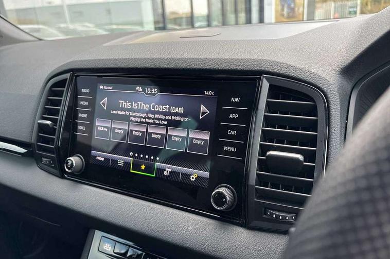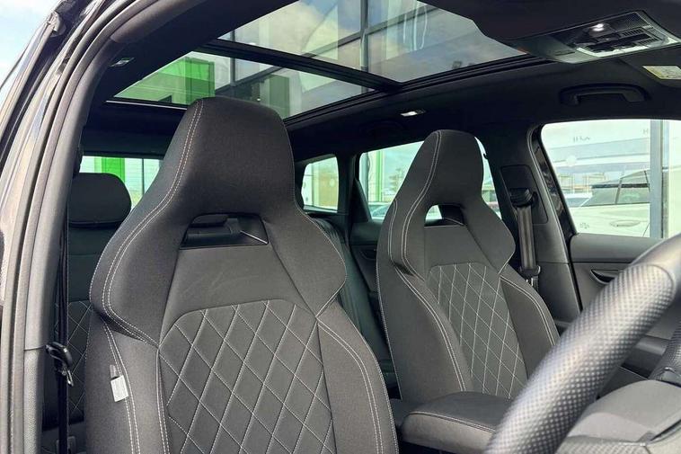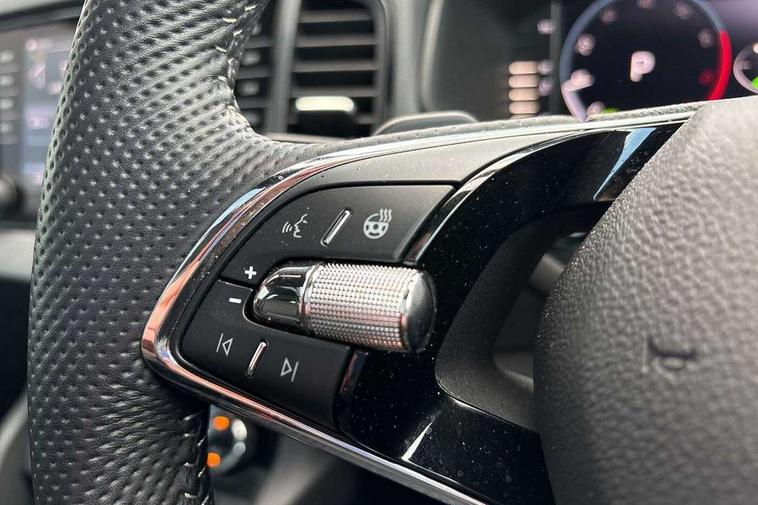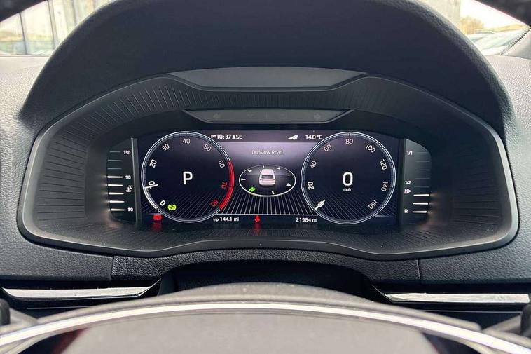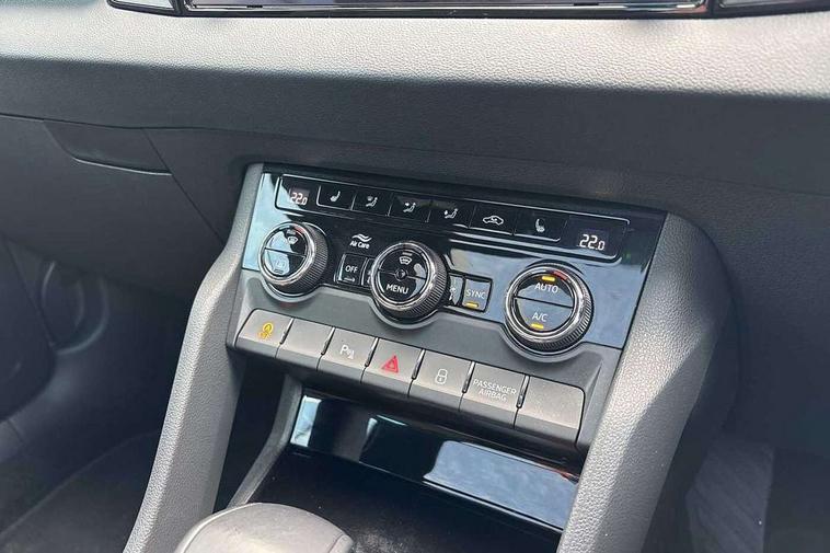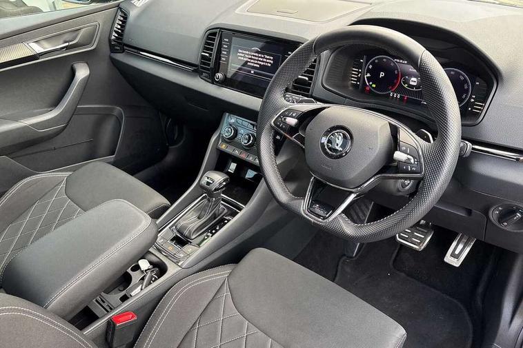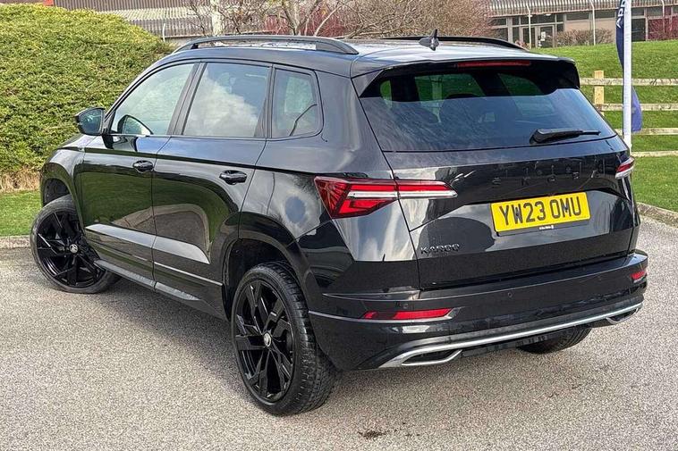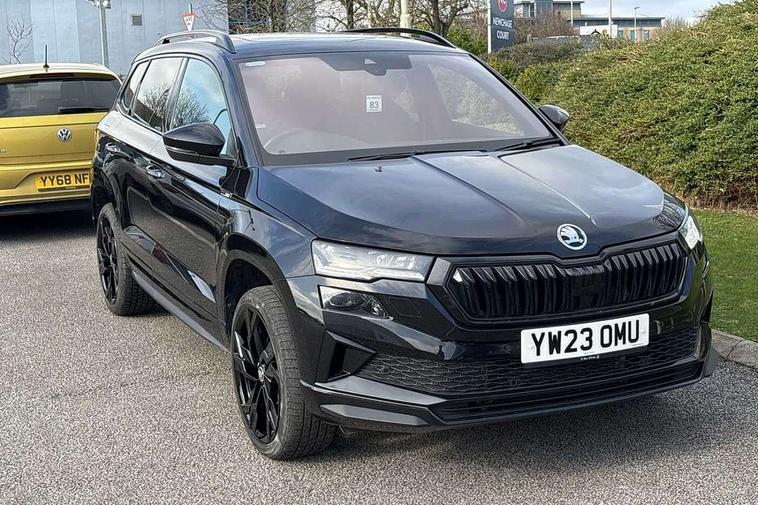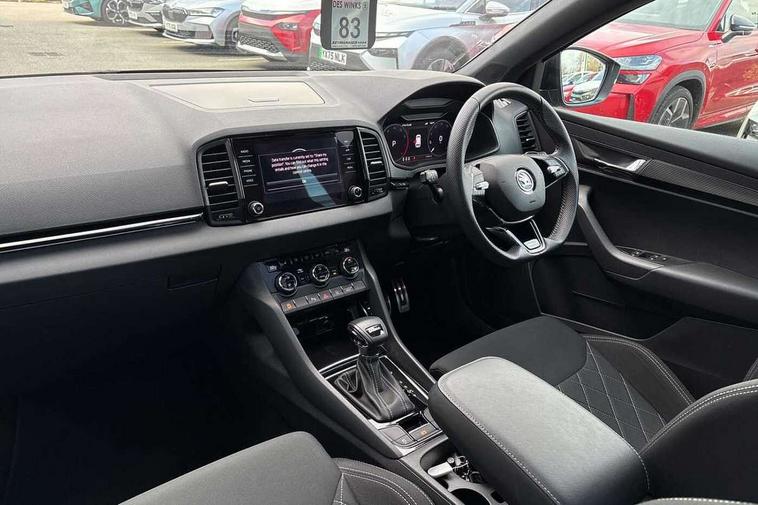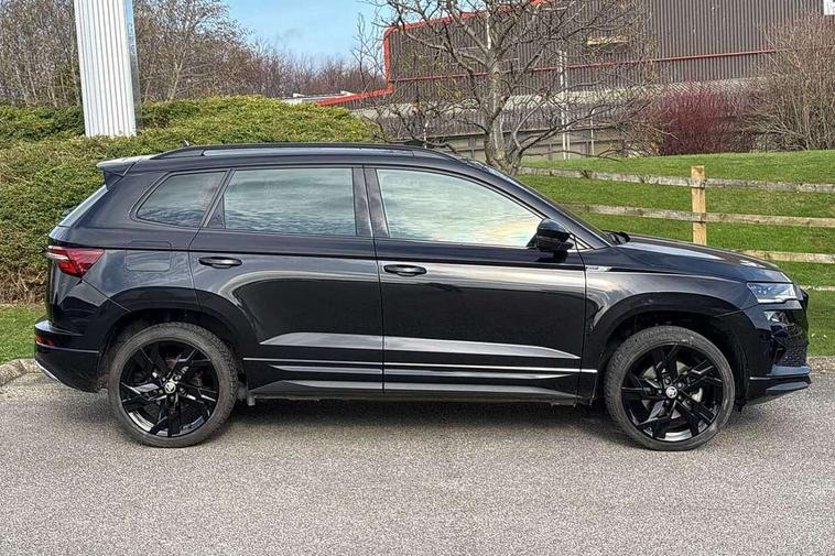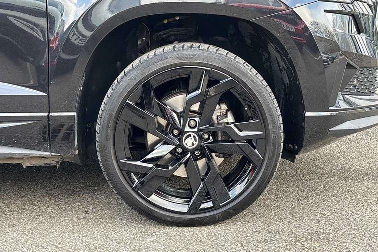 8" Digital display, Care connect, Driver fatigue sensor, Emergency services call system, Outside temperature gauge, Service interval indicator, SmartLink wireless for Apple and wired for Android, Start/stop system with regenerative braking, USB C Port x 2 in front centre console, Virtual cockpit, Virtual pedal with electrically operated boot door, 8 Speakers, DAB radio with Bluetooth, USB connection, Acoustic glass, Aero front windscreen wipers with intermittent function, Auto dimming rear view mirror with light and rain sensors, Black door mirrors, Black electric window control buttons, Black radiator grille, Black roof rails, Body colour door handles, Dynamic headlight range control with cornering light function, Electric front and rear windows with child proof lock, Front door steps with SportLine logo, Heated rear windscreen, LED daytime running lights, LED rear lights with high functionality welcome effect and dynamic indicators, Light assistant (coming/leaving home/tunnel light), Panoramic sliding sunroof, Plastic scuff plates, Privacy glass, Protective door side sills in body colour, Rear diffuser, Rear side wing doors, Rear spoiler, Rear window wiper with washer system and intermittent control, Safety reflectors on front doors, Skoda lettering on tailgate in black, Sportline badge on front fender, Sportline decorative inserts with badging, Sports front and rear bumpers, 1.5 litre bottle holders in driver and front passenger door panels, 12V socket in boot, 12v socket in front centre armrest with storage compartment and rear air vents, 2 Folding hooks and nets in boot, 3 rear height adjustable headrests, 3 seat bench in 2nd row, 3 spoke leather sports multifunction steering wheel and silver stitching with gear shift paddles, 4 foldable roof handles with rear coat hooks, Black floor carpet, Black roof headlining, Chrome inner door handles, Double sided boot floor, Foldable hooks in the boot, Front head restraints, Height adjustable front three point seats belts with tensioners, Height/reach adjust steering wheel, Ice scraper, Illuminated glovebox, Illuminated luggage compartment, Isofix child seat preparation outer rear, Manual lumbar support for front seats, Pen holder, Pollen filter, Rear boot cover, Rear reading lights, Rear seats fixed folding and divided 60:40, Rubbish bin door, Safety vest holder, Single front passenger seat, Storage box in upper central dashboard closed, Sunvisors with illuminated vanity mirrors, Textile floor mats, Ticket holder, Titan black interior ceiling, Welcome animation with sportline logo, Light Pack - Karoq, Parking pack - Karoq, Automatic door unlocking in case of crash, Automatic fuel cut off in case of crash, Child locks on rear doors, Driver airbag, Electronic parking brake with auto hold function, Emergency rear braking signal, ESC including ABS, MSR, ASR, EDS, HBA, DSR, RBS, MKB and traction control, Front side airbags, Hill hold control, Knee airbags, Passenger airbag with switch-off function, Pedestrian monitor, Seatbelt reminder signalisation and pretensioner for all seats, Three point seatbelts rear, Two tone horn, Tyre pressure display, Tyre pressure monitor, Alarm with interior monitoring, back up horn and tilt sensor with safe function, Electronic engine immobiliser, Keyless entry and start/stop, Remote central locking with 2 remote folding keys, Black air vent surround, Black centre console, Satin black dashboard, Satin black door trim, 19" Vega black polished alloy wheels, Anti-theft wheel bolts protection, Matt black aero hub caps, Storage on wheel cover, Tool kit,
