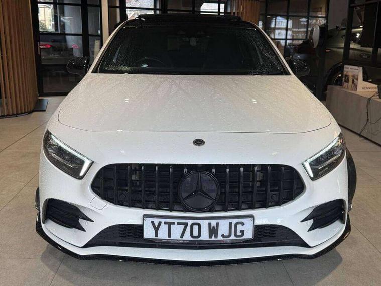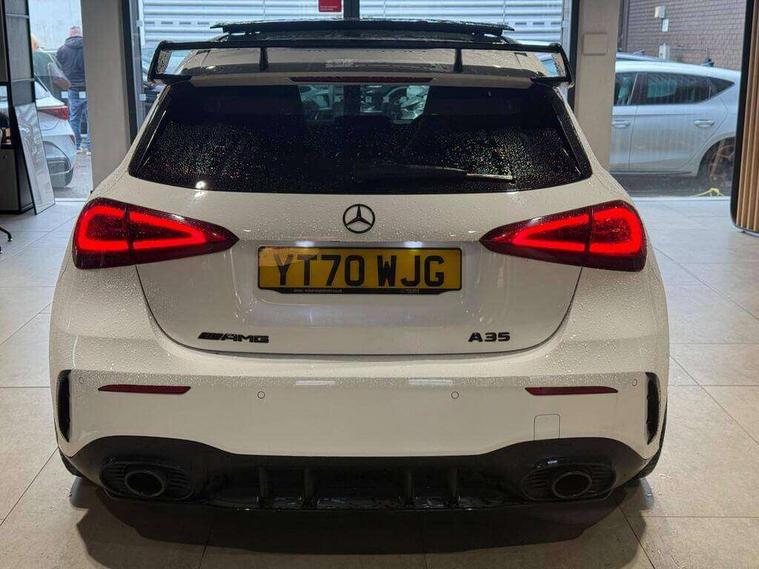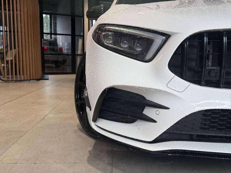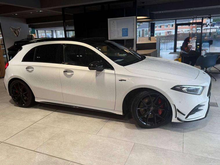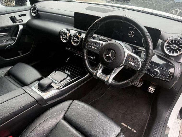 10.25" Digital instrument cluster display screen, 10.25" media display, 180 degree rear view camera with parking guidelines, Active lane keep assist, Active park assist with parktronic system including front and rear parking sensors, Attention assist, Brake pad wear indicator warning light, Car wash mode, Direct steering, Dual bluetooth interfaces, DYNAMIC SELECT with driving programs (Slippery, Comfort, Sport, Sport+ and Individual), ECO start/stop function, Fluid level warning indicator for fuel, oil, coolant and washer fluid, Hard-disk navigation, Hey Mercedes Voice activation, Lamp failure indicator, MBUX augmented reality for navigation, Mercedes me connect including emergency call system, accident recovery, breakdown and maintenance management, Outside temperature gauge, Owners manual in English, Pre-installation for private car sharing, Pre-installation for Vehicle Monitoring, Pre-installation for Vehicle Setup, Preinstallation for Mercedes Benz link, Service indicator (ASSYST), Smartphone integration with Apple CarPlay and Android auto, Traffic sign assist, Trip computer, Wireless charging, Rear axle multi-link, 2 USB ports (type C) in rear stowage compartment and one in front of center console, Burmester surround sound system - 590W, DAB Digital radio, MBUX multimedia system with DAB digital radio and touchpad including satellite navigation, 4 Electric Front and Rear windows, Adaptive brake lights, AMG bodystyling - Front apron with splitter in chrome, rear apron with chrome trim and chrome visible trim elements in tailpipe, AMG Front apron with flics as air deflector elements on the outer air intakes, AMG radiator grille with twin blade lamella and AMG Lettering, AMG Rear apron with specific diffuser look with four vertical fins and two round chrome plated tailpipe trim elements with a diameter of 90 mm, AMG spoiler lip on roof, AMG Sports exhaust system with two round tailpipes measuring 90 mm in diameter attached in rear apron, AMG lettering plus ribbing on the inside of the, Black weather strip, Body colour bumpers, Body colour door handles, Body colour side skirt, Electric adjustable and heated door mirrors with integrated LED side indicators, Front wings wheel arches with TURBO 4MATIC lettering, Headlamp assist automatic headlamp activation, Heated glass rear windscreen + timer control, High gloss black beltline, Illuminated front door sill panels with Mercedes-Benz lettering, LED high performance headlamps with integrated LED daytime running lights, LED tail lamp, LED third brake light, Multibeam LED with adaptive highbeam assist plus, Panoramic sliding sunroof, Privacy glass, Radio aerial, Rain sensing windscreen wipers with two sensitivity settings, Rear fog lights, Rear wiper, Trim elements on louvres in outer air inlets in silver chrome, Wider wheel arches for AMG wheels, Window line trim strip in high gloss black, 40:20:40 split folding rear seats, AMG Performance steering wheel in nappa leather, Auto Mercedes-Benz child seat recognition sensor, Black air vents with surround in silver chrome, Black roof lining, Brushed stainless steel sports pedals with rubber studs, Controller on centre console with chrome surround, Electrically adjustable front memory seats including lumbar support, Floor mats with stitched edging and AMG lettering, Front centre armrest with storage compartment, Front seat backs luggage nets, Front seat cushion length adjustment, Heated front seats, Height/reach adjustable steering column, Interior lighting - 64 colour Ambient lighting, Interior mirror with reading lamps in black and frameless, Rear armrest with 2 cupholders, Rear head restraints, Seat occupancy sensor for front passenger seat, Silver coloured aluminium gear shift paddles on steering wheel, Sports seats with integrated headrests, Stowage compartment in centre console with retractable cover, Sunvisors with illuminated vanity mirrors, Touchpad on center console, Twin front cupholders, Two zone thermotronic luxury automatic climate control, Aerodynamic pack - A Class, AMG night pack - A Class, Light and sight pack - A Class, Mirror package - A Class, Seat comfort pack - A Class, 3 rear 3 point seatbelts, ABS with Brake Assist, Active bonnet, Adaptive brake assist with hold function and hill start assist, Black seatbelts, Childproof locks manually operated for rear doors and electrically operated for rear power windows, Crash responsive emergency lighting, Driver and passenger head and side airbags, Drivers knee airbag, Dual stage driver/passenger airbags, Electronic parking brake, ESP curve dynamic assist, ESP with ASR, Front and rear seatbelt reminder, Front brake calipers with AMG lettering, ISOFIX and top tether child seat fixing points in two outer rear seats, Perforated front brake discs, Tyre pressure monitoring system, Warning triangle and first aid kit, Window airbags, Alarm system/interior protection/immobiliser, Keyless entry lock/unlock, Keyless Go, Remote central locking and crash sensor with emergency opening function, Urban guard vehicle protection system with immobiliser and interior protection, Light aluminium with longitudinal grain interior trim, 19" AMG multi-spoke matt black painted light alloy wheels with high sheen finish, Summer tyres, Tirefit sealant kit,