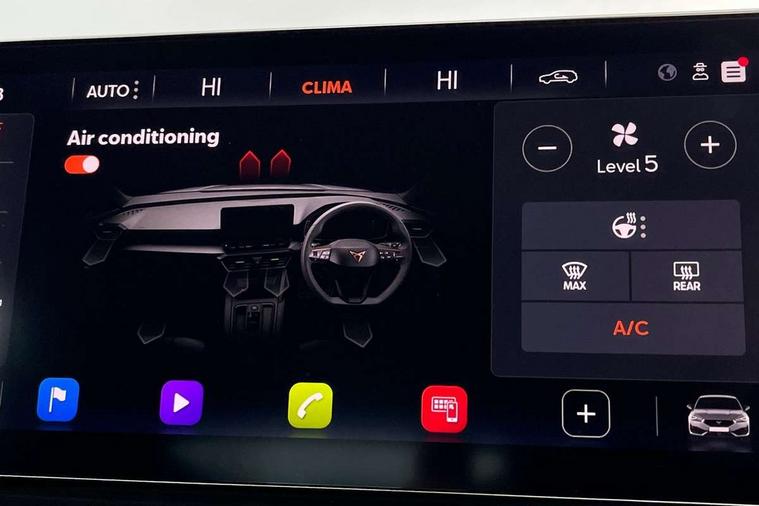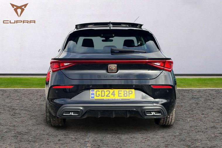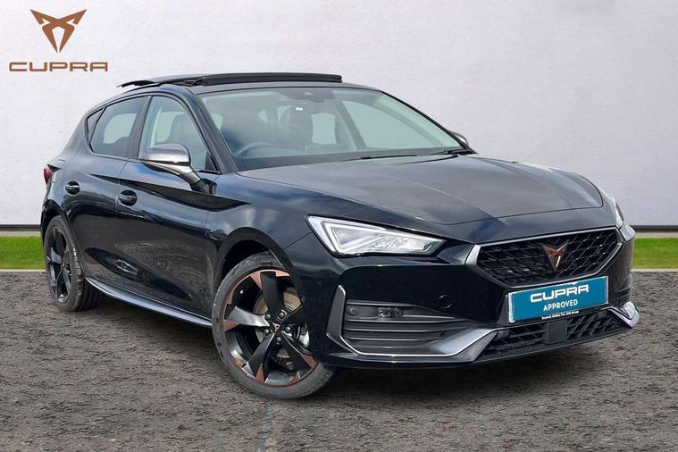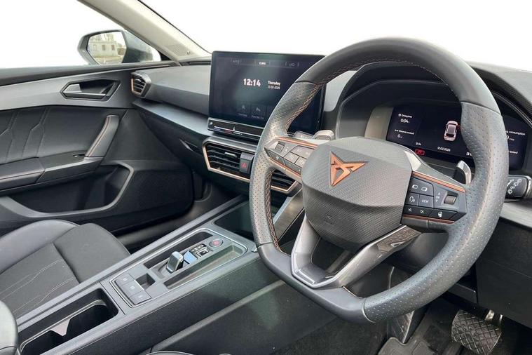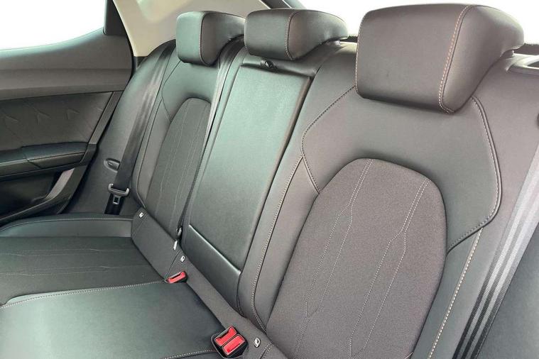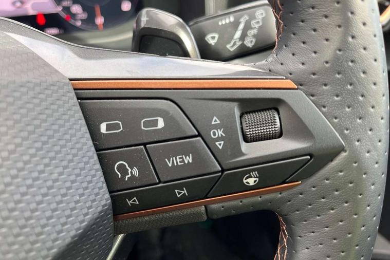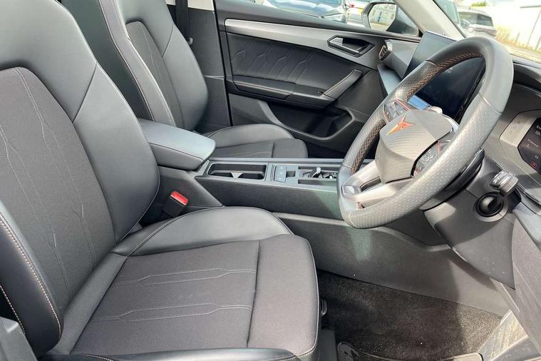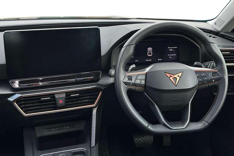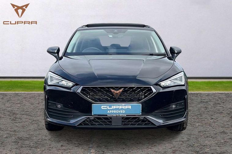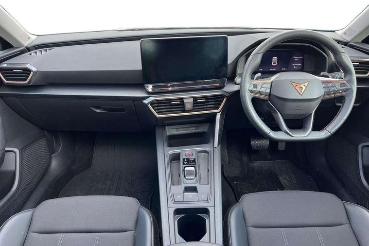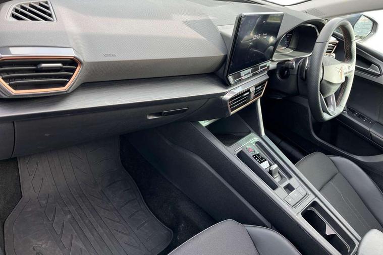 CUPRA drive profile selection with 4 modes (Comfort/Cupra/Sport/Individual), throttle response and gearshift mode, Digital cockpit, E-call, Electro mechanical speed sensitive power steering, Front assist with forward collision warning braking reaction to vehicles, pedestrians and cyclists, Full link smartphone integration with Mirror Link, wireless Apple CarPlay and wired Google Android Auto, Lane assist, Lockable tailgate, Park assist (inc front/rear parking sensors), Rear view camera, RPM, trip computer, outside temp gauge, instrument light brightness, low fuel warning light, lights on reminder, gearshift indicator, Service interval indicator, Start/stop system with regenerative braking, Wireless phone charger, Sports suspension, Auxiliary input socket, Auto dimming rear view mirror, Body colour door handles, Body coloured bumpers, Cupra sports bumpers, Dark tinted rear windows, Electric front/rear windows, Electrically adjustable, heated and folding door mirrors, LED front fog lamps with cornering function, LED headlights with dynamic turn signals, tail lights, rear fog lights with rear coast to coast lighting, Panoramic sunroof, Rain sensing wipers, Rear diffuser with twin exhaust pipe on each side, Rear side wing doors, Rear wash/wipe, Separate daytime running light with automatic headlight control and coming home feature, Third brake light, 12v power supply in centre console, 3 seat bench in 2nd row, 5 headrests, 60/40 split rear bench seat with armrest, Ambient lighting with glovebox, footwell and single monocolour, CUPRA Leather flat bottomed, heated, perforated steering and gearshift paddles, Driver/passenger manual seat height adjustment, Folding boot cover, Four x USB Type C ports (2 in front and 2 in rear), Front and rear reading lights X 4, Front centre armrest, Front seats manual lumbar adjustment, Grey headlining, Height/reach adjust steering wheel, Illuminated interior front door sills, ISOFIX points in outer rear seats with top tether anchorage points, Jack and tool kit, PVC/Cloth upholstery with copper stitching, Single front passenger seat, Sports seats, Storage pockets on rear of front seats, Sunvisors with illuminated mirror, Three zone climate control, Design pack - Cupra Leon, Media system plus with navigation pack - Leon Cupra, Safety and driving pack (M) - Cupra leon, 3 point seatbelts on all rear seats, ABS, Brake control system - ESC and brake booster, Child proof door locks, Cupra black brake calipers, Driver and front passenger airbags with front passenger airbag de-activation, front side and curtain airbags, Electronic parking brake, Extended safety system - seat belt tensioner, window closure and hazard lights, Hill hold control, Rear disc brakes, Seat belt reminder for front and rear seats, Tiredness recognition system, Tyre pressure monitoring system, Anti theft alarm system with interior monitoring in cab, backup horn and towing protection, KESSY Advanced - Keyless start, keyless entry, Locking wheel bolts, Chrome and copper interior detailing, 18" Machined sport black and copper alloy wheels with 92Y sport tyres,