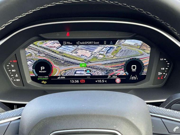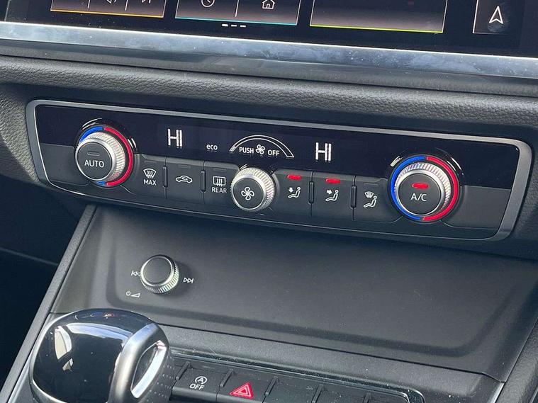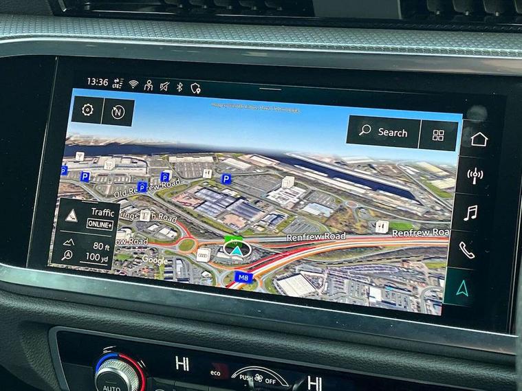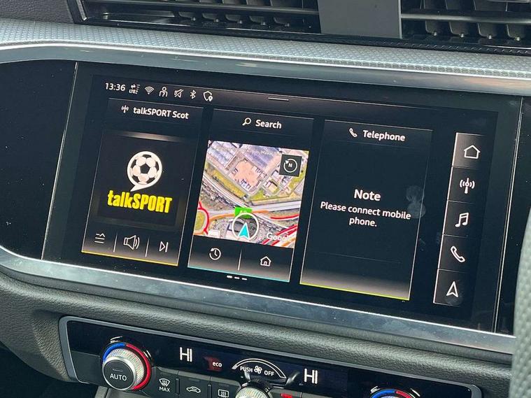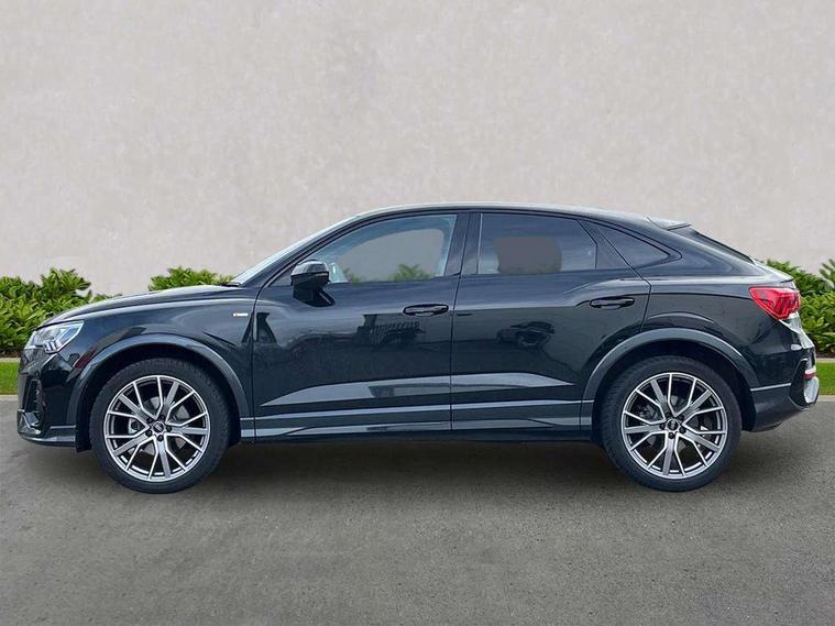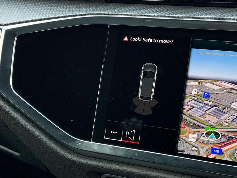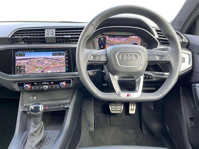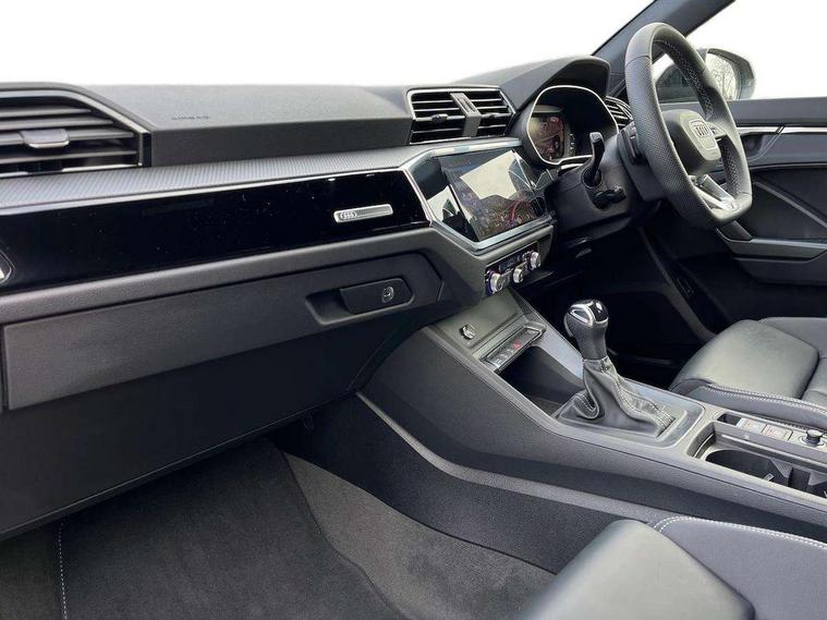 Audi connect safety and service, Audi drive select, Audi lane departure warning, Audi Virtual Cockpit - 10.25" display, Bluetooth interface, Camera based traffic sign recognition, Distraction and Fatigue warning, Legal emergency call, MMI Navigation Plus with high resolution 10.1 inch touchscreen colour display, Power operated tailgate, Progressive steering, Service interval indicator, Smartphone interface includes wireless Apple carplay/Android Auto, Start stop system with recuperation, Voice control system with natural language interaction, Sports suspension, 2 USB-C ports with charge and data functions, 6 passive loudspeakers, DAB digital radio module, Acoustic windscreen, Audi Beam uses LEDs to project the Audi logo onto the ground as you exit your Q3, Auto dimming door mirrors, Auto dimming frameless rear view mirror, Electrically folding, adjustable and heated door mirrors with integrated LED side indicators and kerb view function for passenger side, Front and rear electric windows, Front fog lights, Front underbody protection in manhattan grey paint finish, High gloss black finish B and C pillars, Honeycomb design radiator grille in matt anthracite black, LED Dynamic rear indicators, LED headlights with LED daytime running lights, LED rear lights, LED third brake light, Privacy glass dark tinted rear and rear-side windows (from B-pillar backwards), Rain and light sensors, Rear diffuser grille in grained matt black, Rear diffuser strip in matt anthracite black, Rear side wing doors, Rear underbody protection in matt black, Rear wiper, S line front and rear bumpers and side skirts in contrasting Manhattan grey paint finish, Variable front intermittent wipers, 12V socket in rear centre console, 3 seat bench in 2nd row, 40:20:40 folding with manual adjustment for 60:40 forwards/backwards position and backrest angle, Adjustable rear seat bench/backrest with centre armrest and cupholder, Black carpet mats, Black cloth headlining, Dual zone electronic climate control, Electric lumbar support, Front and rear black floor mats with contrast stitching in rock grey, Front and rear headrests, Front centre armrest, Height and reach adjustable steering wheel, Illuminated door sill trims with S logo, ISOFIX child seat mounting for front passenger with airbag deactivation and outer rear seat including top tether attachment point for outer rear seats, Luggage compartment sill protection in stainless steel, Manual front seats with height adjustment, Perforated leather gearknob, Single front passenger seat, Stainless steel pedals, Twin leather upholstery with front sport seats + S embossing, Black styling pack - Q3, Non smoking pack - Q3, 3x3 point rear seatbelts, 6 airbags - Driver, front passenger, curtain and side windows, Audi pre-sense front with pedestrain and cyclist recognition, Electrically operated child locks on rear doors, Electromechanical parking brake, Electronic stabilisation control including ABS, ASR and EDL, Front seatbelt reminder, Hill descent control, Hill hold assist, Pre sense basic, Seatbelt monitoring, Tyre pressure warning, Warning triangle and first aid kit, Anti theft wheel bolts, Immobiliser, Remote central locking, Thatcham approved category 1 anti theft alarm, Aluminium look interior elements, Detail dashboard around MMI touch colour display in glass look, black with surround in aluminium look, Leatherette door armrest, Piano black inlay,