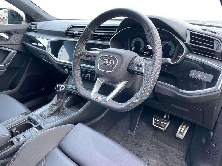 Amazon alexa Integration, Audi connect safety and service, Audi drive select, Audi lane departure warning, Audi Virtual Cockpit - 10.25" display, Bluetooth interface, Camera based traffic sign recognition, Distraction and Fatigue warning, Legal emergency call, MMI Navigation Plus with high resolution 10.1 inch touchscreen colour display, Power operated tailgate, Progressive steering, Service interval indicator, Smartphone interface includes wireless Apple carplay/Android Auto, Start stop system with recuperation, Voice control system with natural language interaction, Sports suspension, 2 USB-C ports with charge and data functions, 6 passive loudspeakers, DAB digital radio module, Acoustic windscreen, Audi Beam uses LEDs to project the Audi logo onto the ground as you exit your Q3, Auto dimming door mirrors, Auto dimming frameless rear view mirror, Black roof rails, Electrically folding, adjustable and heated door mirrors with integrated LED side indicators and kerb view function for passenger side, Front and rear electric windows, Front fog lights, Grille vertical bars in aluminium silver/Matt, High gloss black finish B and C pillars, LED Dynamic rear indicators, LED headlights with LED daytime running lights, LED rear lights, LED third brake light, Privacy glass dark tinted rear and rear-side windows (from B-pillar backwards), Rain and light sensors, Rear diffuser grille in grained matt black, Rear diffuser strip in matt anthracite black, Rear side wing doors, Rear wiper, S line bumpers in contrasting Manhattan grey, Variable front intermittent wipers, 12V socket in rear centre console, 3 seat bench in 2nd row, 40:20:40 folding with manual adjustment for 60:40 forwards/backwards position and backrest angle, Adjustable rear seat bench/backrest with centre armrest and cupholder, Black cloth headlining, Dual zone electronic climate control, Electric lumbar support, Front and rear black floor mats with contrast stitching in rock grey, Front and rear headrests, Front centre armrest, Height and reach adjustable steering wheel, Illuminated door sill trims with S logo, ISOFIX child seat mounting for front passenger with airbag deactivation and outer rear seat including top tether attachment point for outer rear seats, Manual front seats with height adjustment, Perforated leather gearknob, Single front passenger seat, Stainless steel luggage compartment sill finisher, Stainless steel pedals, Twin leather upholstery with front sport seats + S embossing, Black styling pack - Q3, Non smoking pack - Q3, 3x3 point rear seatbelts, 6 airbags - Driver, front passenger, curtain and side windows, Audi pre-sense front with pedestrain and cyclist recognition, Electrically operated child locks on rear doors, Electromechanical parking brake, Electronic stabilisation control including ABS, ASR and EDL, Front seatbelt reminder, Hill descent control, Hill hold assist, Pre sense basic, Seatbelt monitoring, Tyre pressure warning, Warning triangle and first aid kit, Anti theft alarm, Anti theft wheel bolts, Immobiliser, Remote central locking, Aluminium look interior elements, Detail dashboard around MMI touch colour display in glass look, black with surround in aluminium look, Leatherette door armrest, Piano black inlay,