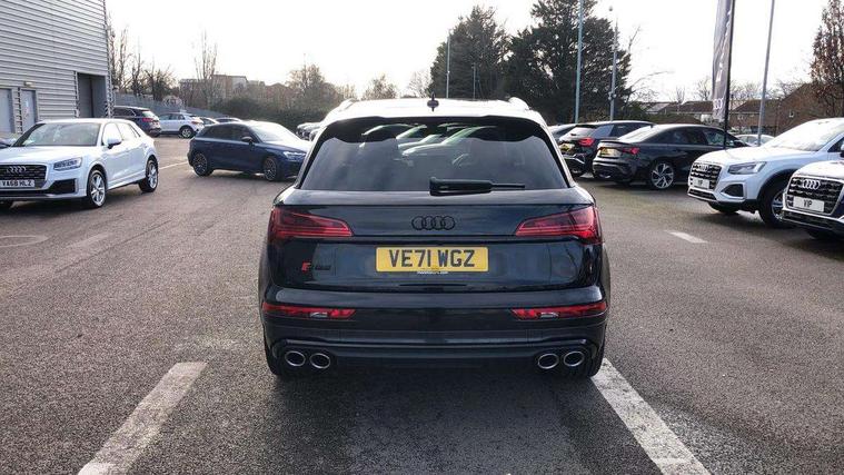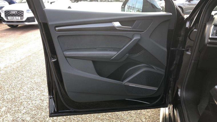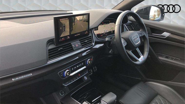 360 degree camera with top view, Advanced key with electric hands free boot opening system, Audi connect safety and service (e-call), Audi connect with Amazon Alexa Integration, Audi drive select, Audi phone box with wireless charging, Audi virtual cockpit plus with 12.3" screen and three different layout designs, Audi wireless smartphone interface, Automatic start-stop system with coasting functionality and efficiency programme, Bluetooth interface, Electro - mechanical power assisted steering, Head up Display, MMI navigation plus with 10.1" touch screen, Park assist with parking aid plus, Power tailgate, Service interval indicator, Voice control system with Audi hotword activation "Hey Audi", 70 litre fuel tank and 24 litre AdBlue tank, Diesel particulate filter, Quattro with sport differential, S adaptive air suspension, 2 x USB charging port with aux input socket, Bang + Olufsen sound system, DAB Digital radio, Acoustic windscreen, Audi beam with 'Vorsprung' logo, Auto dimming door mirrors, Auto dimming rear view mirror, Automatic headlights and windscreen wipers, Black roof rails, Body colour bumpers, Body colour underbody protection, Chrome plated exhaust trims, Contrast bumpers in Manhattan grey, Daytime running lights, Door sills in Selenite silver, Electric adjustable/heated/folding door mirrors, Electric panoramic glass sunroof, Front air inlet surrounds in titanium black, Front and rear electric windows, Gloss black finish for Audi rings and SQ5 logos, Headlight washers, High gloss black B pillar trims and triangular rear door trim, High level LED brake light, Matrix LED headlights with dynamic front and rear indicators, Rear chrome trim strip below lights, Rear privacy glass and rear side windows, Rear side wing doors, Rear spoiler, Rear wiper, Roof bars, Running boards, S front and rear bumpers, S Line side skirts, S specific rear diffuser, 3 rear headrests, 3 spoke flat bottomed multi-function leather steering wheel, 4 way electric lumbar support for driver and front passenger, 40:20:40 split folding 3 rear bench seat in 2nd row with rear centre armrest, Black cloth headlining, Comfort front centre armrest, Contrast stitching on seats, steering wheel and gear lever gaiter, Deluxe 3 zone electronic climate control, Fine Nappa leather upholstery with diamond pattern contrast stitching + front sport seats with S embossed logo, Front/rear floor mats, Fully electrically adjustable seats, Gear lever in black leather, Heated front and outer rear seats, Height adjustable front head restraints, Illuminated door sill trims with S logo, ISOFIX child seat mounting and top tether, Luggage compartment cover, Massage function for front seats, Rear seat bench plus, Removable luggage compartment floor, Single front passenger seat, Stainless steel pedals, Sunvisors with vanity mirrors, Black styling package - Q5, City Assist pack - Q5, Extended interior upholstery pack - Q5, Extended LED Interior multi coloured Lighting Pack - Q5, Tour pack - Q5, 3 point seatbelts on all seats, 6 airbags - Driver, front passenger, curtain and side airbags, Electrically operated child locks on rear doors, Electromechanical parking brake, Electronic stabilisation control including ABS, ASR and EDL, Front passenger airbag deactivation, Hill descent control, Hill hold assist, Multi collision brake assist, Pop-up bonnet for pedestrian protection, Pre sense city, Seat belt force limiter, Seatbelt monitoring, Tyre pressure warning, Warning triangle and first aid kit, Anti theft alarm, Anti-theft wheel bolts, Keyless Go access/ignition system, Remote central locking, Carbon atlas inlays, Tool kit, Tyre repair kit,