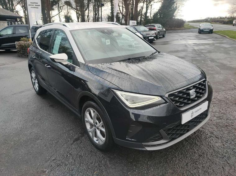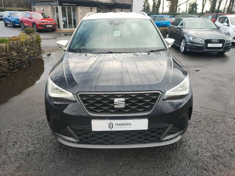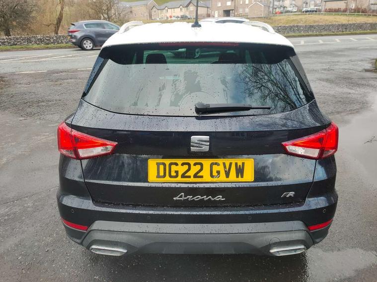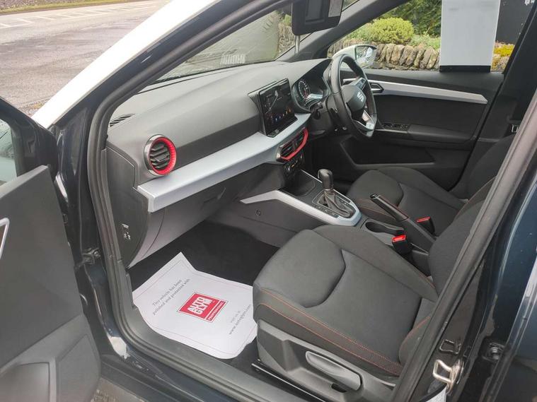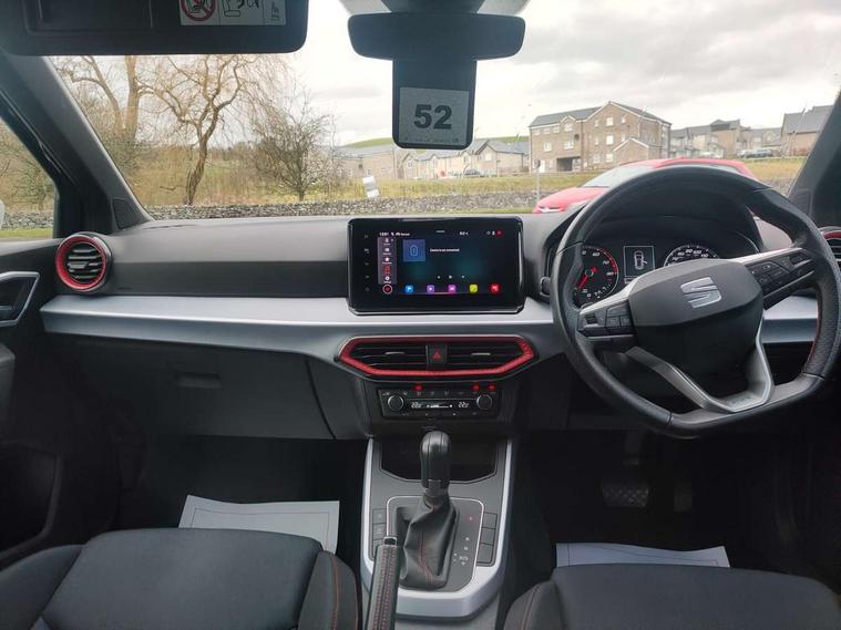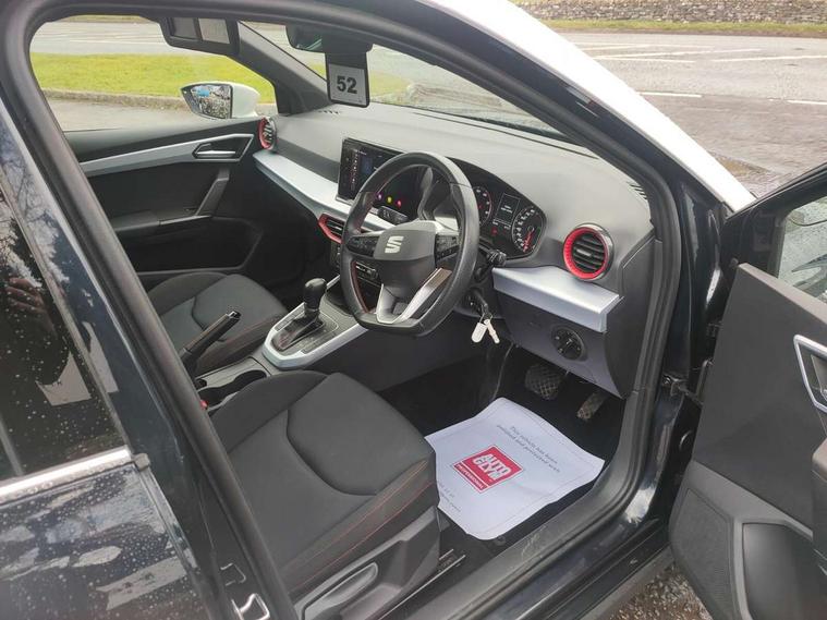 'Lights On' Reminder warning buzzer, Digital clock, E-call, Electric speed sensitive power steering, Full Link Smartphone Integration with Mirror Link, Apple Car Play, Google Android Auto with USB Type C cable for Apple and Android compatibility, Lane keeping system, Low fuel warning light, Outside temperature display, Rear parking sensor, RPM counter, Seat connect with safety, service, remote and online, SEAT Drive profile - Four different models normal-sport-eco-individual, steering response, throttle response and gear shifts mode, Trip computer, Bluetooth interface for hands free and audio streaming, DAB digital radio and AM/FM radio, Steering wheel mounted audio controls, Anti theft roof antenna, Auto dimming interior rear view mirror, Automatic activation of hazard warning lights, Body coloured bumpers, Body coloured door handle inserts, Chrome roof rails and window surrounds, Chrome window trim, Dark tinted rear windows, Electric front/rear windows, Electrically adjustable, heated and folding door mirrors, FULL LED automatic headlights with dynamic headlight range control, coming and leaving home, LED daytime running lights, LED rear tail lights and licence plate lights, Protective side mouldings, Rain sensing wipers, Rear side wing doors, Rear spoiler, Rear window wash/wipe, Roof colour door mirrors, Third brake light, Twin exhaust pipe styling hidden exhaust pipe, Visible VIN plate, Windshield wiper with intermittent control and potentiometer, 2 cupholders, 3 seat bench in 2nd row, 60/40 split folding rear seat, Aircare filter, Black interior roof, Cloth upholstery, Daring red Illuminated coloured air vent, Double boot floor, Driver sunvisor with covered mirror + card holder, Dual zone climate control, Front courtesy light with front and rear reading lights, Front sport seats, Gear shift indicator, Height adjustable front seats, Height/reach adjustable steering column, Illuminated boot, Instrument lighting with brightness control, Interior ambient lighting, Interior light in footwell, central console and door panel, ISOFIX points in outer rear seats with top tether anchorage points, Passenger sunvisor with vanity mirror, Perforated flat bottomed leather steering wheel/gear knob/handbrake with red stitching and FR logo, Single front passenger seat, Steering wheel mounted gearshift paddles, Two front and three rear height adjustable headrests, Connectivity pack plus - Arona, Interior chrome pack - Arona, 3 point seatbelts on all rear seats, ABS, Active front headrests, Child locks on rear doors, Driver and front passenger airbags with front passenger airbag de activation, front side and curtain airbags, Electronic stability control, Emergency Brake Assist (EBA) and front assist, Front and rear seatbelt reminder, Hill hold control, Multi-Collision braking, Tiredness recognition system, Traction control, Tyre pressure monitoring system, Alarm with back-up horn, Electronic engine immobiliser, Locking wheel bolts, Remote central locking + deadlocks, Tow away protection, Titan black dashboard, 17" Dynamic alloy wheels,