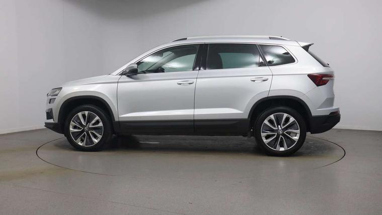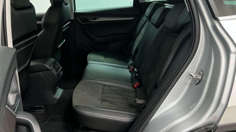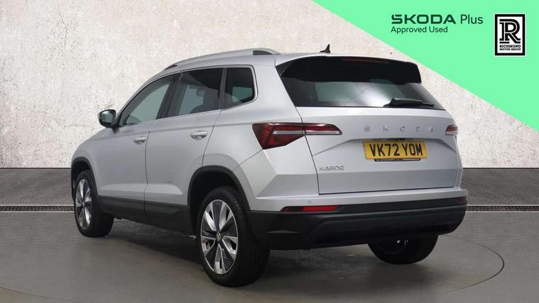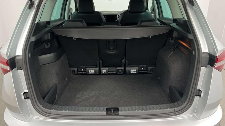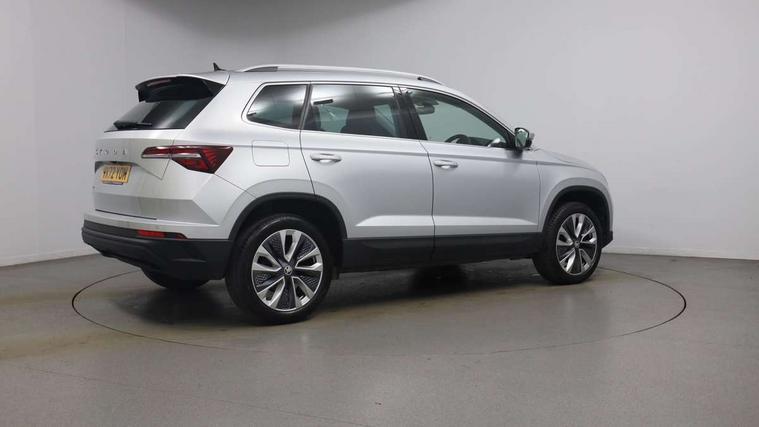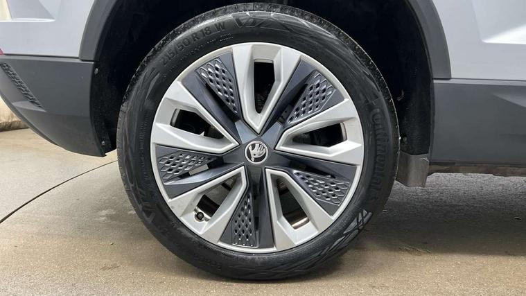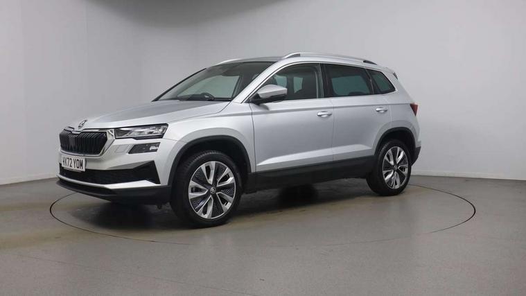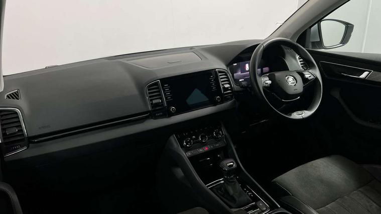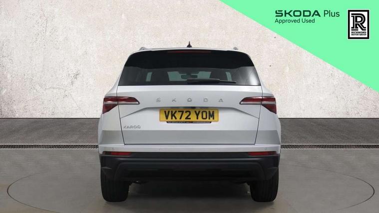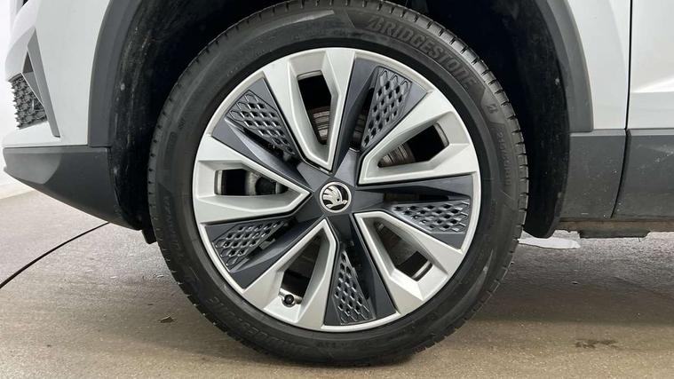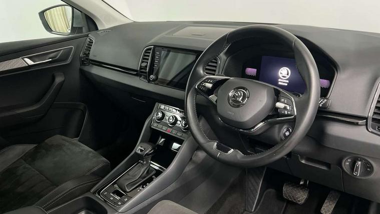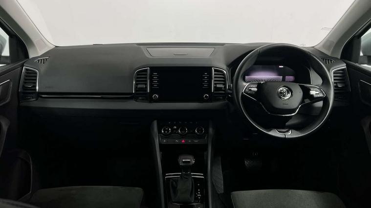 8" Digital display, Care connect, Driver fatigue sensor, Emergency services call system, Outside temperature gauge, Service interval indicator, SmartLink wireless for Apple and wired for Android, Start/stop system with regenerative braking, USB C Port x 2 in front centre console, 8 Speakers, DAB radio with Bluetooth, USB connection, Acoustic glass, Aero front windscreen wipers with intermittent function, Auto dimming rear view mirror with light and rain sensors, Black electric window control buttons, Body colour door mirrors and handles, Dynamic headlight range control with cornering light function, Electric front and rear windows with child proof lock, Heated rear windscreen, LED daytime running lights, LED rear lights with high functionality welcome effect and dynamic indicators, Light assistant (coming/leaving home/tunnel light), Plastic scuff plates, Privacy glass, Rear side wing doors, Rear spoiler, Rear window wiper with washer system and intermittent control, Safety reflectors on front doors, 1.5 litre bottle holders in driver and front passenger door panels, 12V socket in boot, 12v socket in front centre armrest with storage compartment and rear air vents, 2 Folding hooks and nets in boot, 2 spoke leather heated multifunction steering wheel with DSG paddles, 2 x Tablet holder, 3 rear height adjustable headrests, 3 seat bench in 2nd row, 4 foldable roof handles with rear coat hooks, Black floor carpet, Chrome inner door handles, Decorative door sills with KAROQ badging, Double sided boot floor, Foldable hooks in the boot, Front head restraints, Height adjustable front three point seats belts with tensioners, Height/reach adjust steering wheel, Ice scraper, Illuminated glovebox, Illuminated luggage compartment, Isofix child seat preparation for front passenger seat, Isofix child seat preparation outer rear, Manual lumbar support for front seats, Pen holder, Pollen filter, Rear boot cover, Rear reading lights, Rubbish bin door, Safety vest holder, Single front passenger seat, Storage box in upper central dashboard closed, Sunvisors with illuminated vanity mirrors, Textile floor mats, Ticket holder, VarioFlex seats with standard rear seat release, Chrome roof rails + chrome pack - Karoq, Parking pack - Karoq, Automatic door unlocking in case of crash, Automatic fuel cut off in case of crash, Child locks on rear doors, Driver airbag, Electronic parking brake with auto hold function, Emergency rear braking signal, ESC including ABS, MSR, ASR, EDS, HBA, DSR, RBS, MKB and traction control, Front side airbags, Hill hold control, Knee airbags, Passenger airbag with switch-off function, Pedestrian monitor, Seatbelt reminder signalisation and pretensioner for all seats, Three point seatbelts rear, Two tone horn, Tyre pressure display, Tyre pressure monitor, Alarm with interior monitoring, back up horn and tilt sensor with safe function, Electronic engine immobiliser, Keyless entry and start/stop, Remote central locking with 2 remote folding keys, Chrome framed air vents, Anti-theft wheel bolts protection, Storage on wheel cover, Tool kit,