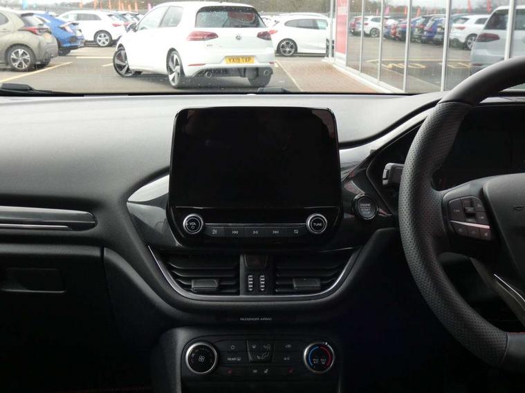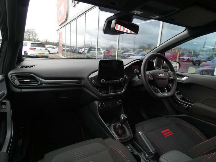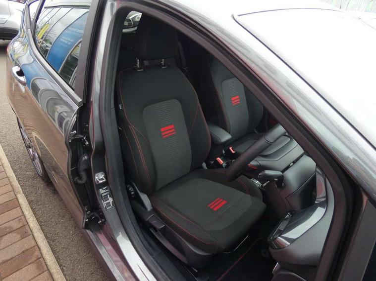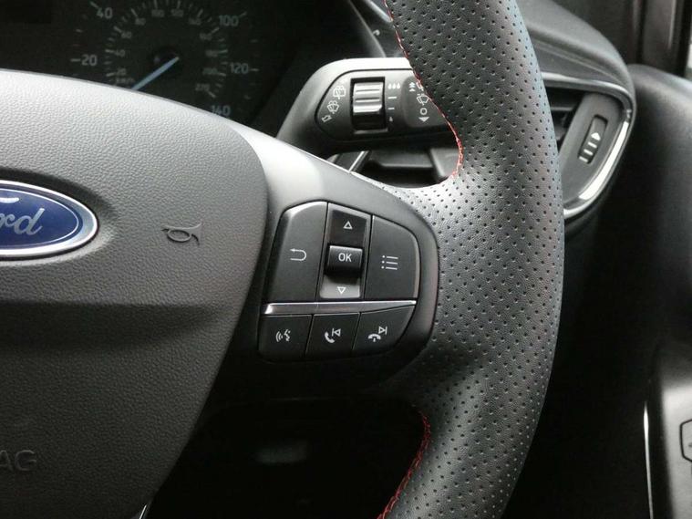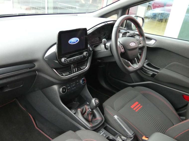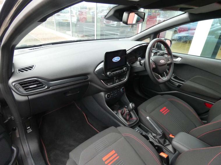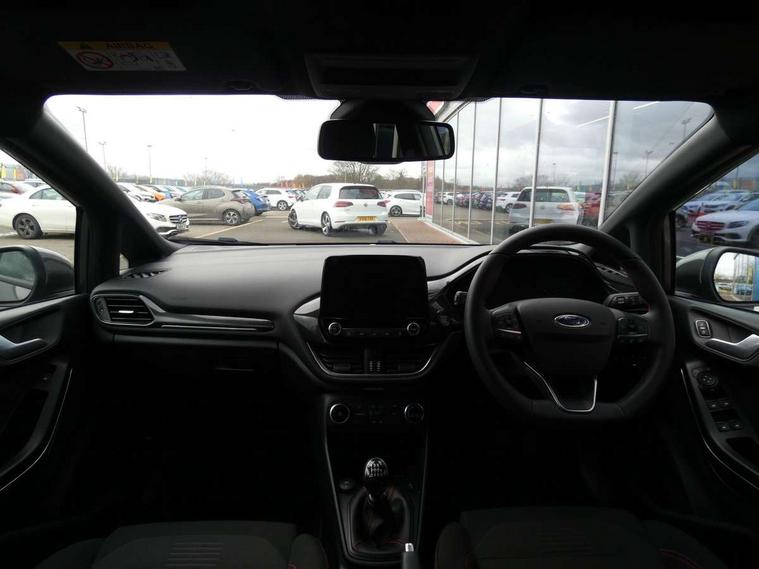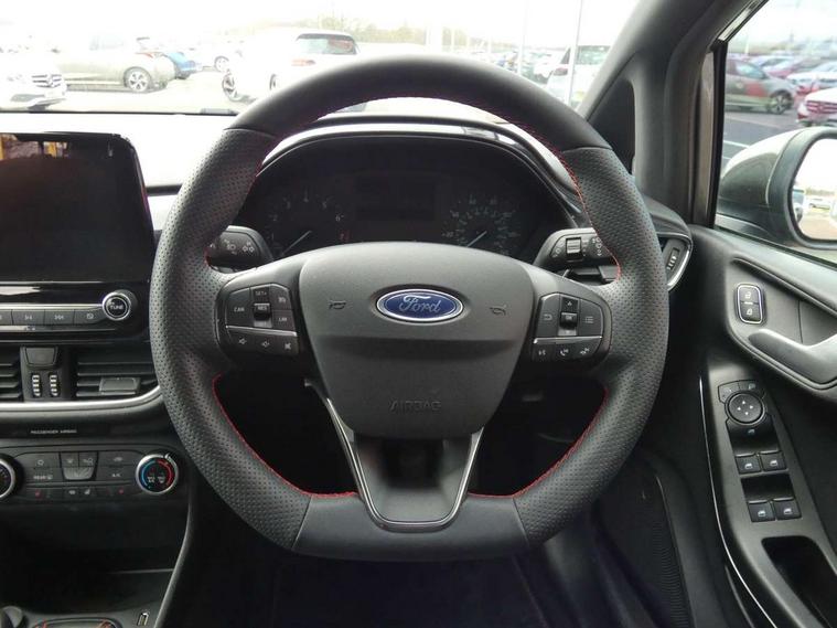 Bluetooth system, Electric power steering, Ford easy fuel, Ford SYNC 3 Navigation system incl 8" touchscreen, 7 speakers, FordPass connect, Apple carplay, android auto, voice control and emergency assistance, Rear parking distance sensors, Selectable drive modes (Normal, Sport, Track), Trip computer, Sports suspension, 2 USB ports, Auxiliary input socket, DAB Digital radio, Steering wheel mounted controls, Body colour bumpers, Body colour door handles, Body colour large rear spoiler, Body coloured electrically operated and heated door mirrors with side indicators, Cornering front fog lights, Electric front windows/one touch facility, Electric rear windows, LED Night signature to rear lights, Quickclear heated windscreen, Rain sensing wipers and auto dimming rear view mirror, Rear privacy glass, Rear wiper, Unique ST-Line upper grille & full bodystyling kit with ST-Line wing badges, 3 spoke flat bottomed leather steering wheel, 60/40 split folding rear seat, Adjustable head restraints, Black headlining, Boot carpet, Centre console with opening armrest, 2x cupholders, 12v and USB, Chrome inner door handles, Cloth upholstery, Footwell illumination, Front floor mats in velour, Front map reading lights, Front seat and rear pockets, Illuminated glovebox, Leather gaiter, Load area light, Manual 2 way passenger seat adjust, Manual 4-way driver seat adjust, Manual air conditioning, Overhead console with sunglasses holder, Pollen filter, Rake/reach adjustable steering wheel, Sensico wrapped steering wheel, Sports front seats, NCAP Pack - Fiesta, 3 point seatbelts on all rear seats, ABS+EBA, Curtain airbags, Driver and passenger airbags, Drivers knee airbag, Electronic stability control with hill start assist, Front passenger airbag deactivation, Front side airbags, Seatbelt warning, Two tone horn, Tyre pressure monitoring system, Keyless start with 'Ford Power' starter button, MyKey system, Remote central locking & engine immobiliser, Thatcham Cat.1 alarm, 17" 5 spoke alloy wheels with rock metallic finish,