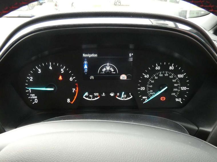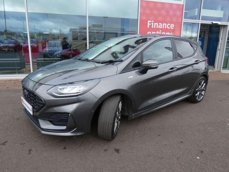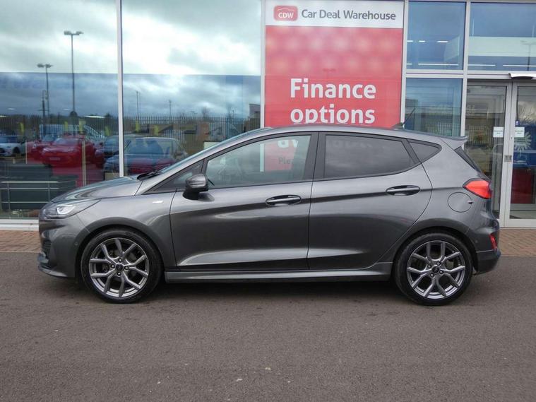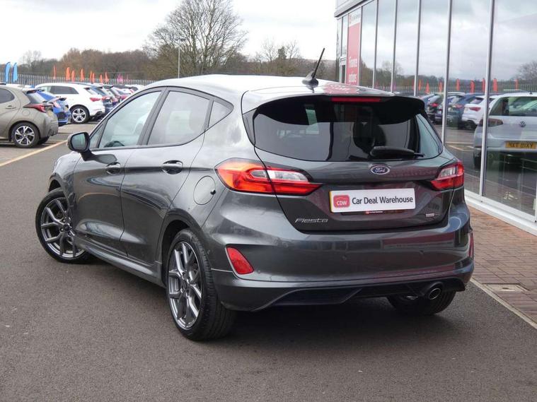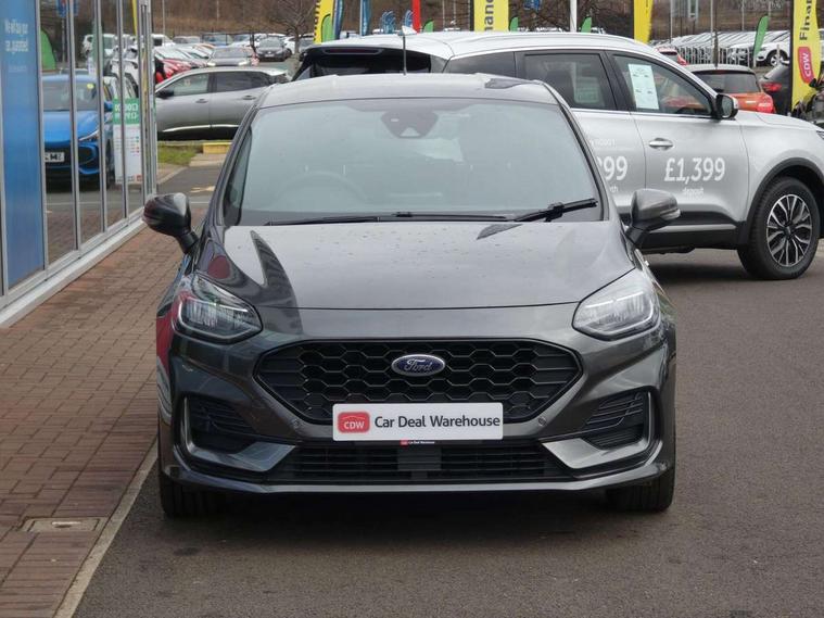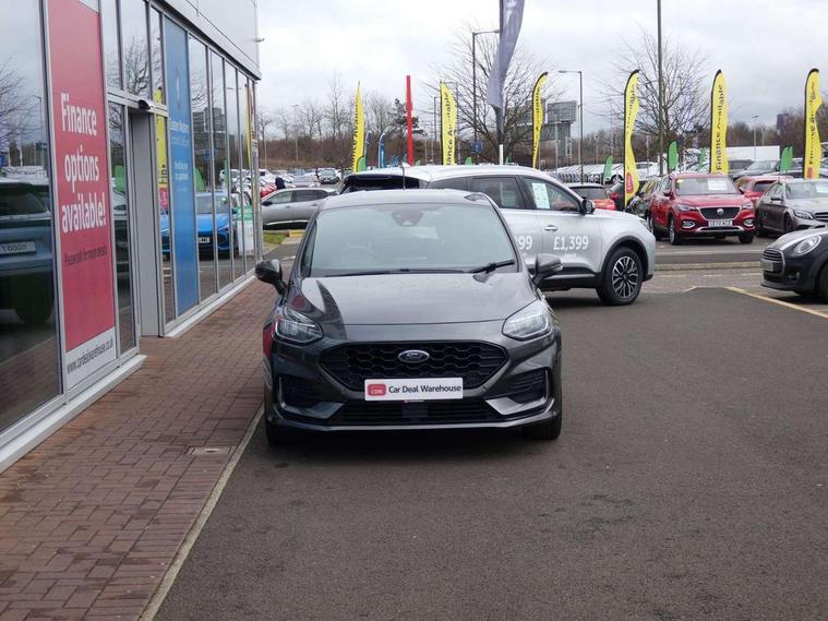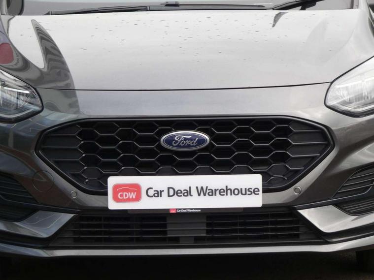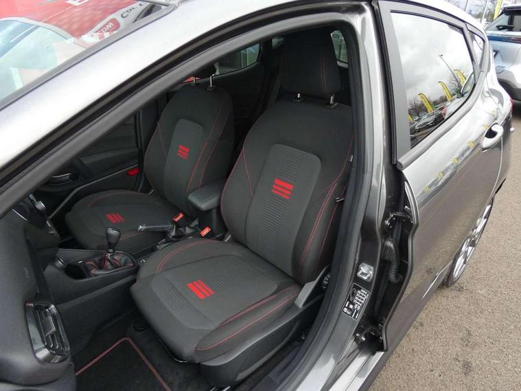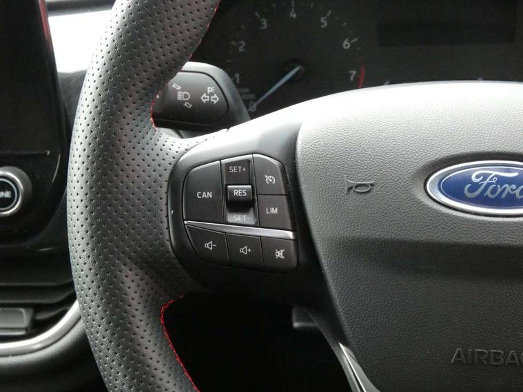 Bluetooth system, Electric power steering, Ford easy fuel, Ford SYNC 3 Navigation system incl 8" touchscreen, 7 speakers, FordPass connect, Apple carplay, android auto, voice control and emergency assistance, Rear parking distance sensors, Selectable drive modes (Normal, Sport, Track), Trip computer, Sports suspension, 2 USB ports, Auxiliary input socket, DAB Digital radio, Steering wheel mounted controls, Body colour bumpers, Body colour door handles, Body colour large rear spoiler, Body coloured electrically operated and heated door mirrors with side indicators, Cornering front fog lights, Electric front windows/one touch facility, Electric rear windows, LED Night signature to rear lights, Quickclear heated windscreen, Rain sensing wipers and auto dimming rear view mirror, Rear privacy glass, Rear wiper, Unique ST-Line upper grille & full bodystyling kit with ST-Line wing badges, 3 spoke flat bottomed leather steering wheel, 60/40 split folding rear seat, Adjustable head restraints, Black headlining, Boot carpet, Centre console with opening armrest, 2x cupholders, 12v and USB, Chrome inner door handles, Cloth upholstery, Footwell illumination, Front floor mats in velour, Front map reading lights, Front seat and rear pockets, Illuminated glovebox, Leather gaiter, Load area light, Manual 2 way passenger seat adjust, Manual 4-way driver seat adjust, Manual air conditioning, Overhead console with sunglasses holder, Pollen filter, Rake/reach adjustable steering wheel, Sensico wrapped steering wheel, Sports front seats, NCAP Pack - Fiesta, 3 point seatbelts on all rear seats, ABS+EBA, Curtain airbags, Driver and passenger airbags, Drivers knee airbag, Electronic stability control with hill start assist, Front passenger airbag deactivation, Front side airbags, Seatbelt warning, Two tone horn, Tyre pressure monitoring system, Keyless start with 'Ford Power' starter button, MyKey system, Remote central locking & engine immobiliser, Thatcham Cat.1 alarm, 17" 5 spoke alloy wheels with rock metallic finish,