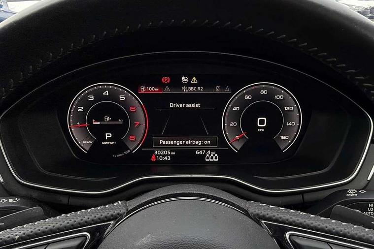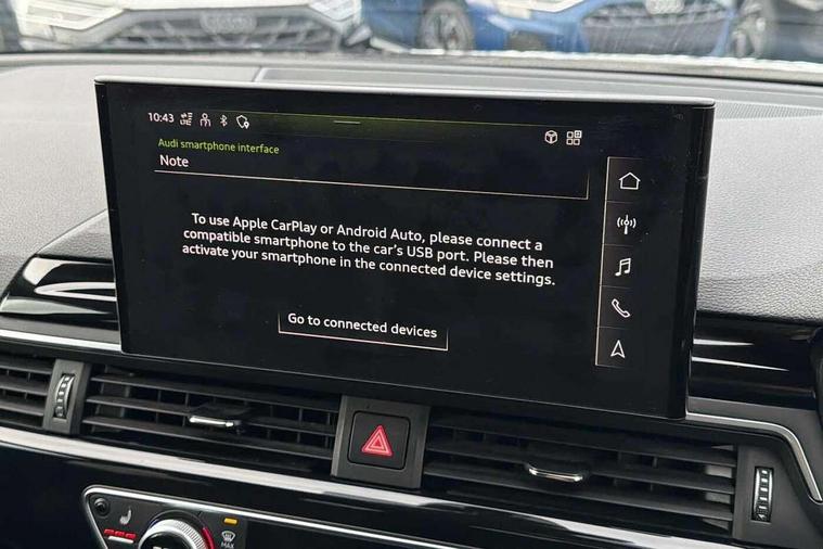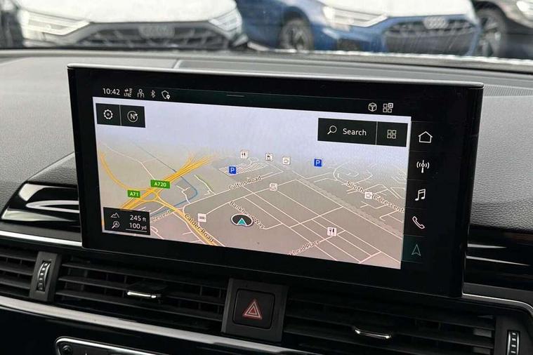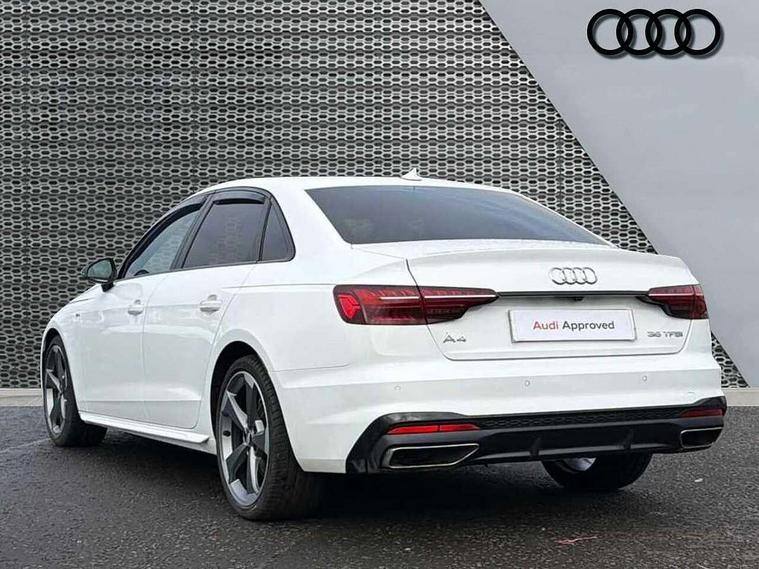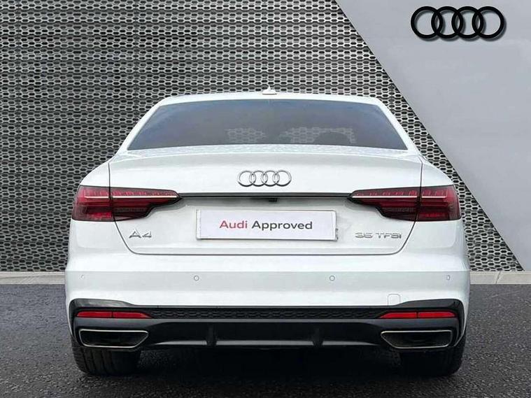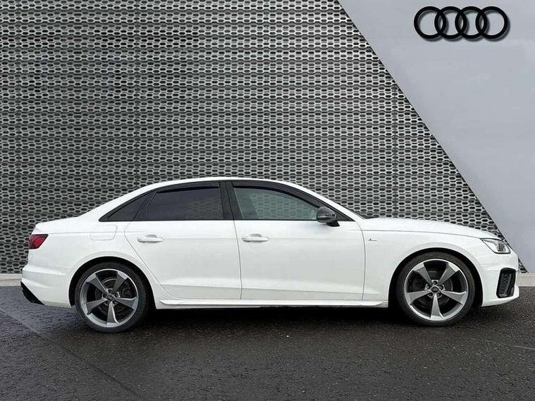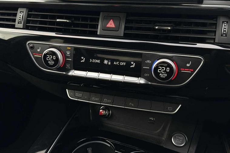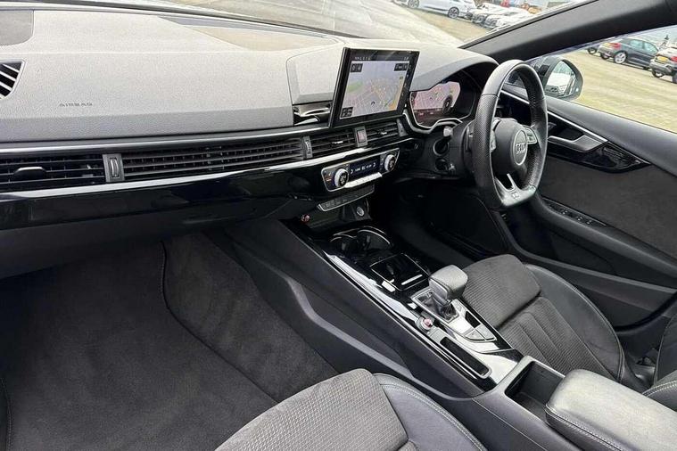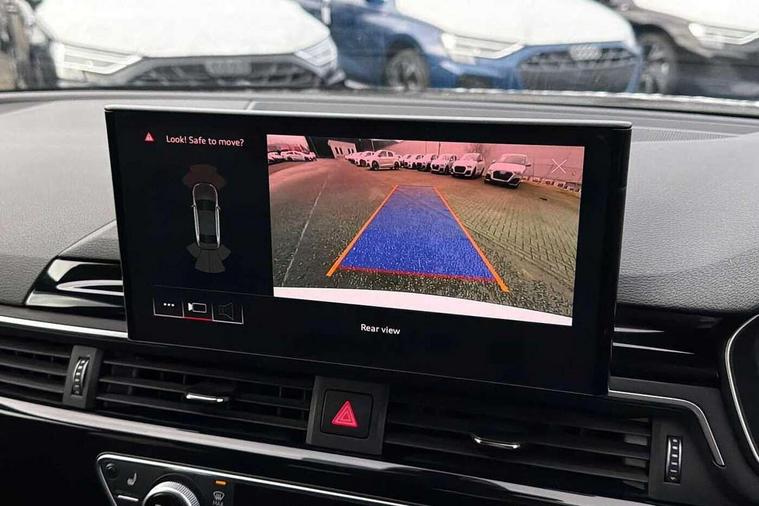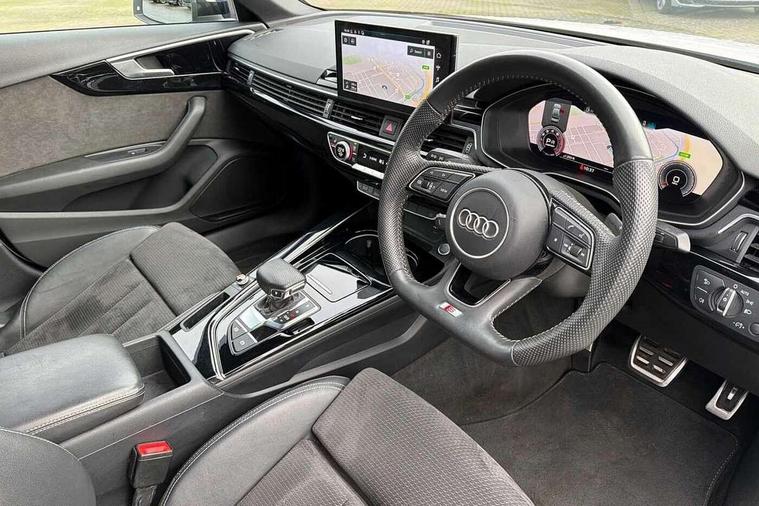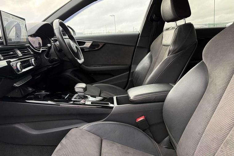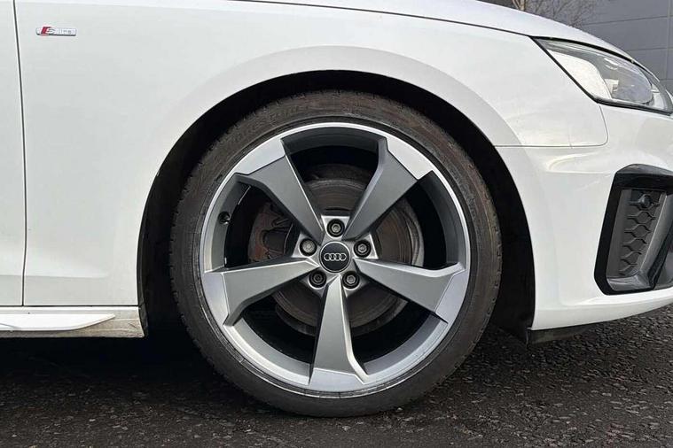 Audi connect safety and service (e-call), Audi drive select, Audi parking system plus with front and rear sensors, Audi smartphone interface, Audi virtual cockpit, Automatic start-stop system with coasting functionality and efficiency programme, Bluetooth interface, Electric boot lid release, Electromechanical power steering, MMI Navigation plus with MMI touch includes 10.1" high resolution colour MMI display, 3D map, Rear view camera, Voice control system, 54 litre fuel tank, Sports suspension lowered by 23mm, 2 USB charging ports, 8 passive loudspeakers, DAB digital radio reception, Auto dimming rear view mirror, Body colour door handles, Body colour front spoiler lip, Body colour side sill trim, Electrically folding auto dimming/adjustable/heated door mirrors with LED side indicators and kerb view function for passenger side, Grained matt black side air inlets with matt aluminium silver inlay, High beam assistant, LED headlights with LED rear lights + dynamic rear indicators + headlight adjustment and high beam, turning light + LED daytime running lights, Matt aluminium silver tailpipe trim, New design rear diffuser, Privacy glass, Rain and light sensors, S Line badges on the front wings, S line front and rear bumpers with side skirts, S Line rear diffuser in matt titanium black with trim strip in matt aluminium silver, Windscreen with acoustic glazing, 3 spoke flat bottomed high multi-function leather sport steering wheel with gearshift paddles, 4 way electric lumbar support for driver and front passenger, 40/20/40 split folding 3 rear seat bench in 3 parts with rear centre armrest, Black cloth headlining, Black perforated leather gearknob, Contrast stitching on seats, steering wheel and gear lever gaiter, Deluxe 3 zone electronic climate control, Door sill trims with aluminium inlay, Front and rear head restraints, Front centre armrest, Heated front seats, Illuminated door sill trims with S logo, ISOFIX child seat mounting and top tether, Manual seat adjustment, Stainless steel pedals and foot rest, LED Interior light pack - A4/S4, Titanium black styling pack - A4 Saloon, 3 rear seatbelts, 6 airbags - Driver, front passenger, curtain and side windows, Electronic Stabilisation Control (ESC) including ABS, ASR and EDL, Hill hold assist, Multi collision brake assist, Pop-up bonnet for pedestrian protection, Pre sense city, Seatbelt monitoring, Warning triangle and first aid kit, Anti theft alarm, Anti theft wheel bolts, Keyless Go, Piano black finish inlay, 19" 5 arm rotor design alloy wheels titanium matt look, Tool kit, Tyre repair kit,