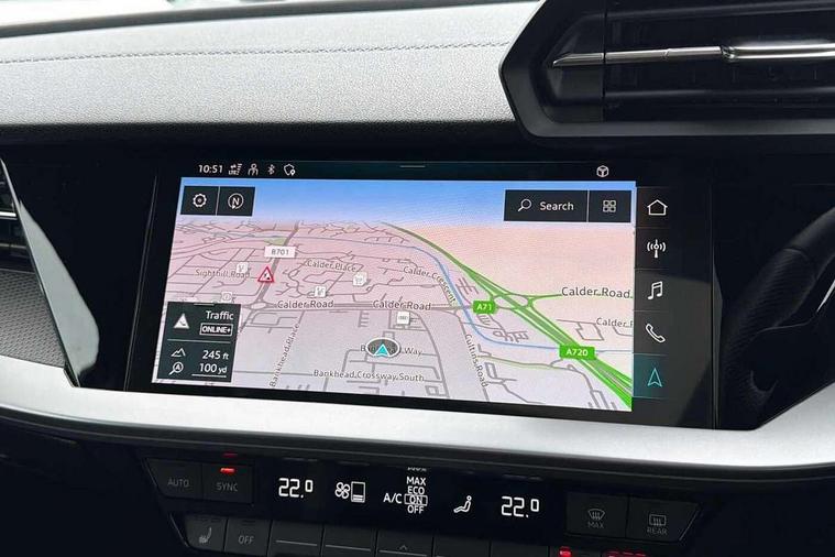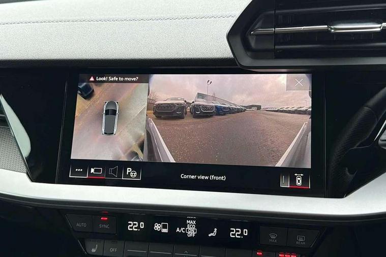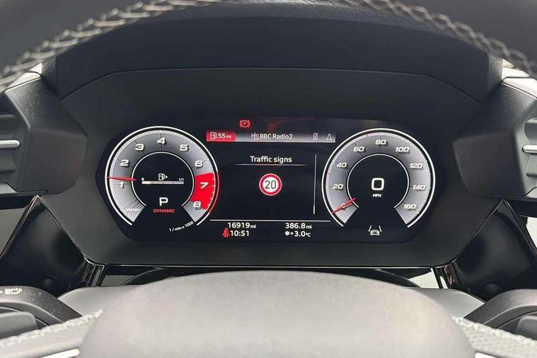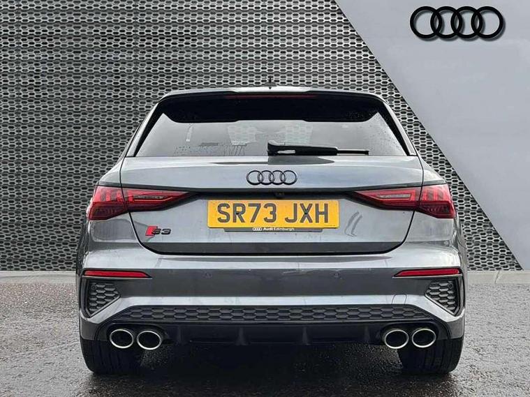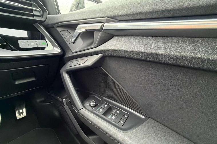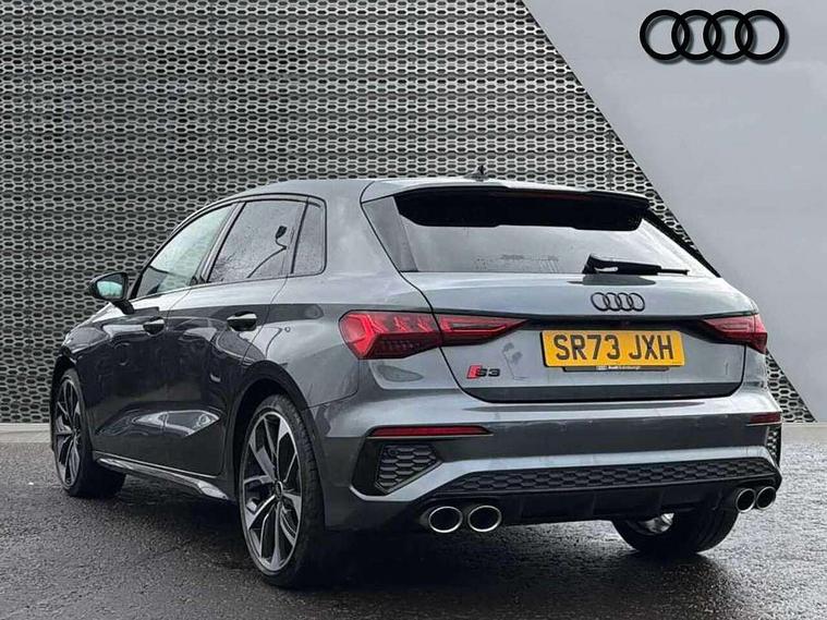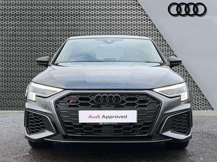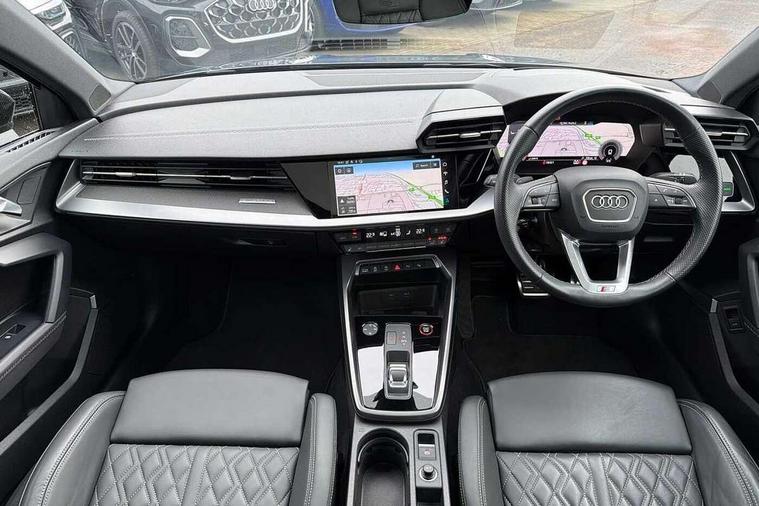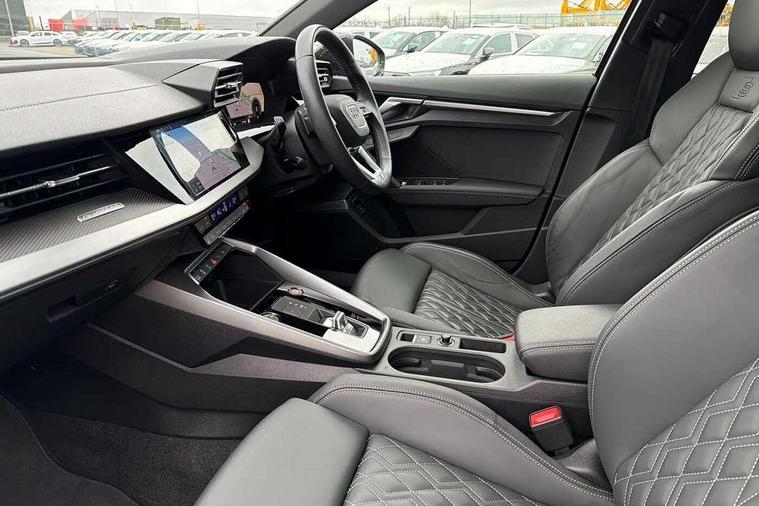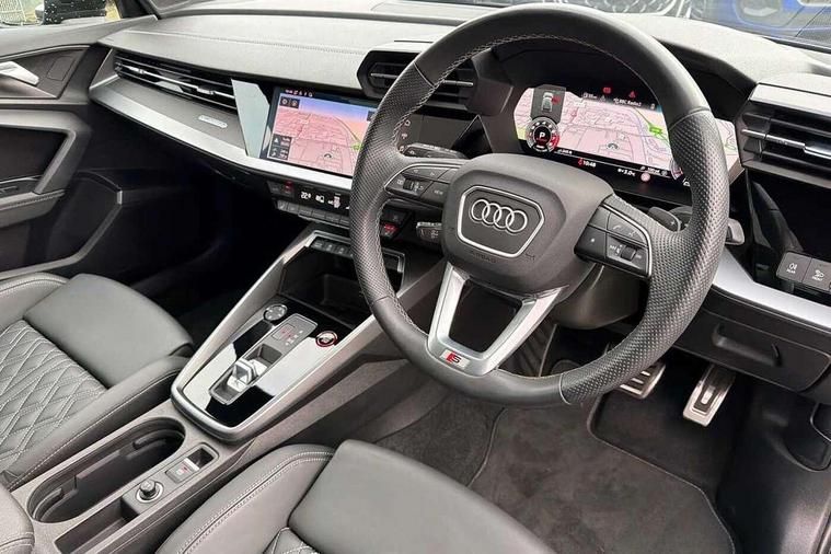 Adaptive cruise assist, Audi drive select (Auto, Comfort, Dynamic, Efficiency and Individual), Audi smartphone interface, Audi virtual cockpit plus - 12.3" full HD resolution dynamic digital instrument cluster, Automatic start/stop system with recuperation, Bluetooth interface, Collision avoidance assistant, e-Call (emergency call), Head up Display, Lane change assistant with exit warning system and rear cross traffic alert, Lane departure warning system, MMI Navigation Plus with high resolution 10.1" colour touch screen display, Power operated tailgate - Luggage compartment lid opens/closes electrically, Progressive steering, Service indicator, Trip computer, Voice control system with natural language interaction, Quattro permanent all wheel drive, S suspension with damper control, 2xUSB-C connection with data and charging functions, DAB Digital radio, 3rd brake light, Acoustic glass windscreen, Audi Beam uses LEDs to project Vorsprung onto the ground as you exit your S3, Auto dimming frameless rear view mirror, Carbon door mirror housings, Dual branch oval twin tailpipes in chrome plated finish, Electrically adj heated/folding + automatically dimming exterior mirrors with memory + automatic kerb side function for passenger side exterior mirror, Front electric windows, Headlight washers, Heat insulating glass windscreen, Illuminated door sills with aluminium inserts at the front with S logo, Integrated LED indicators in door mirrors, LED daytime running lights, Light and rain sensors, Privacy glass - dark tinted rear window, rear door and side windows, Rear electric windows, Rear side air outlets in grained matt black, Rear side wing doors, Rear wiper, 12V socket and storage compartment in front centre console, 3 seat bench in 2nd row, 3 spoke leather multifunction steering wheel with gear shift paddles, 4 way electrically adjustable lumbar support for driver and front passenger, 60/40 split folding rear seat bench, Black cloth headlining, Dual zone electronic climate control, Fine Nappa leather upholstery with front sports seats S embossed logo, Front and rear centre armrest in artificial leather, Front and rear headrests, Front/rear floor mats, Height and reach adjustable steering wheel, Interior lighting - glove compartment light and right hand side, Luggage compartment floor covering, Seat side bolsters, Single front passenger seat, Stainless steel pedals and front footrest in black, Aluminium interior elements pack - A3 Sportback, Black styling pack - A3 Sportback/S3, Body styling design pack - S3, Extended ambient lighting pack - A3 Sportback, Storage pack - A3 Sportback, Technology pack pro with 360 camera - A3 Sportback/Voursprung, 3x3 point rear seat belts, Driver and front passenger airbag with passenger airbag deactivation, Electronic Stabilisation Control (ESC) including ABS, ASR and EDL, First aid kit with warning triangle and 2 safety vests, Front side airbags with head airbags and interaction airbag, Pre-sense front with pedestrian and cyclist detection, Seatbelt monitoring, Tyre pressure loss indicator, Anti theft alarm, Anti-theft wheel bolts, Electronically operated child locks, Immobiliser, Remote control central locking, Carbon inlays, accent surfaces in the dashboard and centre console in platinum grey silk effect paint finish,