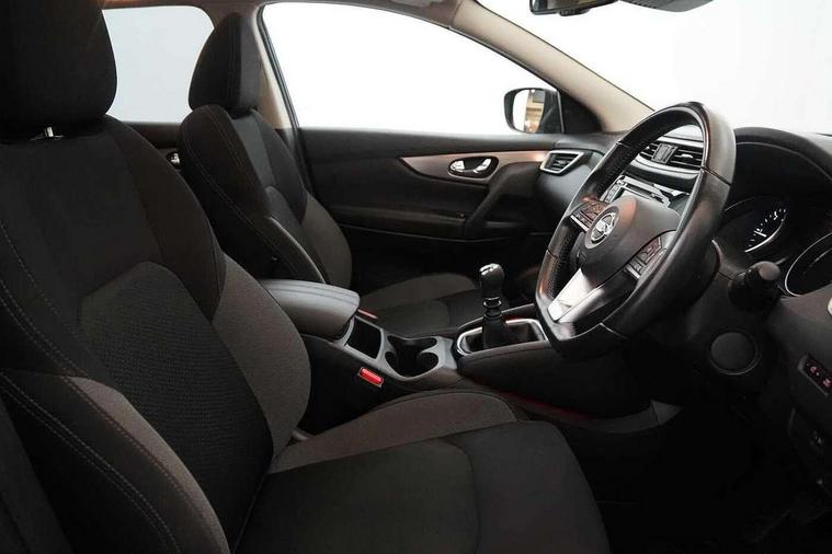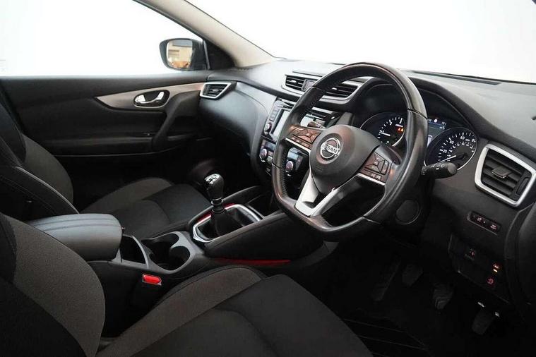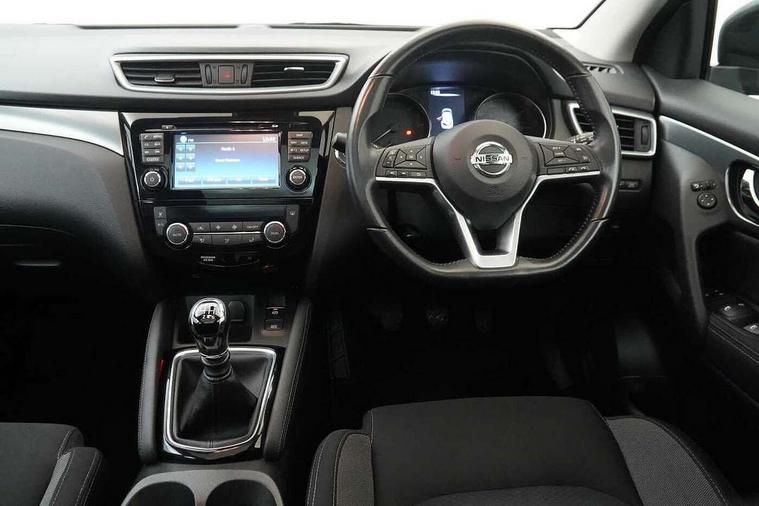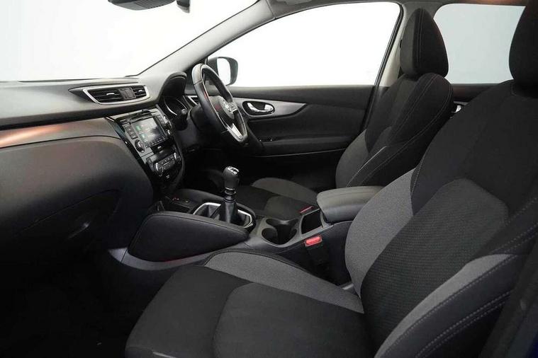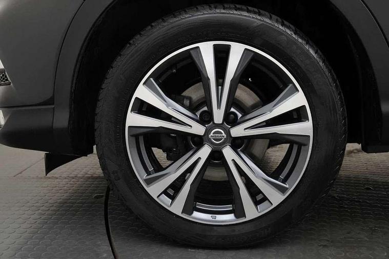5" TFT driver information centre, Around View Monitor, Bluetooth phone integration system, Cruise control, Electric speed sensitive power steering, Front and rear parking sensors, Lane departure warning system, Nissan connect sat nav system, Outside temperature display, Push button starter, Rear view camera, Service interval indicator, Speed limiter, Traffic sign recognition, Trip computer, Diesel particulate filter, 'Shark fin' mobile antenna, 6 speakers, DAB Digital radio, Radio/CD, Smartphone apps, Steering wheel mounted audio controls, USB/aux input socket, Automatic headlamp activation, Body colour bumpers, Body colour door handles, Body colour door mirrors, Chrome window surround, Electric folding and heated door mirrors, Front fog lights, High beam assist, Interior mirror with auto anti dazzle, LED indicators in door mirrors, Matt silver roof rails, One touch electric front/rear windows, Privacy glass, Rain sensor windscreen wipers, Rear roof spoiler, Rear wiper, 2 X front 12v power sockets, 60/40 split folding rear seat, Ambient interior lighting, Centre console with armrest, Chrome interior door handles, Cloth upholstery, Configurable luggage board system, Driver + front passenger lumbar support, Dual zone climate control, Front and rear door pockets with bottle holders, Front headrests, Front seat belt pre-tensioners with load limiters, Height adjustable driver's seat, Height adjustable passenger seat, Illuminated electric window switch, Isofix child seat preparation, Leather gearknob, Leather interior door handles, Leather knee rest, Leather steering wheel, Luggage compartment lighting, Parcel shelf, Pollen filter, Rake/reach adjustable steering wheel, Rear armrest with 2 cupholders, Rear headrests, ABS, brake assist and EBD, Child locks on rear doors, Curtain airbags, Driver/front passenger airbag, Electronic parking brake, ESP + traction control, Forward emergency braking, Front passenger airbag deactivation, Height adjustable front seatbelts, Hill start assist, Seatbelt warning, Side airbags, Three 3 point rear seatbelts, Tyre pressure monitoring system, Alarm, Immobiliser, Intelligent Key, Remote central locking, Graphite interior trim, 18" Bi-colour alloy wheels, Tyre puncture repair kit,
