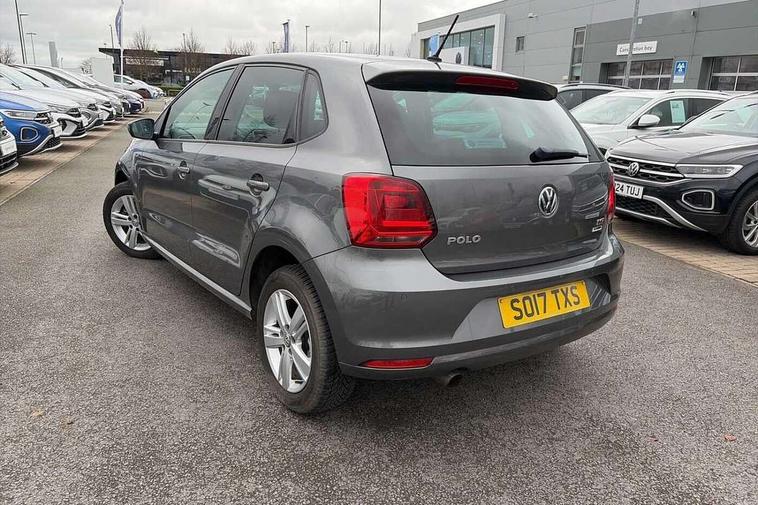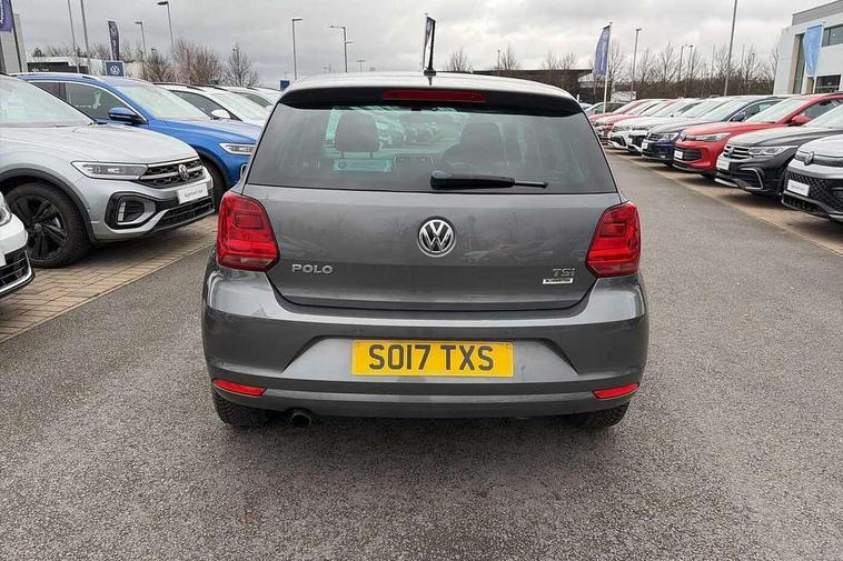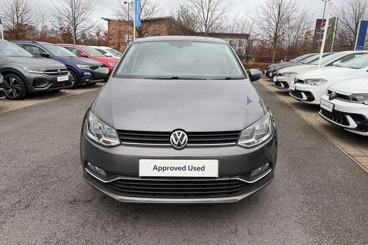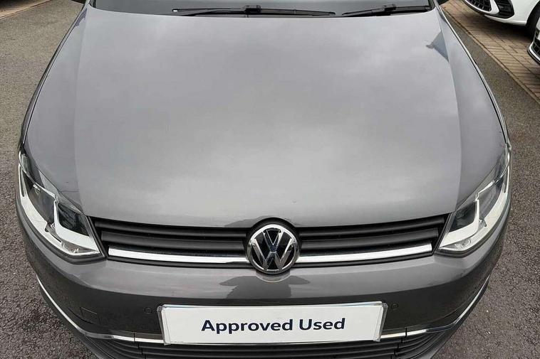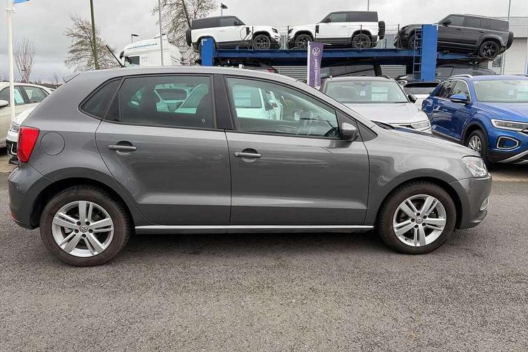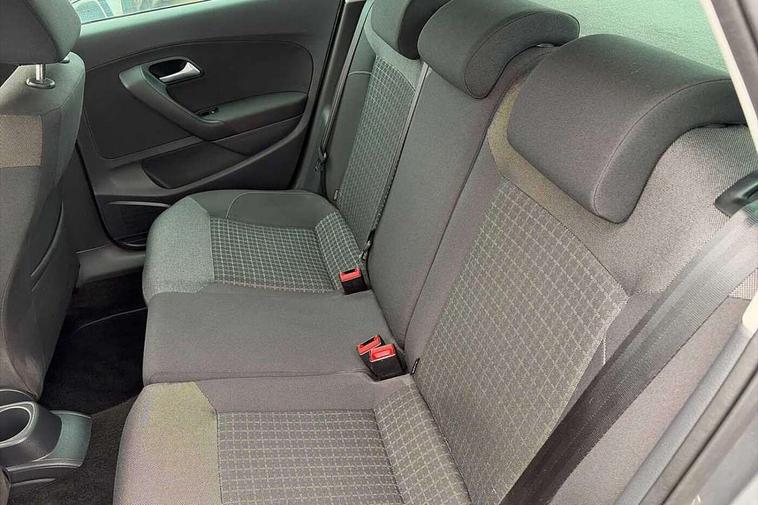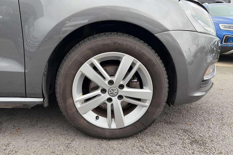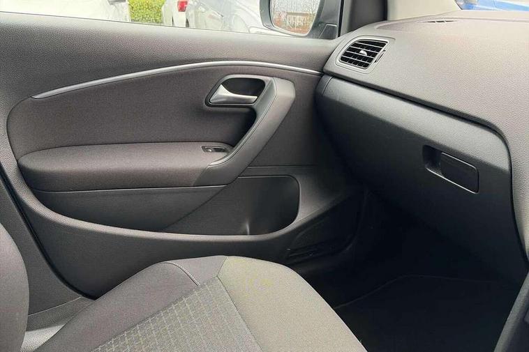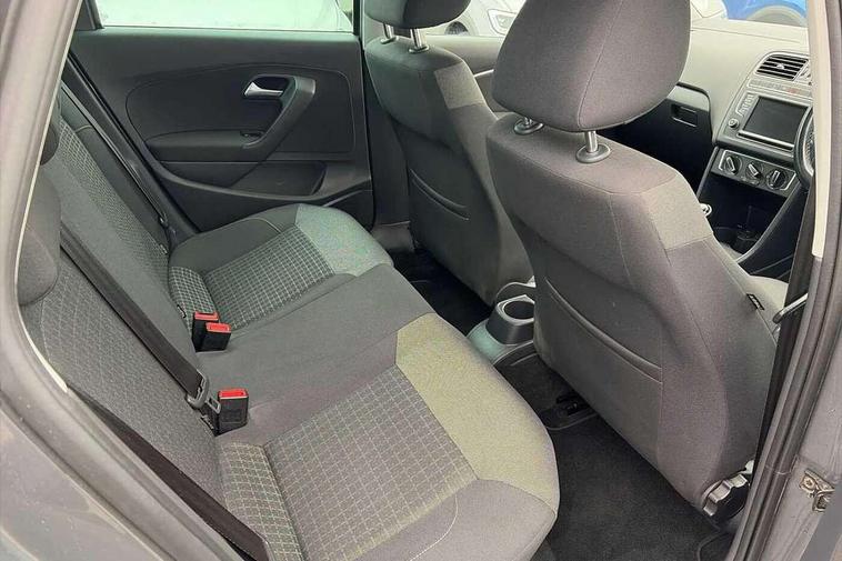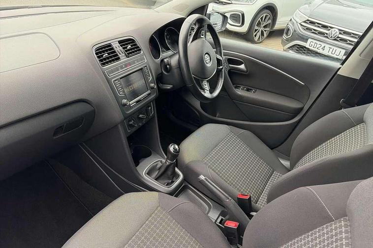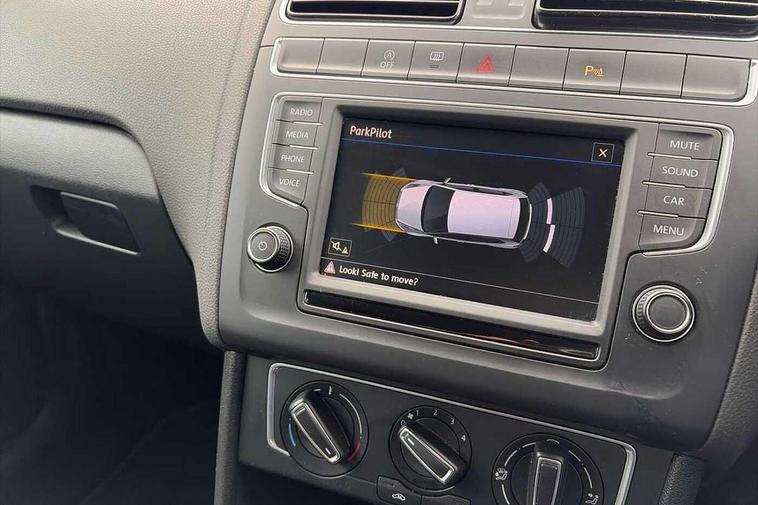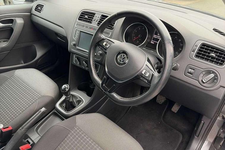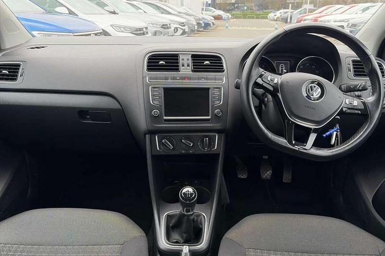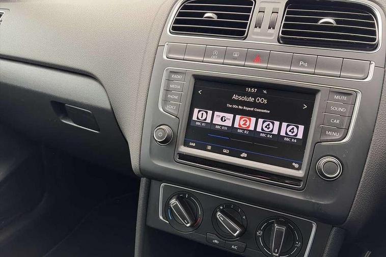 App-Connect, Bluetooth Telephone preparation, Driver alert system, Multi function display, Multifunction computer, PAS - speed related, Service interval indicator, Ultrasonic front and rear optical and audible parking sensors, Warning buzzer and light for front seatbelts unfastened, 6 speakers, Composition media system with radio, glovebox mounted CD, colour touch screen, SD card, aux-in, USB, multimedia interface, DAB Digital radio, Black grille with chrome surround, Body colour bumpers, Body colour door handles, Body colour door mirrors, Body coloured side sills, Chrome trimmed front air intake surrounds, Electric folding door mirrors, Electric front windows, Electric operated/heated door mirrors, Front fog lights with static cornering function, Front wash/wipe with interval delay, Heat insulated tinted glass 65% light absorbing from B pillar back, Heated rear window with auto timer, Rear electric windows, Rear windscreen washer and wiper with interval delay, 12V power socket in centre console, 2 bag hooks in luggage compartment, 2 cupholders, 3 rear head restraints, 3 spoke steering wheel, 4 grab handles, 60/40 split folding rear seat, Centre console storage, Chrome interior door handles, Driver and passenger sunvisors, Driver seat height adjust, Dust/pollen filter, Front door pockets, Front passenger seat height adjust, Front seat backrest storage nets, Front/rear reading lights, Glovebox, Height/reach adjustable steering column, Illuminated vanity mirror, Interior light with delay, Isofix Preparation 2 Rear child seats, Luggage compartment cover, removable, Luggage compartment lighting, Matt chrome gear lever gaiter surround, Multifunction leather steering wheel with leather gear knob/handbrake grip, Storage compartment in front doors, Storage compartment in rear doors, Sunglasses holder, Variable boot floor, Light and sight pack - Polo, 3 point height adj front seatbelts + pretensioners, 3x3 point rear seatbelts, ABS, Automatic post collision braking, Driver/front passenger airbag, Driver/Passenger whiplash optimised head restraints, ESC - Electronic Stability Control + traction control, ESP with EDL + ASR, Hill hold control, Hydraulic Brake Assist (HBA), Tyre pressure monitoring system, Alarm with remote central locking and interior protection, Electronic engine immobiliser, Air vents in Matt chrome, Matt chrome interior trim, 15" steel spare wheel,