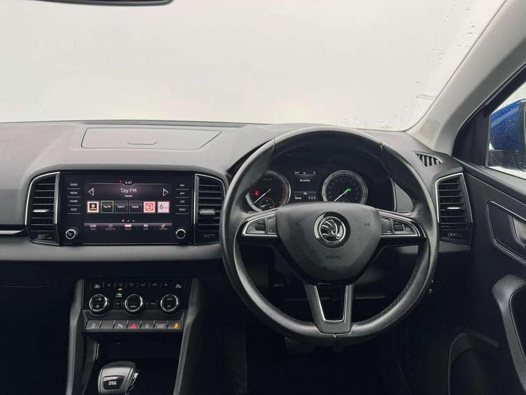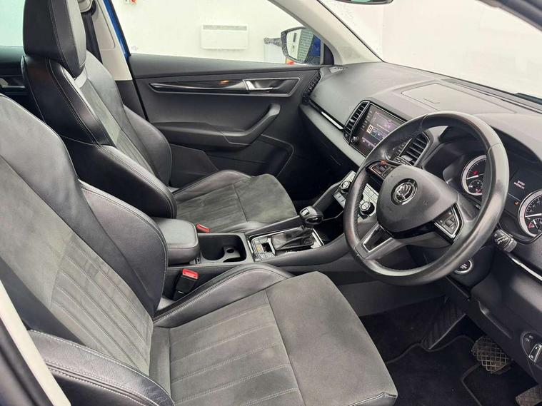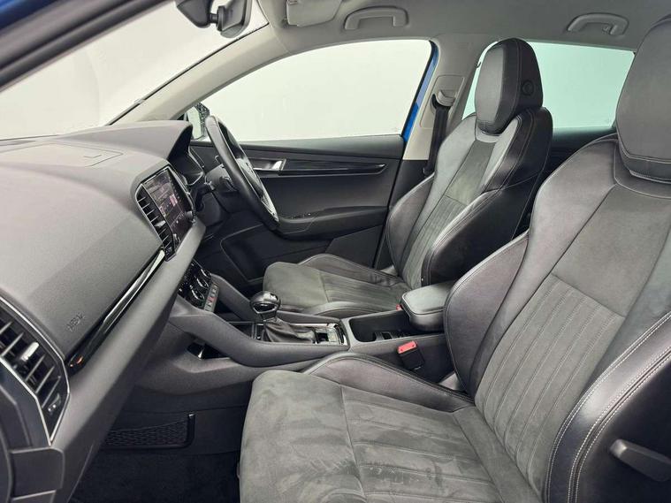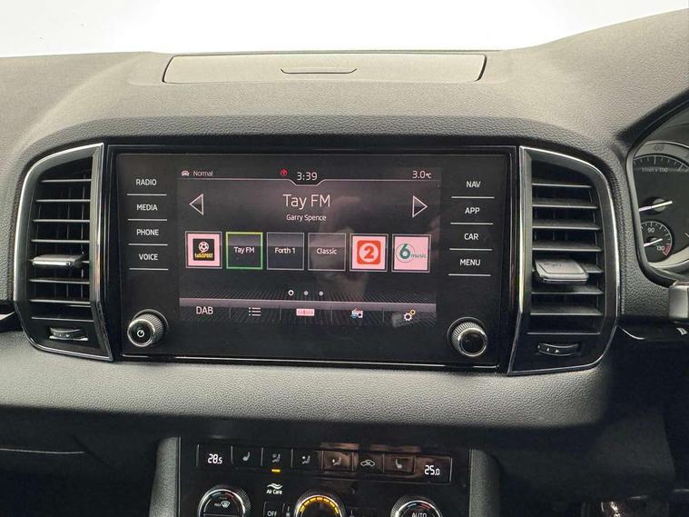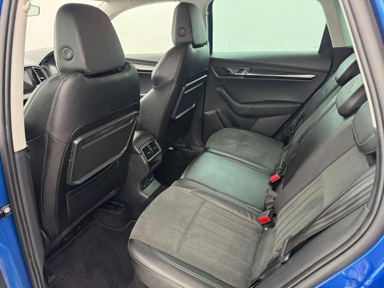 Drive mode selector, Driver alert system, Driver fatigue sensor, Driver profile selection, Multifunction colour trip computer, Outside temperature gauge, Rear view camera, Service interval indicator, Start/stop system with regenerative braking, DAB radio with Bluetooth, SD card slot, USB connection, Acoustic glass, Aero front windscreen wipers with intermittent function, Automatic headlight control system, Black electric window control buttons, Body colour door mirrors and handles, Body coloured bumpers, Electric front and rear windows with child proof lock, Full LED headlights + adaptive front light system + LED daytime running lights and front cornering fog lights, Headlight washers, Heated rear windscreen, LED rear lights with high functionality, Light assistant (coming/leaving home/tunnel light), Privacy glass, Safety reflectors on front doors, Third brake light, 1.5 litre bottle holders in driver and front passenger door panels, 12V socket in boot, 12v socket in front centre armrest with storage compartment and rear air vents, 2 Folding hooks and nets in boot, 2 Front readings lights for driver and passenger, 3 rear height adjustable headrests, 4 foldable roof handles with rear coat hooks, 4 lashing points on luggage floor, Backrest release, Cargo elements in boot, Chrome inner door handles, Dual zone climate control, Folding tables on the front seat backrests, Front seat and rear pockets, Height adjustable front three point seats belts with tensioners, Height adjustable passenger seat, Height/reach adjust steering wheel, Ice scraper, Illuminated and cooled glovebox, Illuminated luggage compartment, Isofix child seat preparation outer rear, Net programme in boot, Pen holder, Pollen filter, Rear boot cover, Rear reading lights, Rear seats fixed folding and divided 60:40, Removable LED torch in the boot, Retractable parcel shelf attachable to tailgate, Safety vest holder, Storage box in upper central dashboard closed, Storage compartment below the passenger seat, Sunvisors with illuminated vanity mirrors, Textile floor mats, Umbrella under passenger seat, VarioFlex seats with retractable parcel shelf, Chrome roof rails + chrome pack - Kodiaq, Airbags - Front side, head, knee and curtain, Automatic door unlocking in case of crash, Automatic fuel cut off in case of crash, Driver airbag, Electronic parking brake with auto hold function, Emergency rear braking signal, ESC including ABS, MSR, ASR, EDS, HBA, DSR, RBS, MKB and traction control, Front assist radar scanning of the space in front of the car with automatic braking, Hill hold control, Passenger airbag with switch-off function, Pedestrian monitor, Seatbelt reminder signalisation and pretensioner for all seats, Three point seatbelts rear, Two tone horn, Tyre pressure display, Tyre pressure monitor, Alarm with interior monitoring, back up horn and tilt sensor with safe function, Electronic engine immobiliser, Keyless entry and keyless start with safe system, Remote central locking with 2 remote folding keys, Chrome framed air vents, Storage on wheel cover,