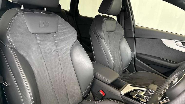 Audi connect safety and service (e-call), Audi drive select, Audi smartphone interface, Audi virtual cockpit, Automatic start-stop system with coasting functionality and efficiency programme, Bluetooth interface, Camera based traffic sign recognition, Electromechanical power steering, Email, calendar and text messages displayed via MMI, Front and rear parking sensors, Lane departure warning, MMI Navigation plus with MMI touch includes 10.1" high resolution colour MMI display, 3D map, Power operated tailgate, Rear view camera, Voice control system, 54 litre fuel tank, Sports suspension lowered by 23mm, 2 USB charging ports, 8 passive loudspeakers, DAB digital radio reception, Aluminium roof rails, Auto dimming rear view mirror, Body colour door handles, Body colour front spoiler lip, Body colour side sill trim, Body coloured door mirrors, Electric adjustable/heated/folding door mirrors with auto dimming, Grained matt black side air inlets with matt aluminium silver inlay, High beam assistant, Honeycomb structure radiator grille in grained matt black, LED headlights with LED rear lights + dynamic rear indicators + headlight adjustment and high beam, turning light + LED daytime running lights, LED third brake light, Matt aluminium silver tailpipe trim, Privacy glass, Rain and light sensors, Rear side wing doors, Rear wiper, S Line badges on the front wings, S line front and rear bumpers with side skirts, S Line rear diffuser in matt anthracite black with trim strip in matt aluminium silver, S Line roof edge spoiler, Variable intermittent front wash/wipe, Windscreen with acoustic glazing, 3 spoke high multi-function sports leather steering wheel grips in perforated leather with S badging including paddle shift, 4 way electric lumbar support for driver and front passenger, 40/20/40 split folding 3 rear seat bench in 3 parts with rear centre armrest, Black carpets, Black cloth headlining, Black perforated leather gearknob, Contrast stitching on seats, steering wheel and gear lever gaiter, Deluxe 3 zone electronic climate control, Electric load area cover, Front and rear head restraints, Front centre armrest, Heated front seats, Illuminated door sill trims with S logo, ISOFIX child seat mounting and top tether, Manual seat adjustment, Single front passenger seat, Stainless steel pedals and foot rest, High gloss package - A4, LED Interior light pack - A4/S4, 3 rear seatbelts, 6 airbags - Driver, front passenger, curtain and side windows, Attention and drowsiness assist, Electronic Stabilisation Control (ESC) including ABS, ASR and EDL, Hill hold assist, Multi collision brake assist, Pop-up bonnet for pedestrian protection, Pre sense city, Rear door child safety locks, Seatbelt monitoring, Warning triangle and first aid kit, Anti theft alarm, Anti theft wheel bolts, Central locking, Keyless Go, Matt brushed aluminium inlays, Tool kit, Tyre repair kit,