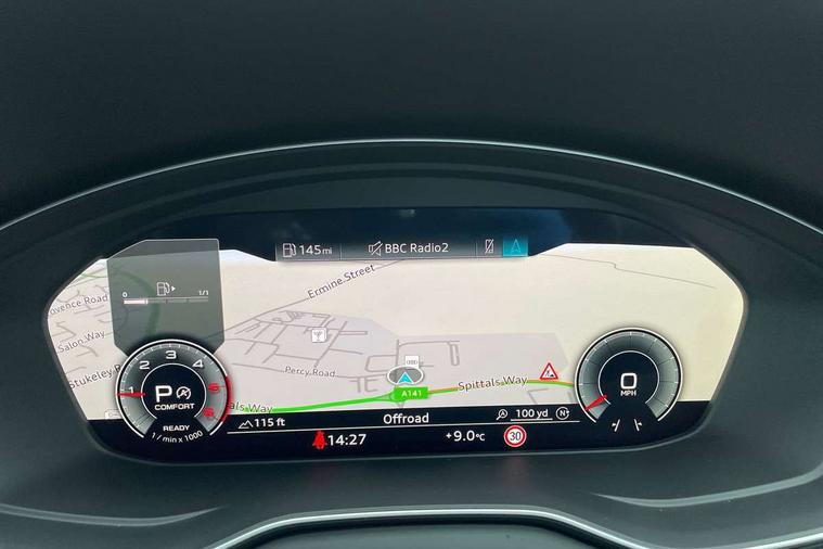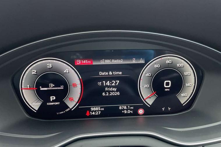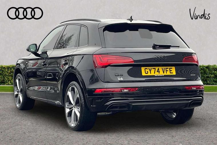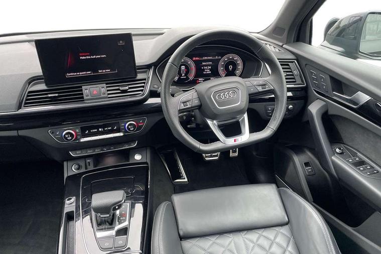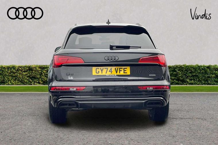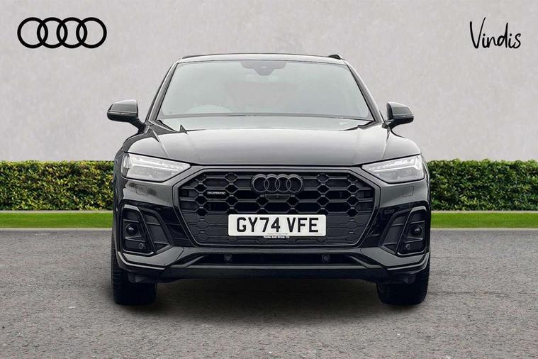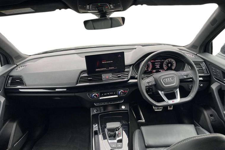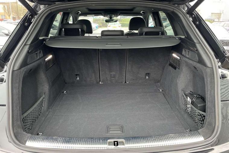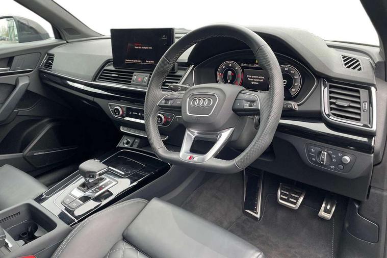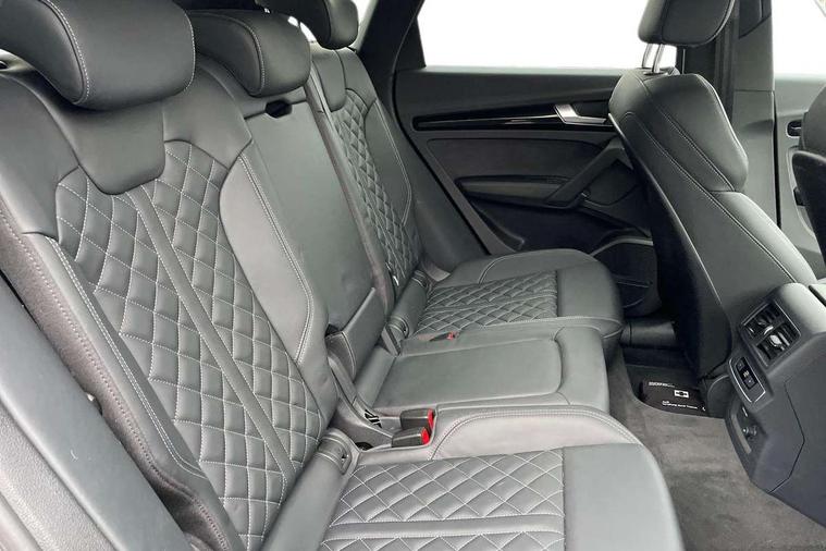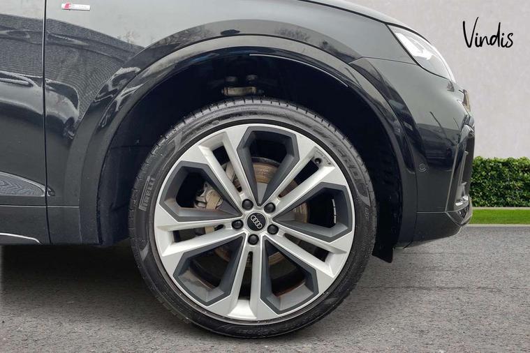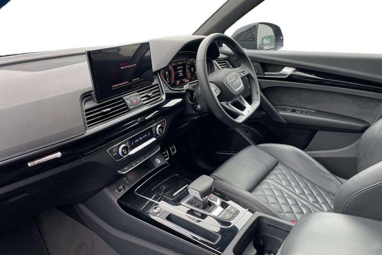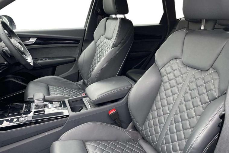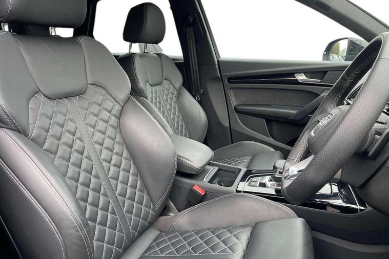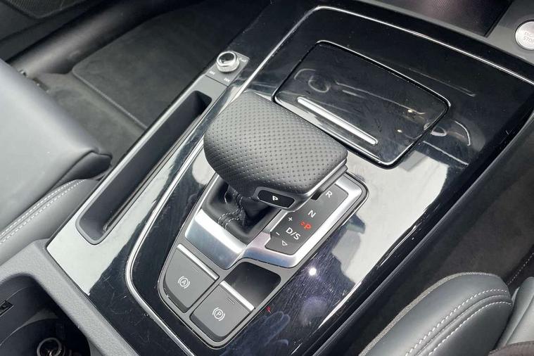 Acoustic front and rear parking sensor, Audi connect safety and service (e-call), Audi drive select, Audi virtual cockpit plus with 12.3" screen and three different layout designs, Audi wireless smartphone interface, Automatic start-stop system with coasting functionality and efficiency programme, Bluetooth interface, Camera based traffic sign recognition, Electro - mechanical power assisted steering, Lane departure warning, MMI navigation plus with 10.1" touch screen, Power tailgate, Reversing camera, Service interval indicator, Voice control system with Audi hotword activation "Hey Audi", Diesel particulate filter, Quattro on demand, S line sports suspension, 2 x USB charging port with aux input socket, 8 loudspeakers, DAB Digital radio, Acoustic windscreen, Auto dimming door mirrors, Auto dimming frameless rear view mirror, Automatic headlight adjustment, Automatic headlights and windscreen wipers, Black roof rails, Black styling with black rings, Body colour bumpers, Body colour rear diffuser with matt aluminium silver surrounds, Body colour underbody protection, Chrome plated exhaust trims, Daytime running lights, Door sills in Selenite silver, Electric adjustable/heated/folding door mirrors, Front air inlet surrounds in aluminium, Front and rear electric windows, Front radiator grille in honeycomb design, LED 3rd brake light, LED headlights and LED tail lights, Loading edge protection in stainless steel, Lower bumpers painted in contrast Manhattan grey, Rear chrome trim strip below lights, Rear privacy glass and rear side windows, Rear side wing doors, Rear wiper, Roof bars, S Line badges on the front wing panels, S Line front and rear bumpers, S Line rear spoiler, S Line side skirts, 3 rear headrests, Black cloth headlining, Comfort front centre armrest, Contrast stitching on seats, steering wheel and gear lever gaiter, Deluxe 3 zone electronic climate control, Front head restraints, Front sport seats with S embossed logo, Front/rear floor mats, Gear lever in black leather, Heated front seats, Height/reach adjustable steering column, Illuminated door sill trims with S logo, Luggage compartment cover, Manual seat adjustment with 4-way electric lumbar support, Single front passenger seat, Stainless steel pedals, Sunvisors with vanity mirrors, Top surface of the rear centre armrest in artificial leather, High gloss pack - Q5, LED interior light pack - Q5, 3 point seatbelts on all seats, 6 airbags - Driver, front passenger, curtain and side airbags, Attention and drowsiness assist, Electrically operated child locks on rear doors, Electromechanical parking brake, Electronic stabilisation control including ABS, ASR and EDL, First aid kit with warning triangle and vests, Front passenger airbag deactivation, Hill descent control, Hill hold assist, ISOFIX child seat mounting for front passenger seat and ISOFIX child seat mounting with Top Tether for outer rear seats, Multi collision brake assist, Pop-up bonnet for pedestrian protection, Pre sense city, Seatbelt monitoring, Tyre pressure warning, Anti theft alarm, Anti-theft wheel bolts, Remote central locking, Remote control key with SAFELOCK and keyless go, Air vents inserts and centre console in gloss black, Tool kit, Tyre repair kit,