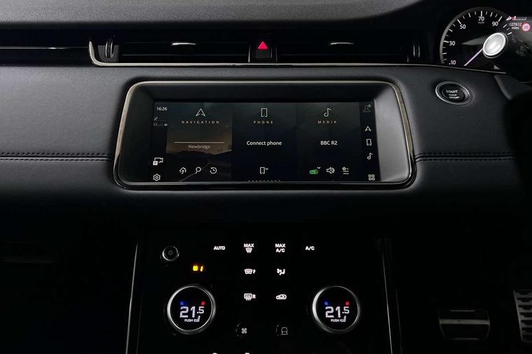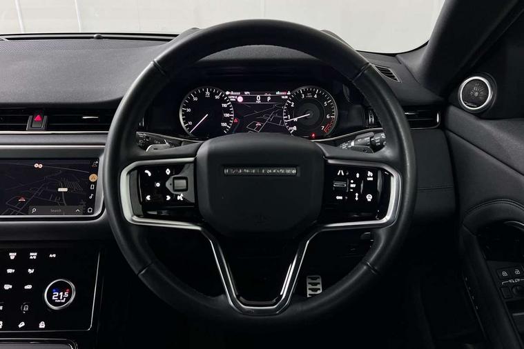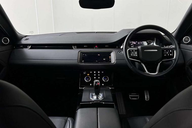 Adaptive cruise control, Android Auto, Apple car play, Blind spot assist, Bluetooth connectivity, Brake pad wear indicator warning light, Driver condition monitor, eCall emergency system, Electronic power assisted steering (EPAS), Front and rear parking aid, InControl remote, Land Rover InControl apps, Lane keep assist, Pivi pro connected includes upgraded infotainment, connected navigation pro, Nuance speech licence, Push button starter, Rear collision monitor, Rear traffic monitor, Traffic sign recognition with adaptive speed limiter, Voice control system, All terrain progress control, Efficient Driveline, Large fuel tank, Passive suspension, Terrain Response 2 Auto, Digital Audio Broadcast radio-DAB, Steering wheel mounted controls, Auto headlights, Automatic headlight levelling, Electric windows with one touch open/close and anti trap, Evoque and R-Dynamic badge, Flush deployable exterior door handles, Heated rear window with timer, Heated washer jets, Heated windscreen, Power fold, auto-dimming, heated door mirrors with approach lights and auto dimming driver side, Rain sensing windscreen wipers, Rear fog lights, Rear side wing doors, Rear wiper, Tailgate spoiler, Third brake light, 40:20:40 split folding rear seats with centre headrest and armrest, Ambient interior lighting, Bright metal pedals, Isofix system on outer rear seats, Overhead lighting console, Overhead stowage for sunglasses, Passive front head restraints, Rear air vents, Rear centre headrest, Rear head restraints, Satin chrome gearshift paddles, Single passenger seat, Sunvisors with illuminated vanity mirrors, Twin sliding front centre armrest, 3 rear 3 point seatbelts, Anti-lock braking system (ABS), Customer configurable autolock, DSC - Dynamic Stability Control, Electronic brake force distribution, Electronic parking brake, Electronic traction control, Emergency braking, Front and rear seatbelt reminder, Hill descent control, Hill launch assist, Low traction launch, Power operated child locks, Roll stability control, Six airbags - Driver and passenger airbags/driver knee airbag/front side airbag and curtain airbags, Torque vectoring brake, Tyre pressure monitoring system, Alarm, Immobiliser, Intrusion sensor, Keyless entry, Locking wheel nuts,