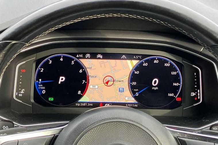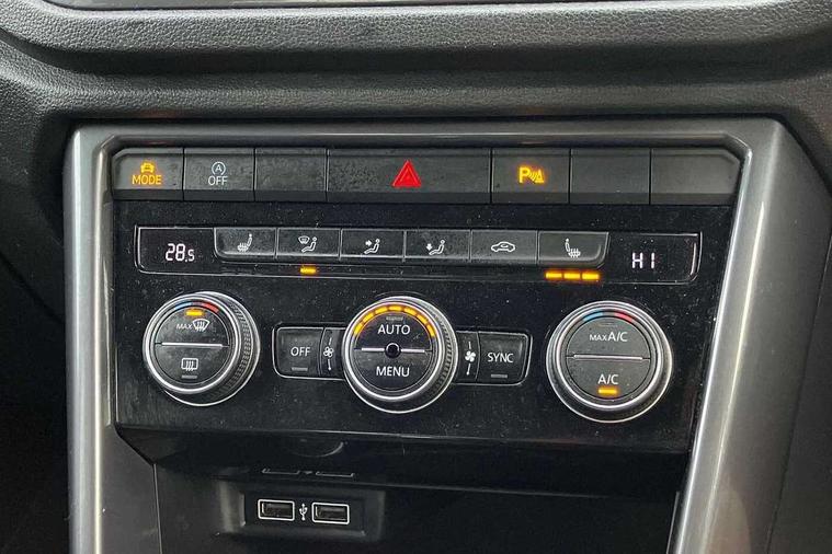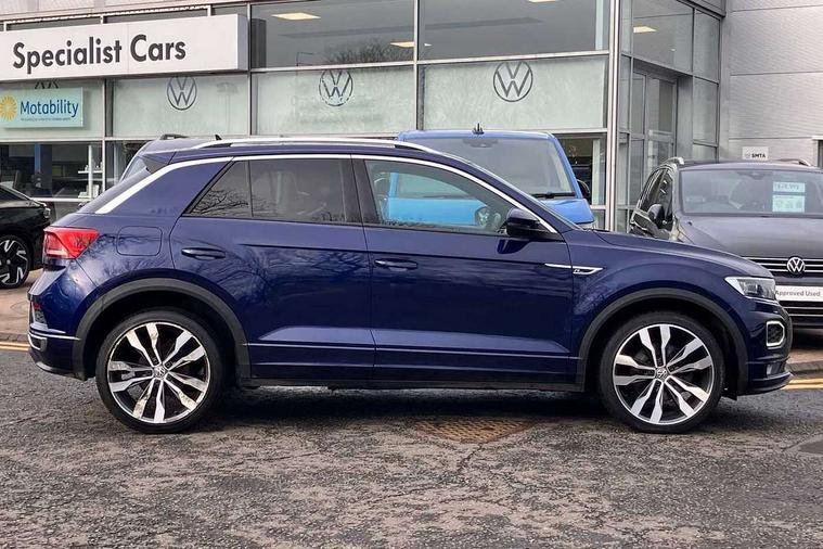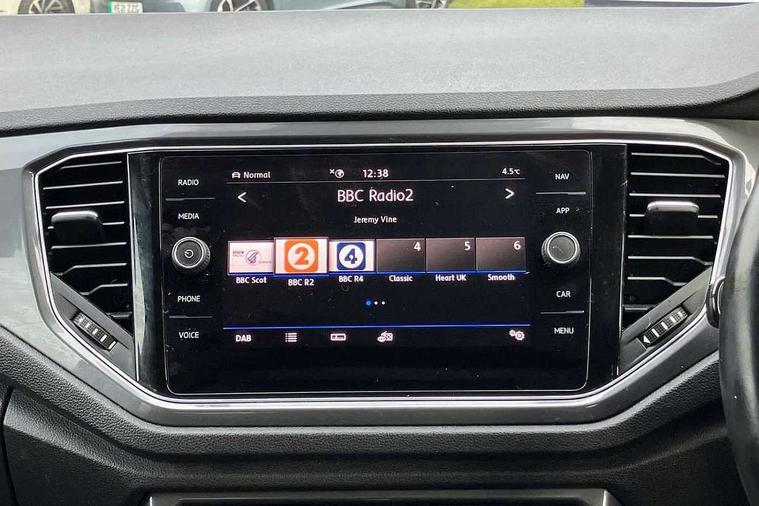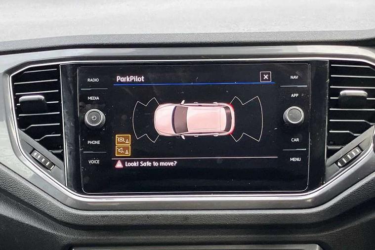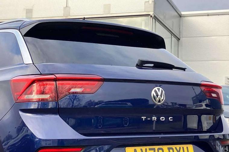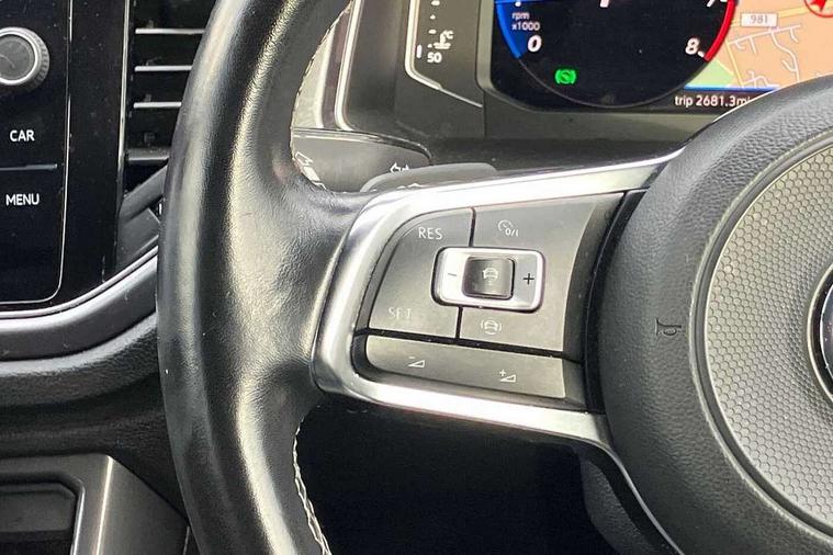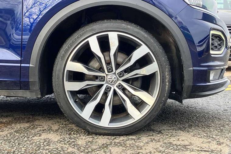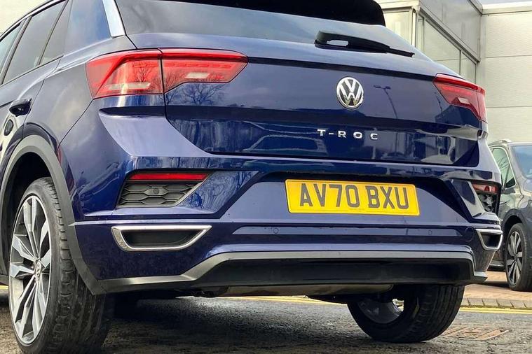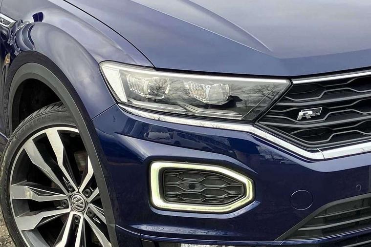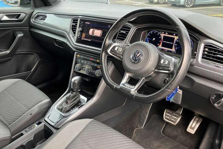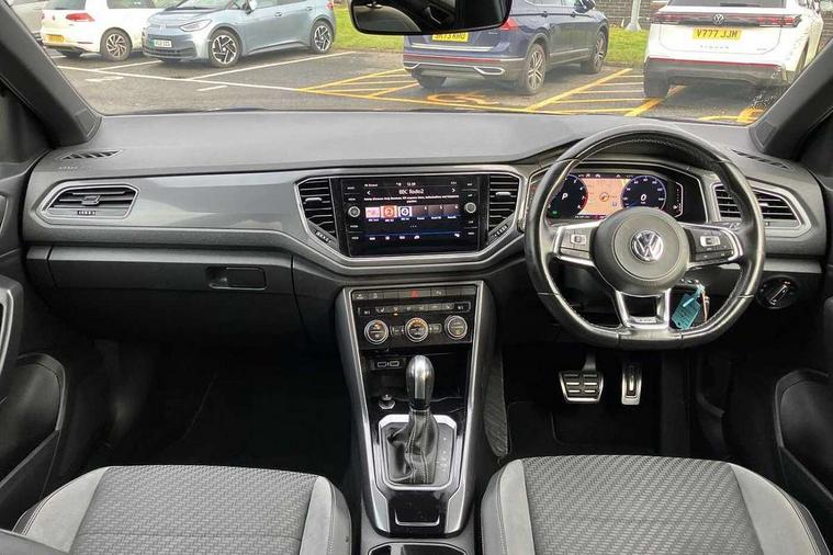 'Lights On' Reminder warning buzzer, Adaptive cruise control with front assist, radar sensor controlled distance monitoring, city emergency braking, Automatic start/stop system, Bluetooth telephone and audio connection for compatible devices, Car information display, Digital Cockpit Pro - Active info display, Discover navigation including 8" touch screen display, streaming and internet, Driver alert system with audible and visual fatigue detection system, Driver tips and journey analysis, Lane assist with warning text instrument cluster, Modified key software - reduce switch off time for key status change to Long no motion, Multifunction computer with visual gear change recommendation for fuel consumption, Service interval indicator, Think blue trainer driver tips and journey analysis, Voice activation, Wireless app connect for apple carPlay, Battery regeneration during braking, Centre arm rest including USB type C interface and USB charging socket, DAB Digital radio, Diversity antenna for FM reception, Front USB type C Interface 2X and USB charging socket, Music playback - MP3, WMA and AAC files, Premium USB cable in choice of either Apple or Android smartphone compatibility, SD card slot, Simultaneous pairing of 2 compatible mobile devices, SMS functionality - read, compose and send SMS messages using touch-screen display, Storage compartment with longitudinal and height adjustable in armrest and two rear air vents, Three route options - Fast, Short, Eco, Title and cover art display, Auto dimming interior rear view mirror, Black grained lower door protectors, Body colour door handles, Body colour rear roof spoiler, Chrome effect left and right trapezoid exhaust tailpipe fascia surround, Chrome trim on upper and lower radiator grille, Dusk sensor, Electrically foldable, adjustable and heated door mirrors with puddle lights and reverse activated kerb-view adjustment on passenger's door mirror, Front and rear electric windows, Front fog lights with static cornering function, Front windscreen wiper with intermittent wipe and 4 position delay, Fully galvanised body, Heated rear window, High level 3rd brake light, LED darkened rear light clusters, LED rear number plate lights, Manual coming/automatic leaving home lighting function, Rain sensor, Rear tinted glass from B-pillar backwards approx 65% tinted, Rear wash/wipe with intermittent wipe setting, Volkswagen roundel, 2 Front and rear reading lights incorporating LED technology, 3 rear head restraints, 4 load lashing points in luggage compartment, Aluminium pedals, Ambient lighting in front footwell and light strips below trim in front doors, Black roof lining and sun visors, Branded points of interest, Carbon flag cloth upholstery, Climate control - 2 zone electronic air conditioning with automatic air recirculation and allergy filter, Drawer under drivers seat, Front + rear carpet mats, Front cupholders x 2, Front seat back storage pockets, Front sports seats with R-Line logo on seat backrest, Glovebox, Height adjustable front seats, Height/reach adjust steering wheel, Illuminated vanity mirrors, Instrument lighting, white adjustable panel illumination, Interior light delay, Isofix easy fit child seat preparation for 2 outer rear seats, Load through provision with single cup holder when folded down, Luggage compartment cover, removable, Luggage compartment lighting, R Line badge, Split folding rear seat backrests with centre armrest, Storage compartment in left and right luggage area, Storage compartment in rear doors, Storage compartments in driver and front passenger doors, Three spoke multi function leather trimmed steering wheel and gear knob including paddle shift, Unique R Line door sill protectors, R line styling pack - T-Roc, 3 rear three point seatbelts, ABS, Curtain airbags, Driver and front passenger safety-optimised head restraints, Drivers and front passengers airbags with passengers deactivation switch, Drivers seatbelt reminder, Electronic parking brake with auto hold, Electronic stability control (ESC) includes ASR, EDL, EDTC and trailer stabilisation function, Front seat side impact airbags, Predictive pedestrian protection, Rigid safety cell with front and rear crumple zones, Three point height adjust front seatbelts + pretensioners, Tyre pressure loss indicator, Ventilated front and rear disc brakes, Volkswagen roadside assistance, Alarm with remote central locking and interior protection, Electronic engine immobiliser, Remote central locking with 2 remote folding keys, Shadow steel decorative inserts in dash and door panel, 19" Suzuka alloy wheels with low rolling resistance tyres and anti wheel bolts,